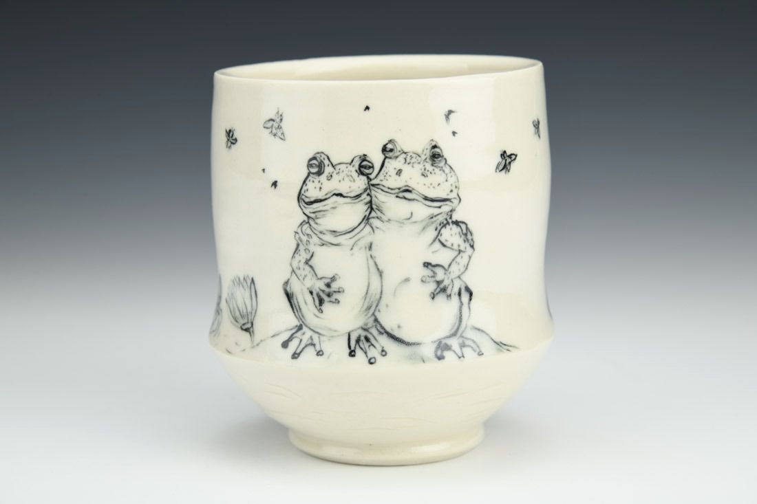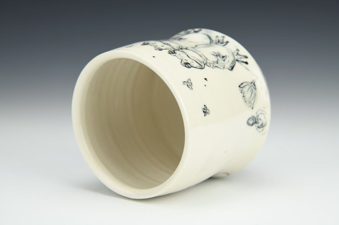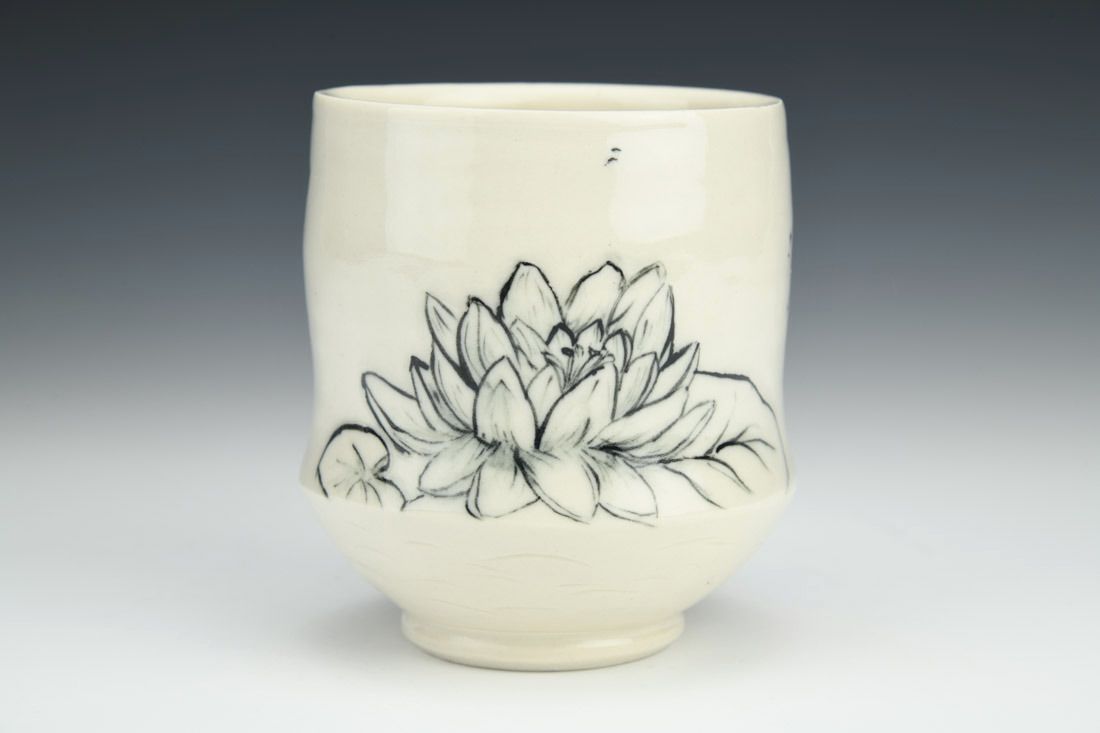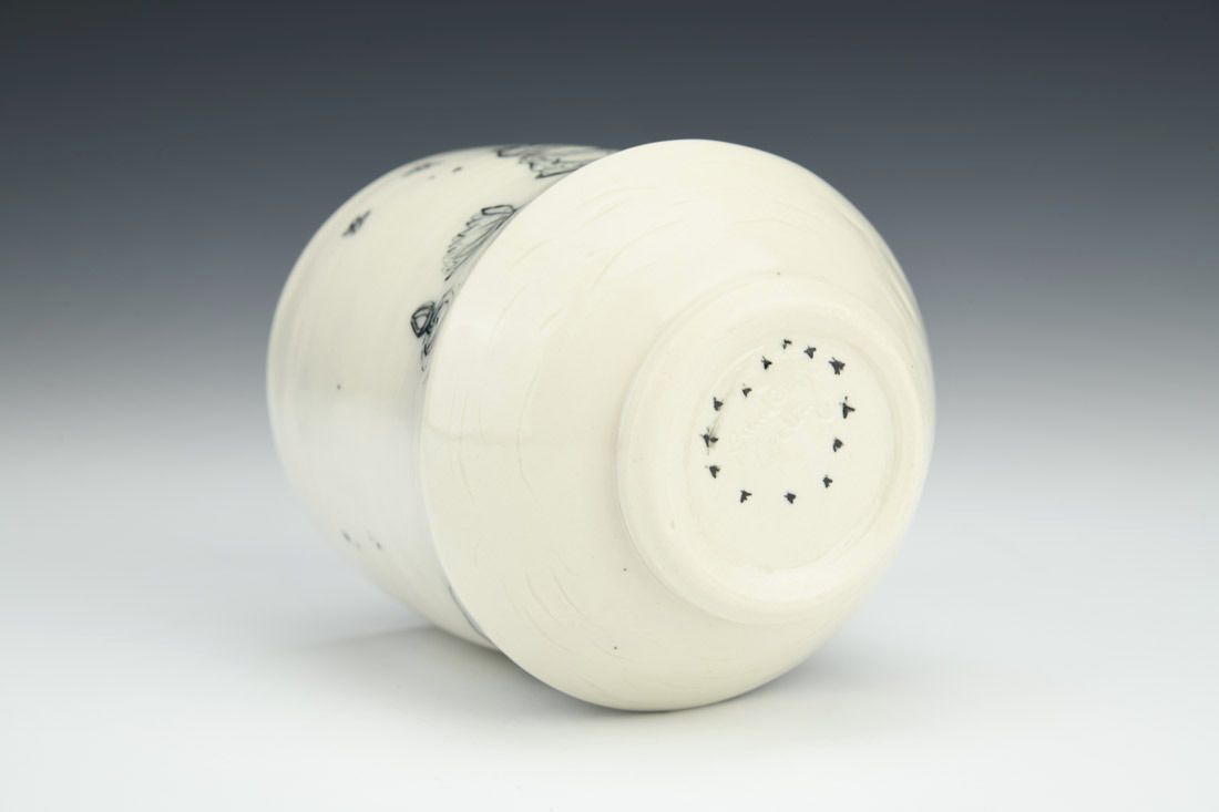 Porcelain, wheel thrown and altered, carved, painted underglaze, clear glaze, cone 6 electric fired, 4 x 3.5 x 3.5 inches.