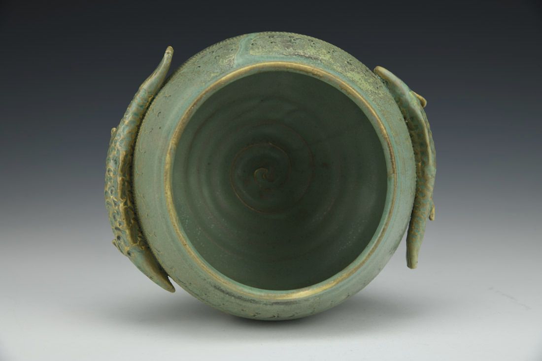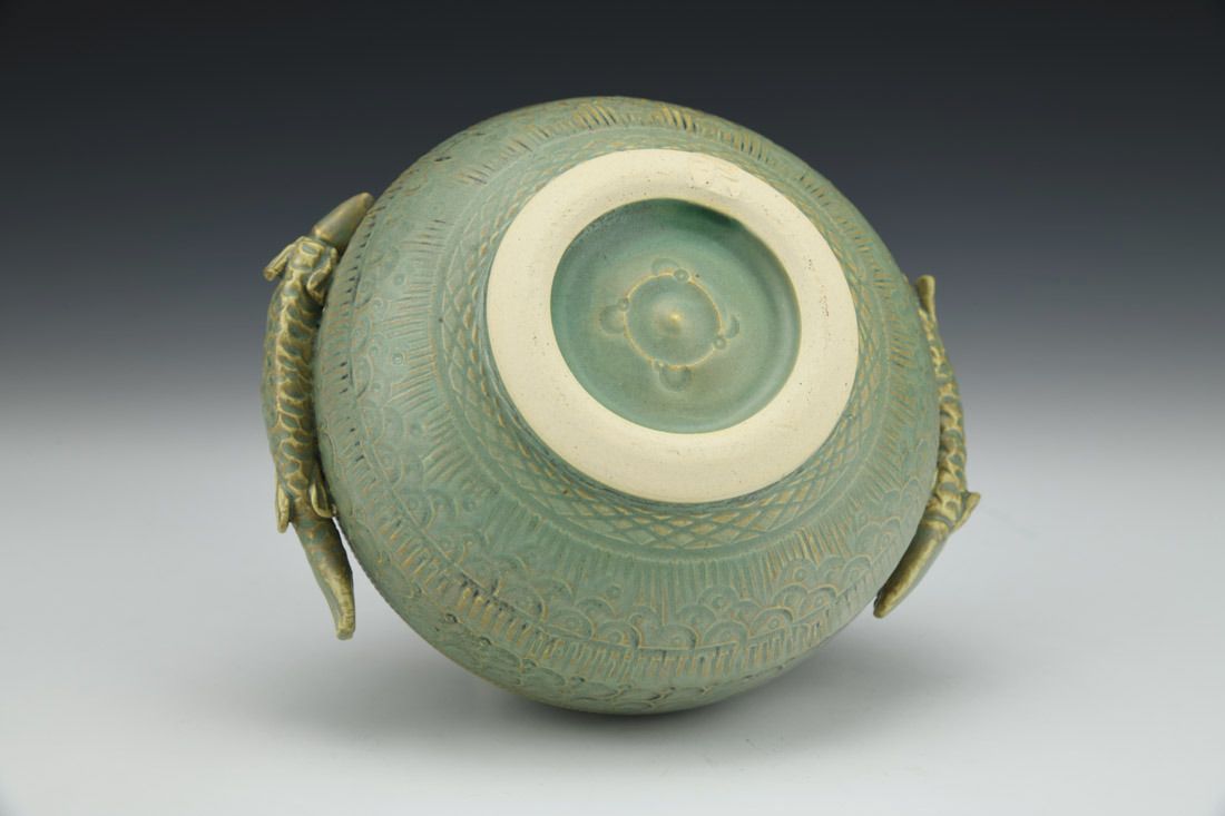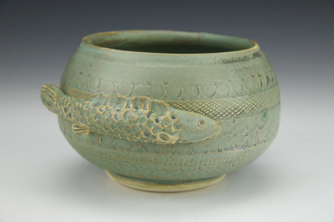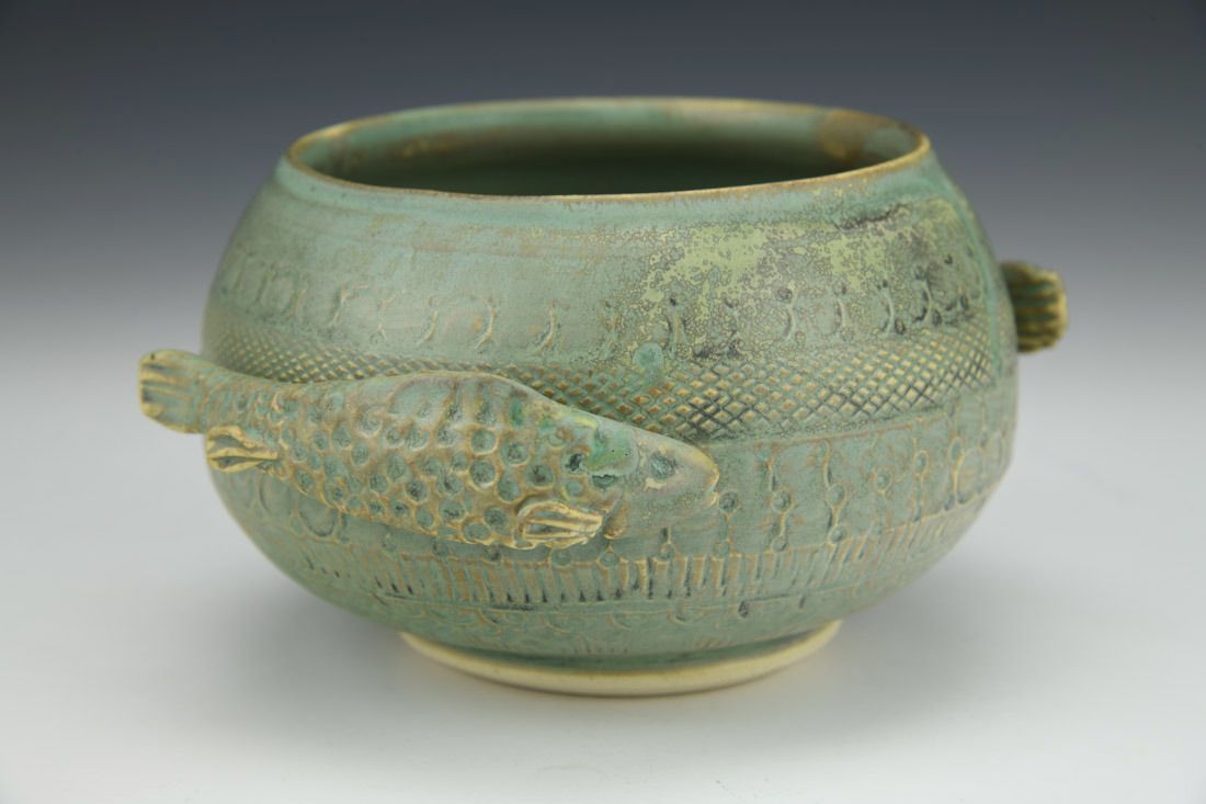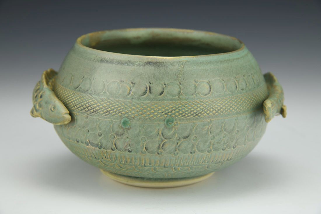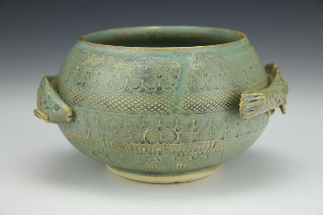 White stoneware, wheel thrown and hand built, stamped, cone 6 neutral fired, 3.25 x 5.75 x 5 inches.