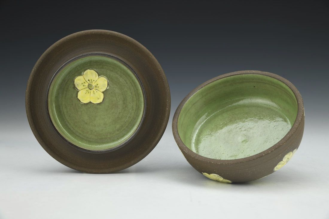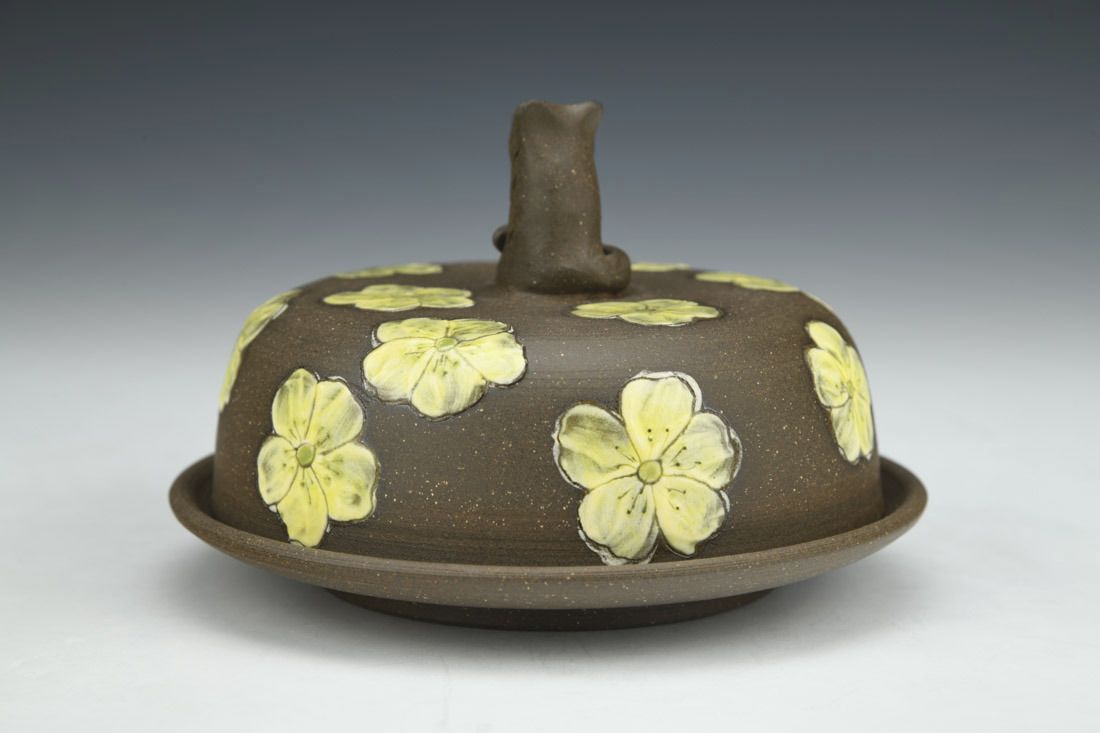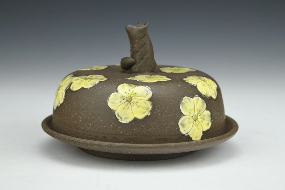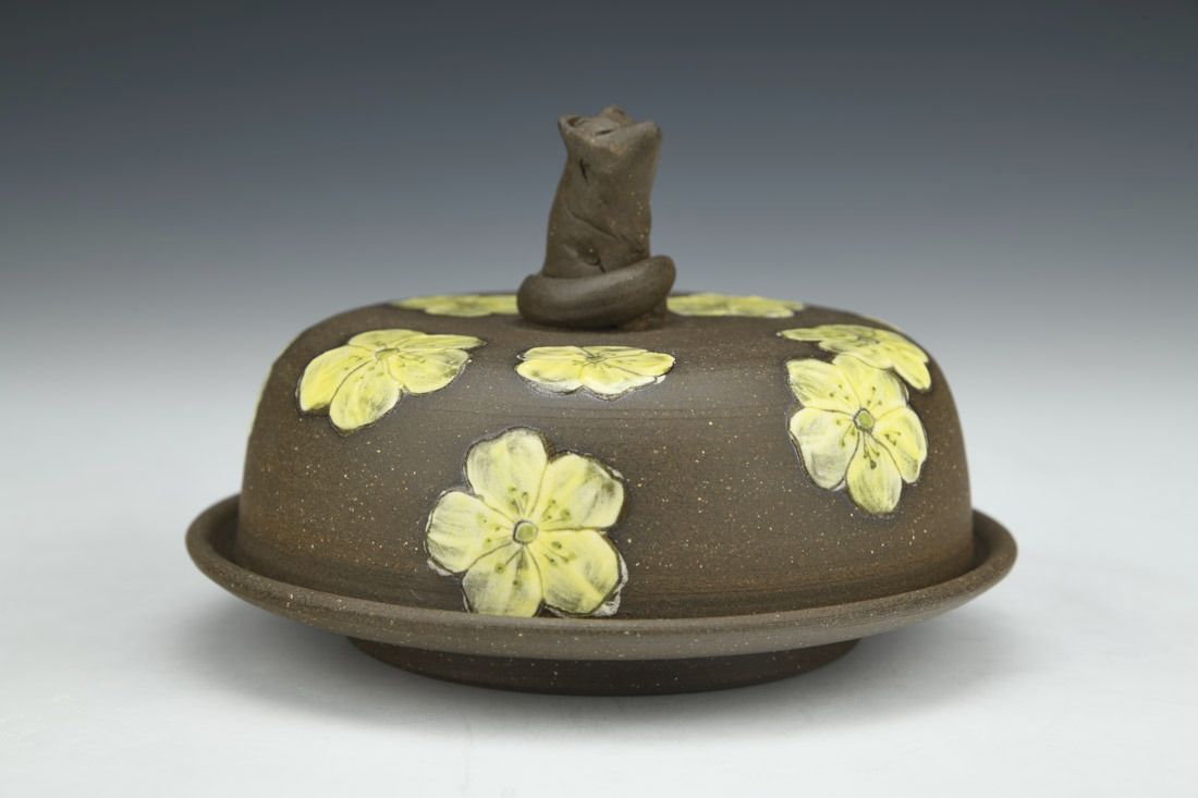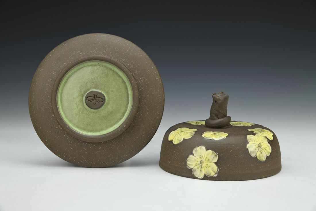 Stoneware, wheel thrown with sculptural elements, underglaze, glaze, cone 5 electric fired, 3.5 x 5 x 5 inches.