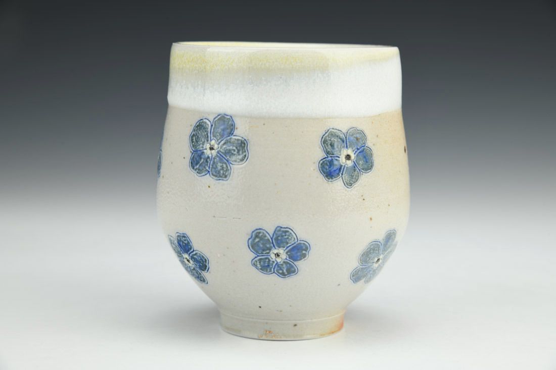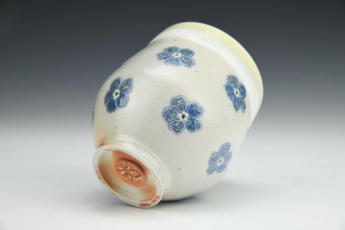 Stoneware, wheel thrown, slip, underglaze, glaze, cone 10 woodfired, 3.75 x 3.75 x 3.75 inches.