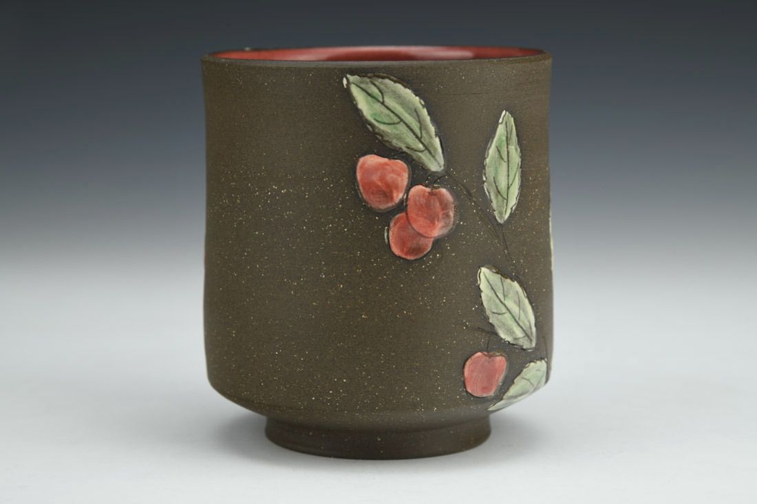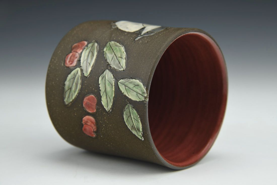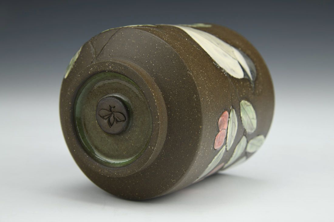 Stoneware, wheel thrown, slip, underglaze, glaze, cone 5 electric fired, 3.5 x 3 x 3 inches.