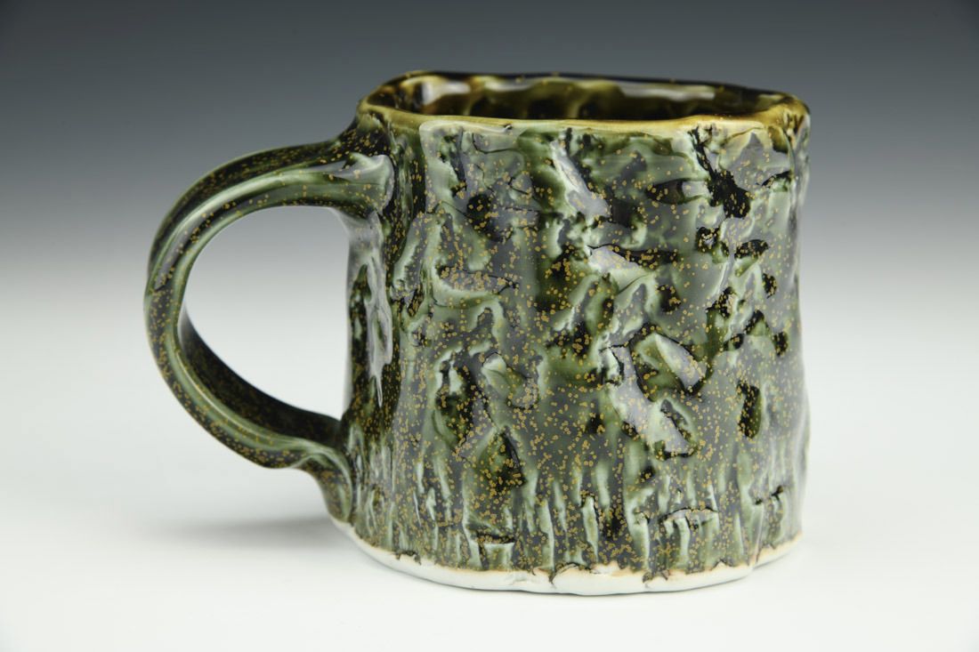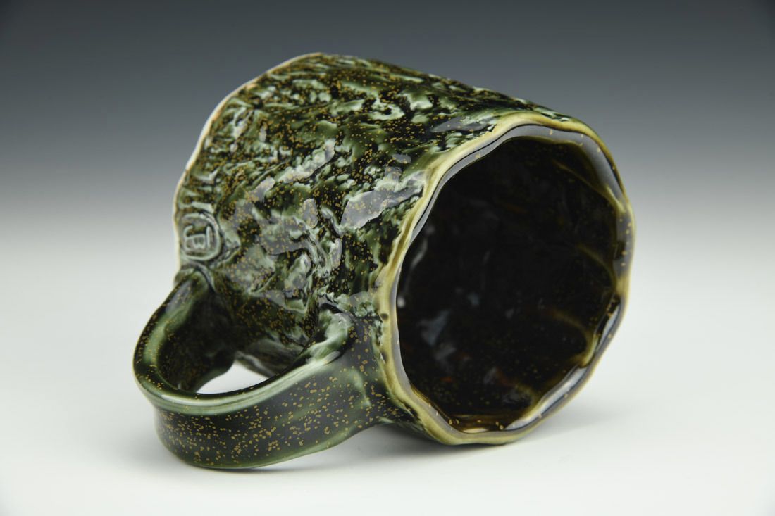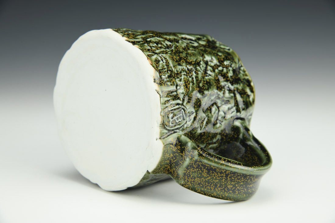 Porcelain, wheel thrown, stamped, cone 10 reduction fired, 3.5 x 5 x 3.5 inches.