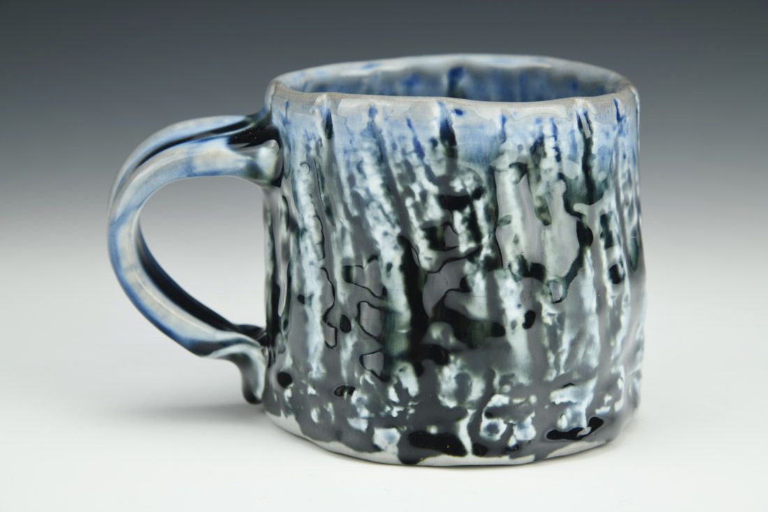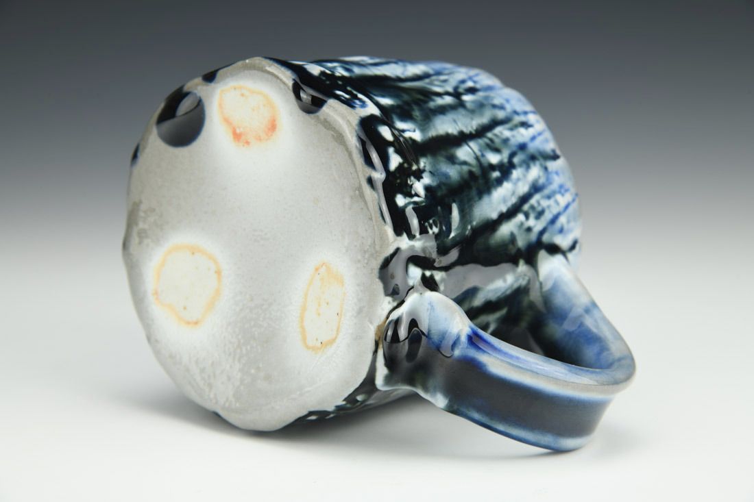 Porcelain, wheel thrown, stamped, cone 10 soda fired, 3.5 x 5 x 3.5 inches.