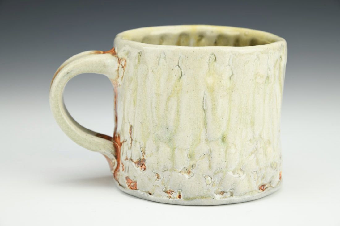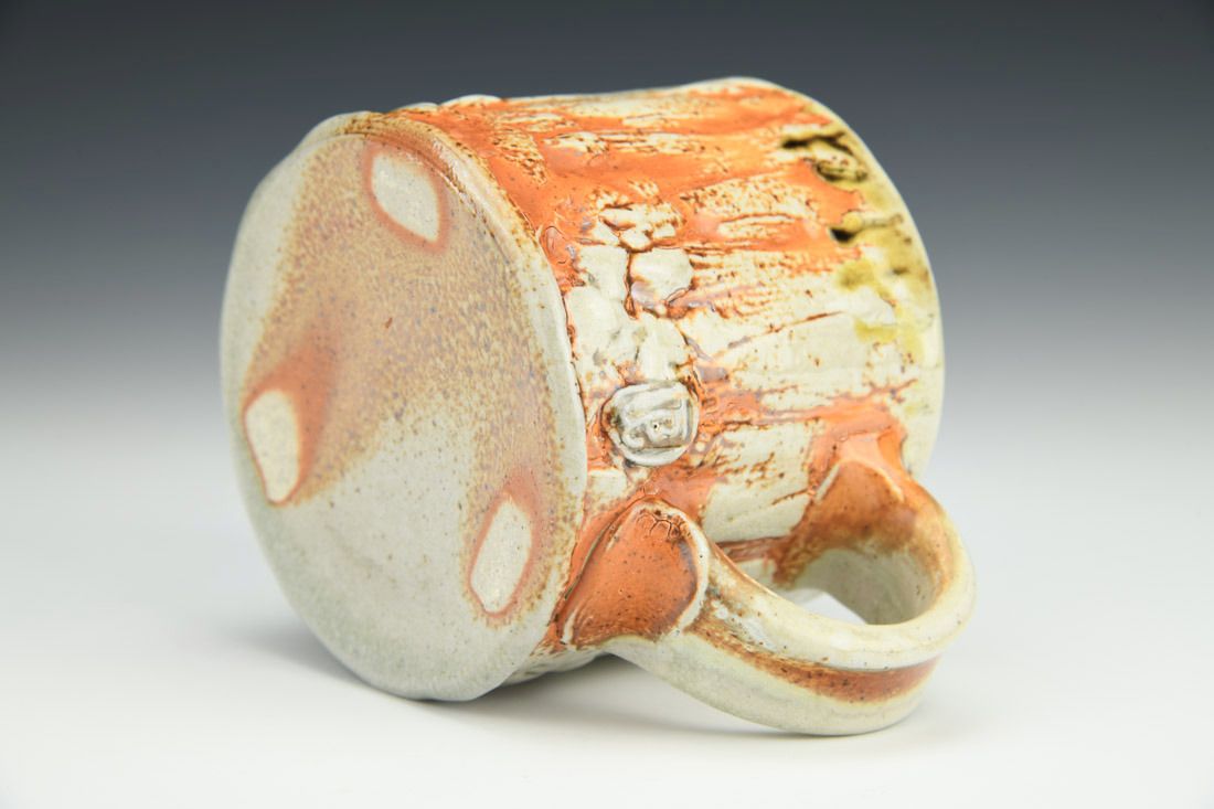White stoneware, wheel thrown, stamped, cone 10 soda fired, 3.5 x 5 x 3.5 inches.
