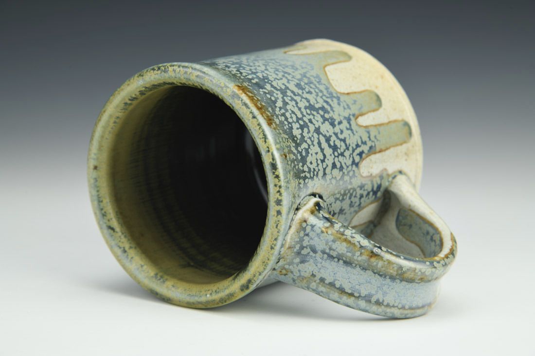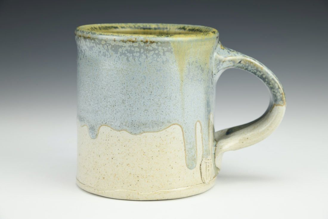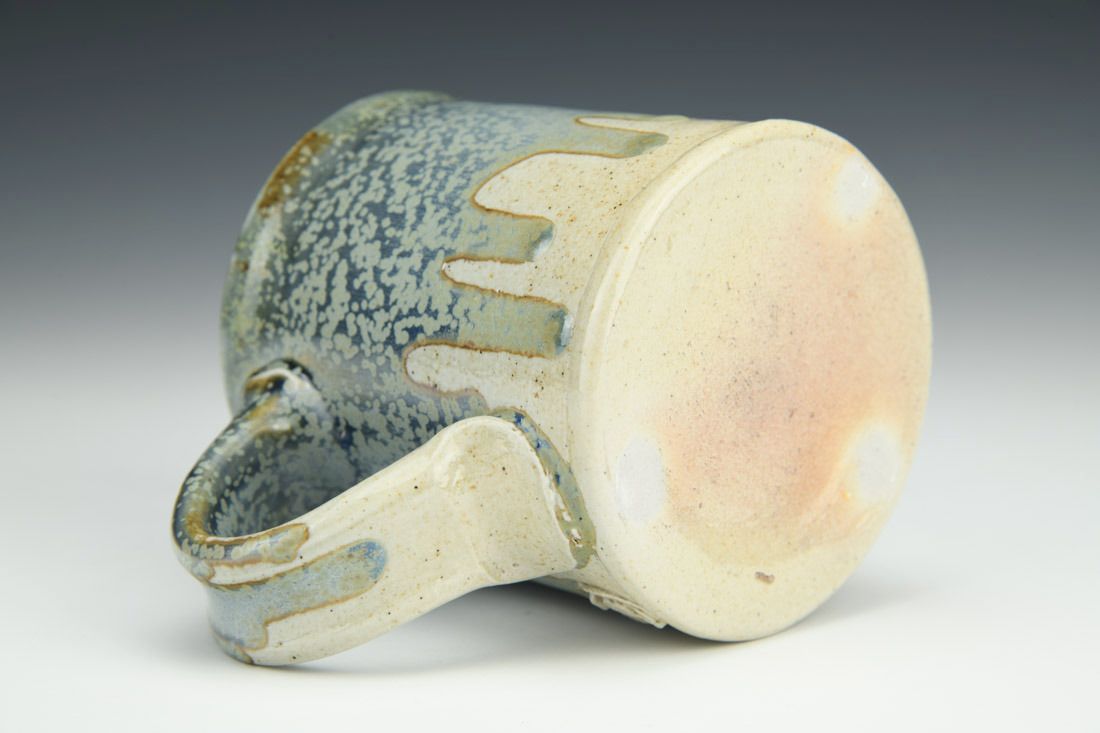 White stoneware, wheel thrown, stamped, cone 10 salt fired, 3.75 x 5 x 3.25 inches.