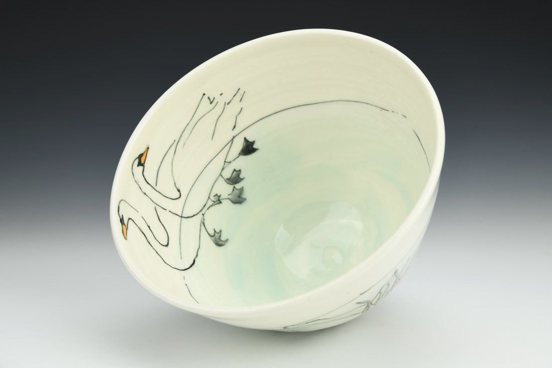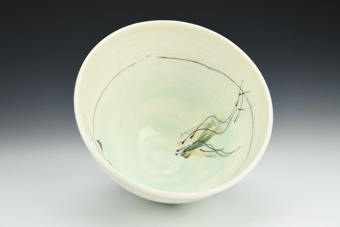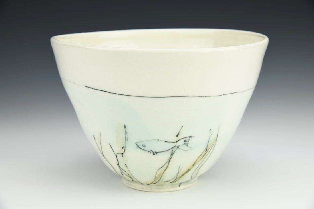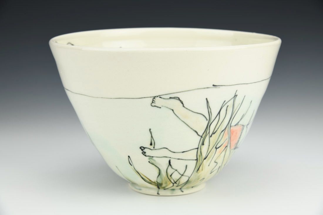 Porcelain, wheel thrown, fineliner underglaze, cone 6 electric fired, 5 x 7 x 7 inches.