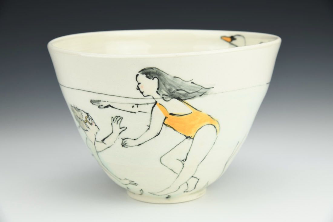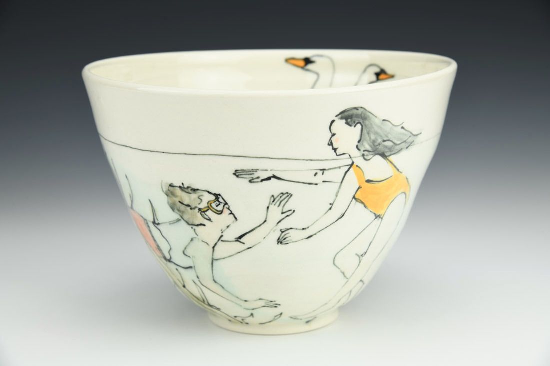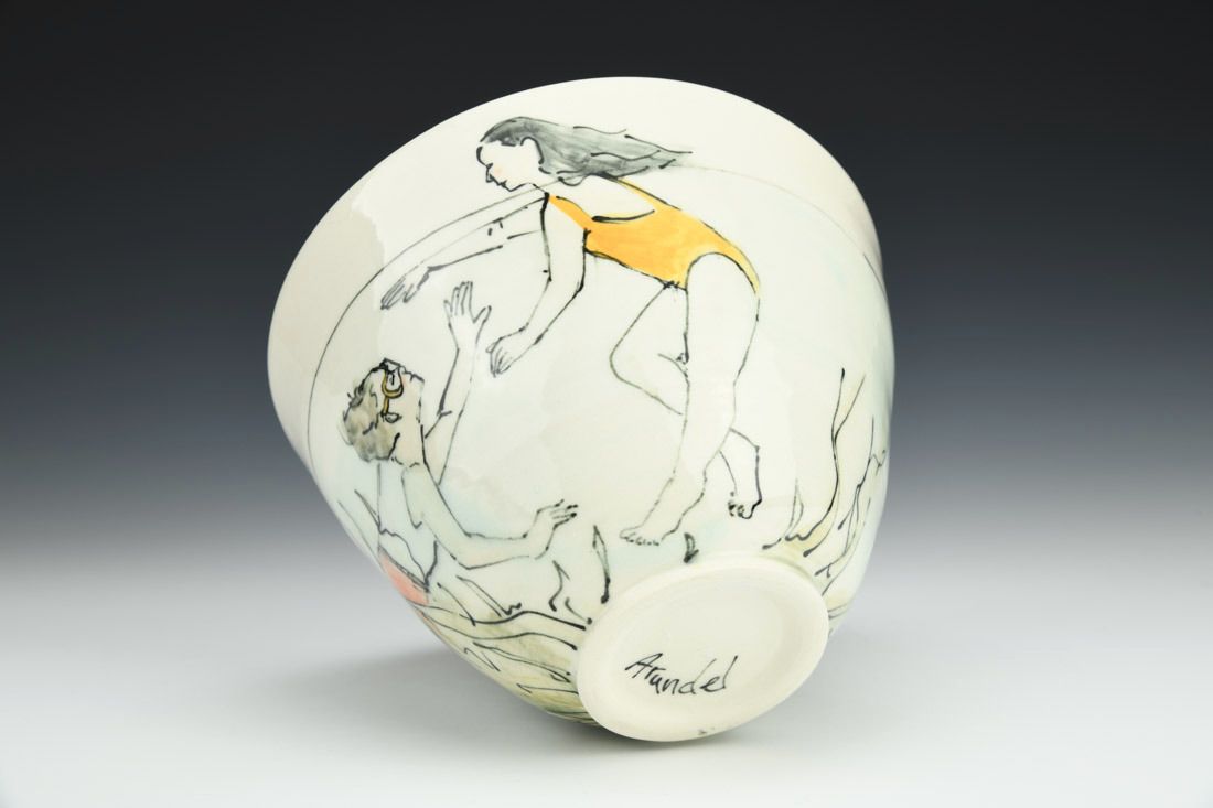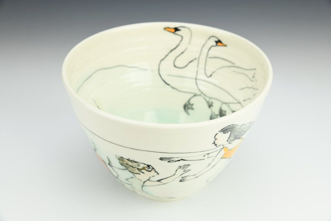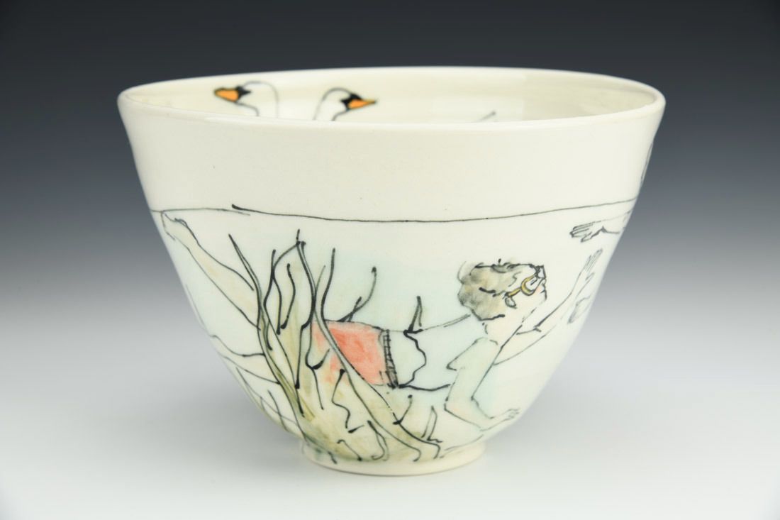 Porcelain, wheel thrown, fineliner underglaze, cone 6 electric fired, 5 x 7 x 7 inches.