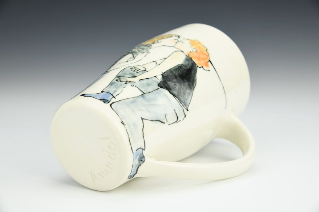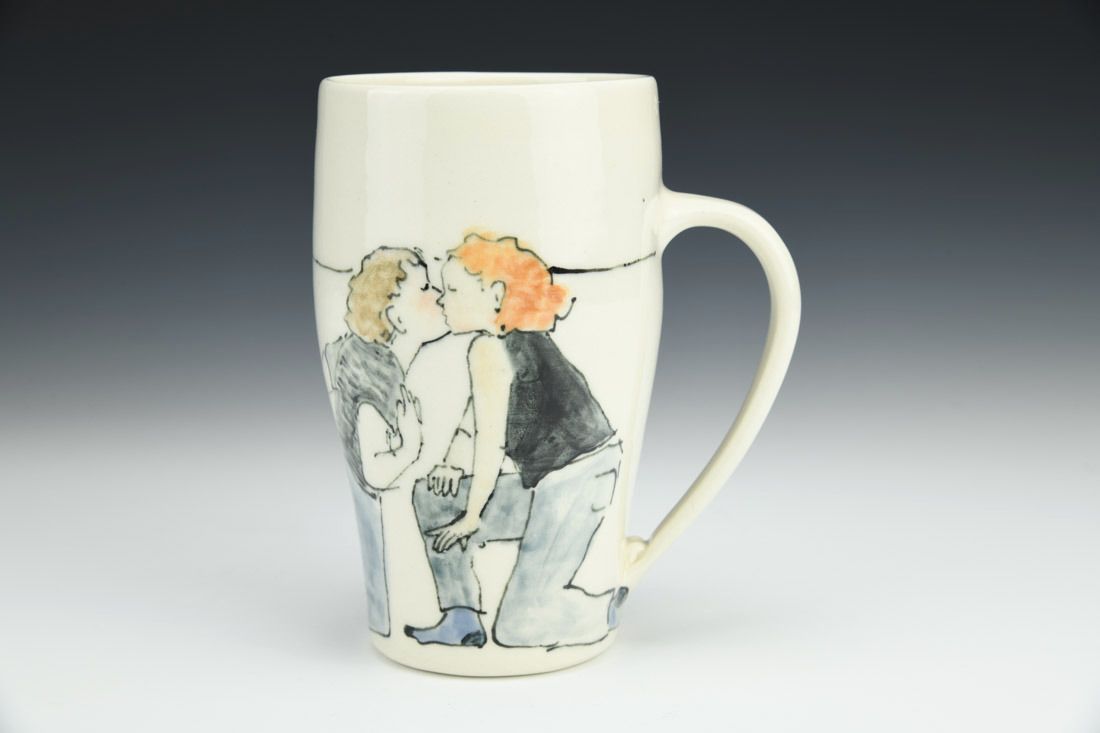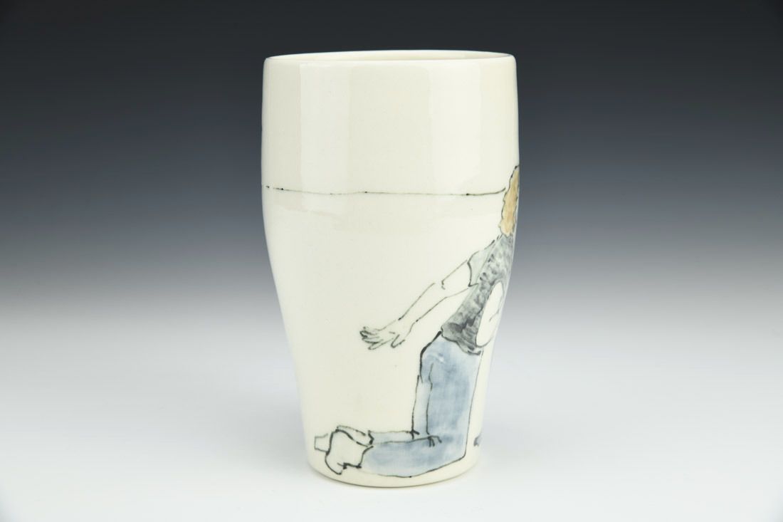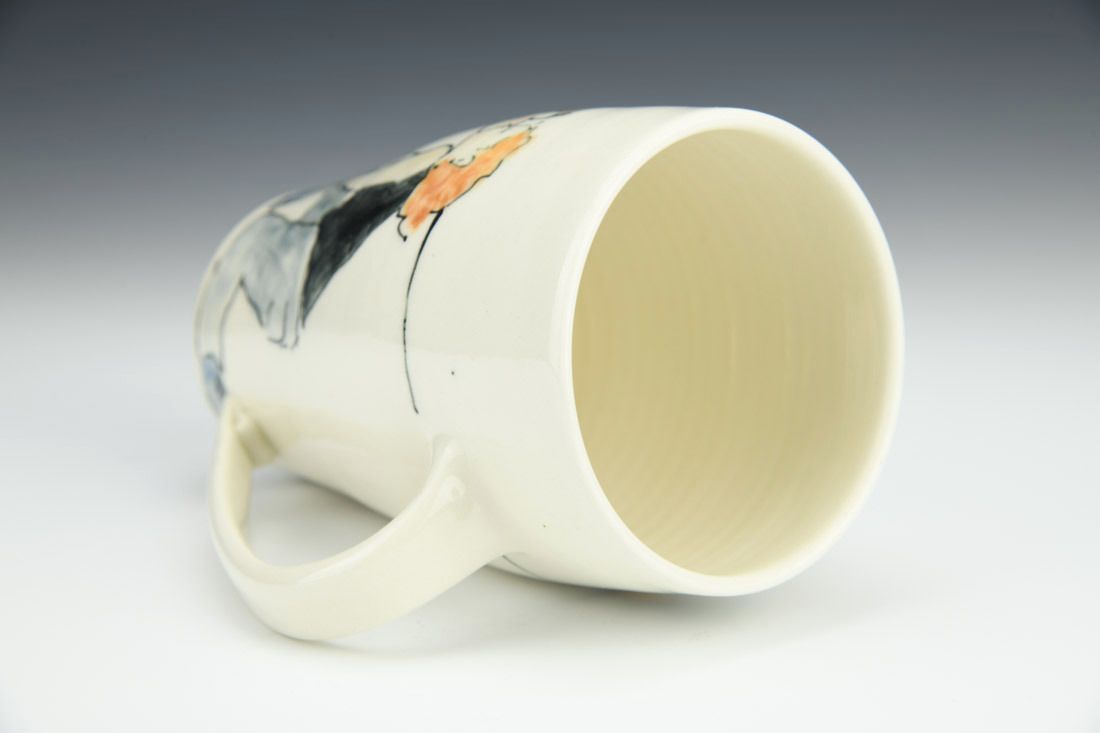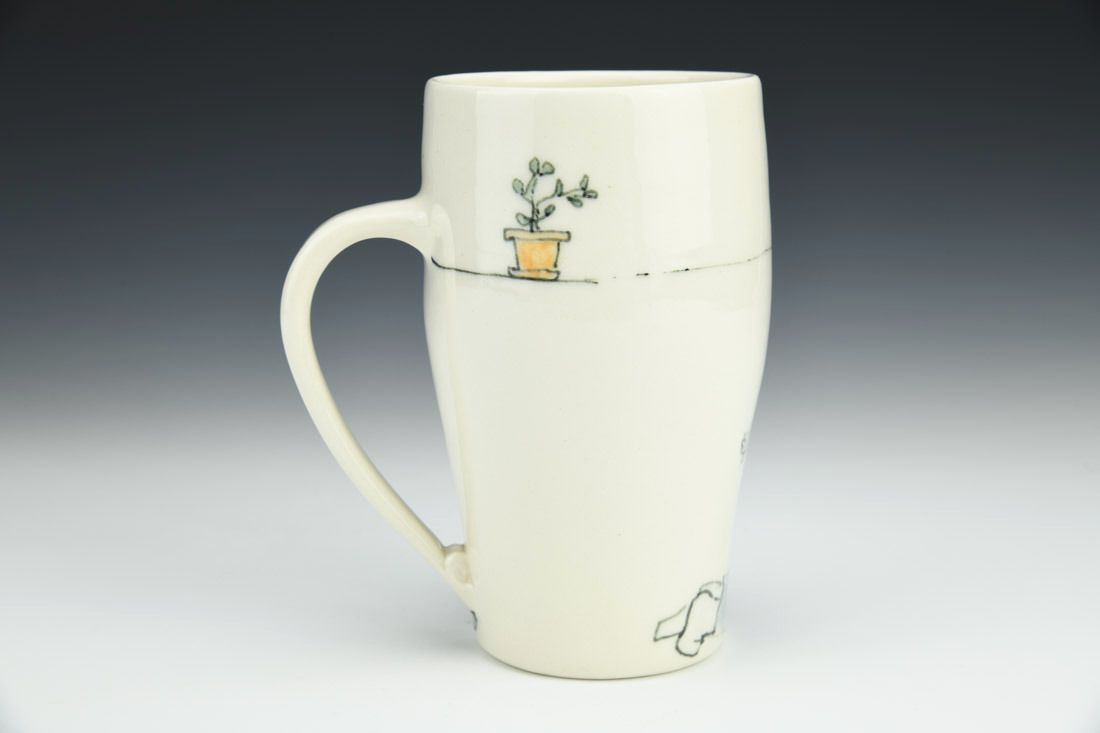 Porcelain, wheel thrown, fineliner underglaze, cone 6 electric fired, 5.5 x 5 x 3 inches.