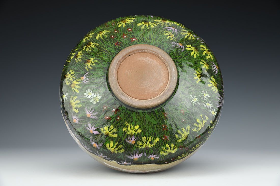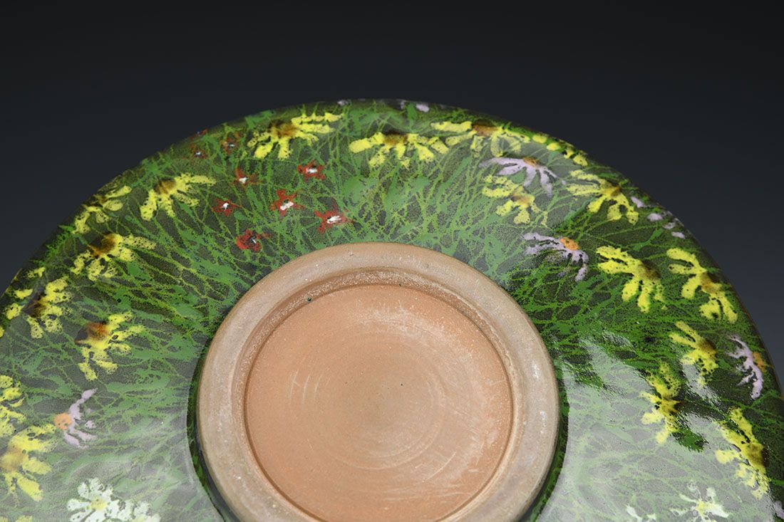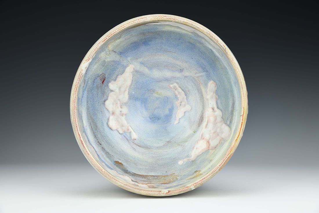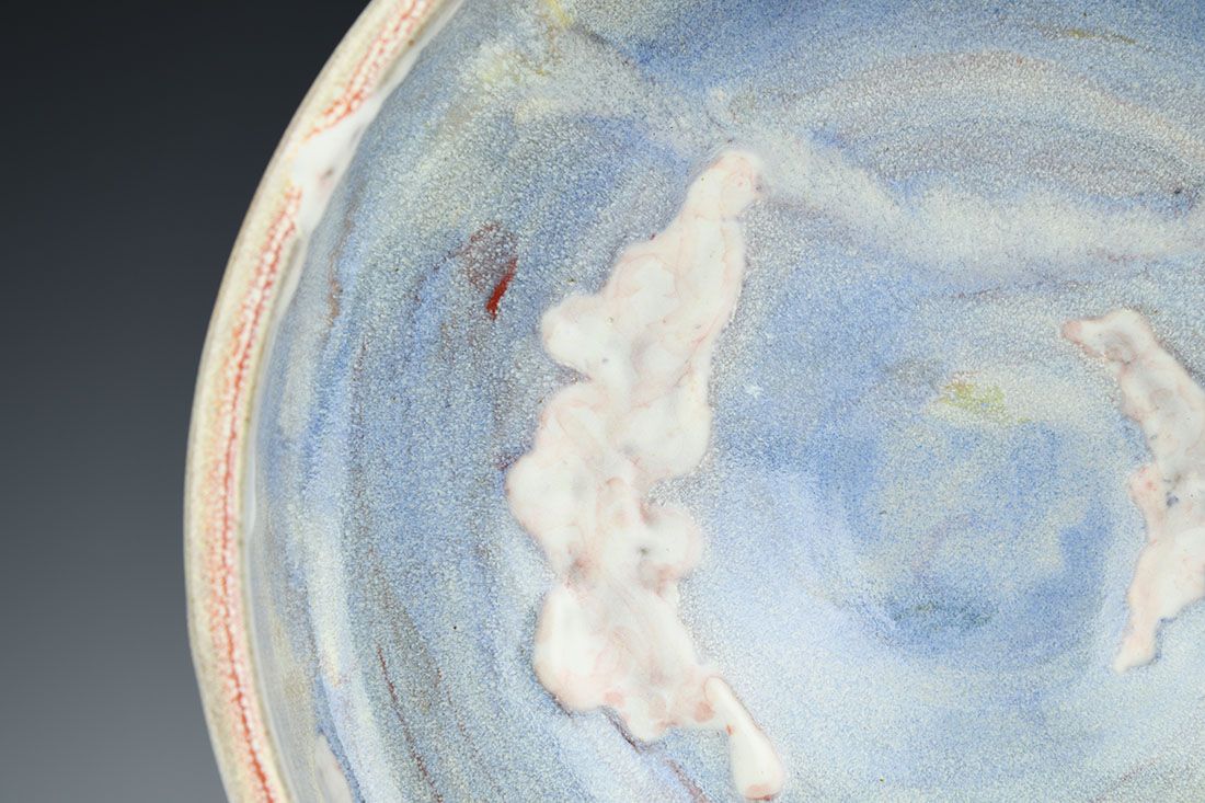 Red stoneware, wheel thrown, multiple glazes, cone 6 oxidation fired, 3.5 x 9.5 x 9.5 inches.
