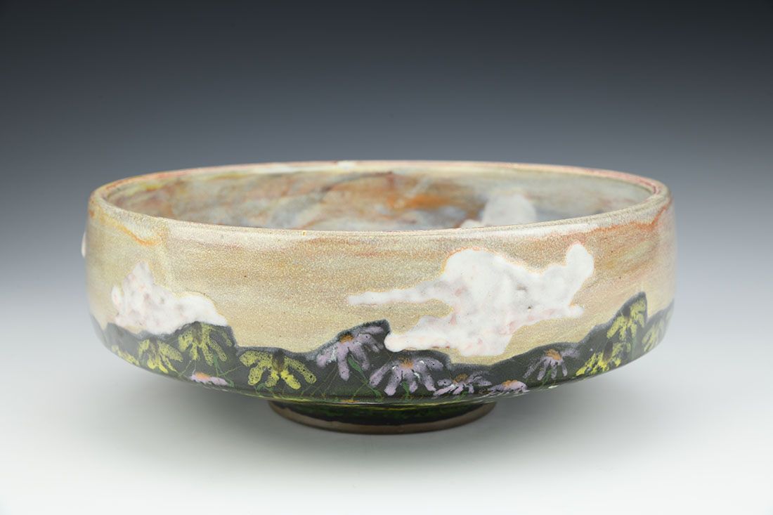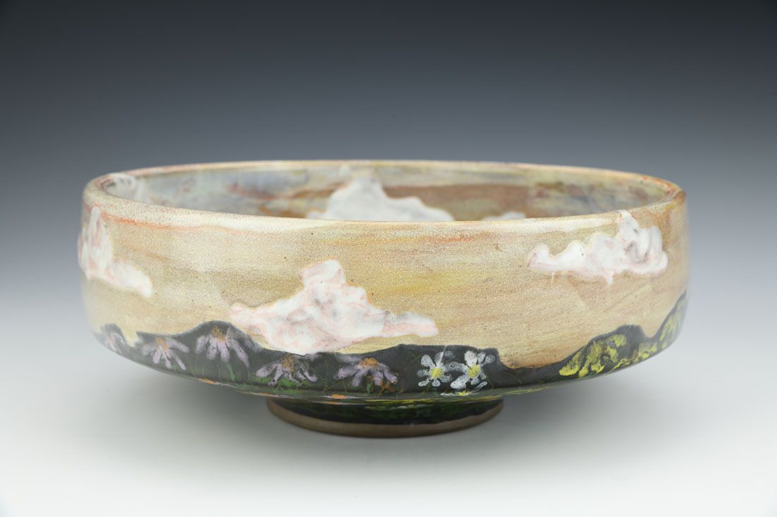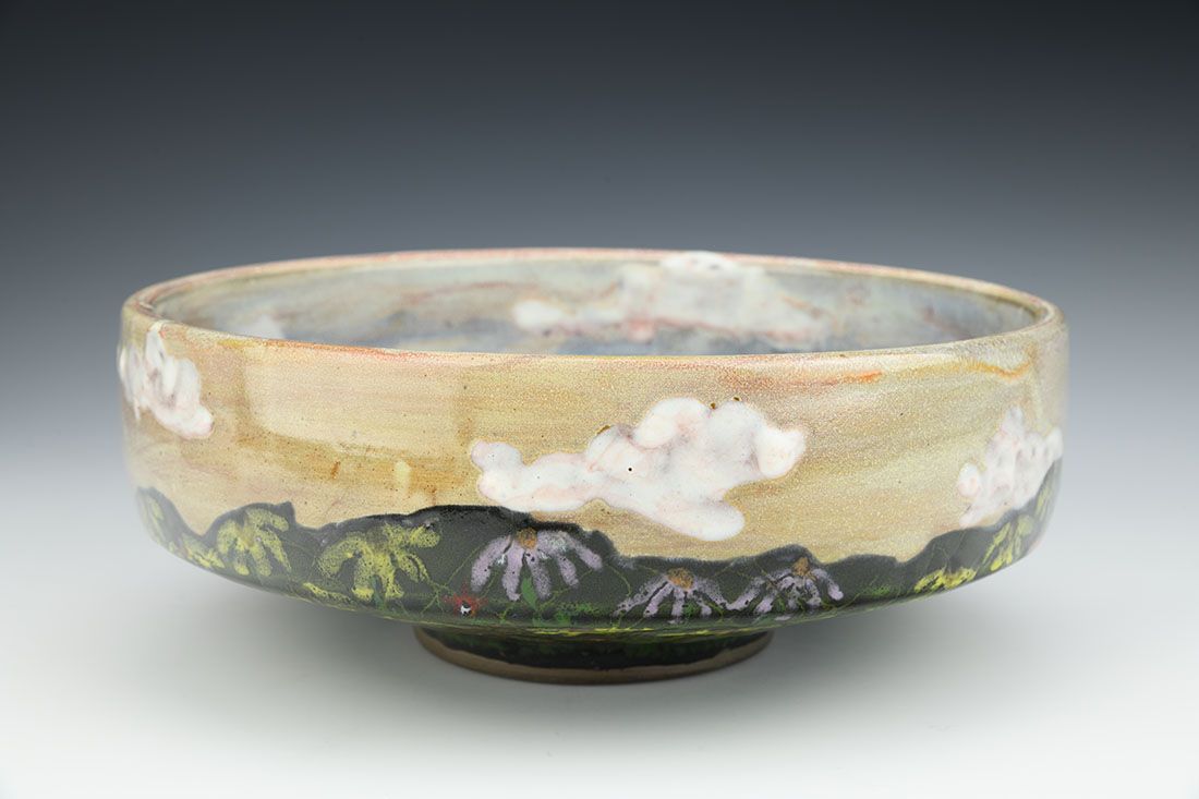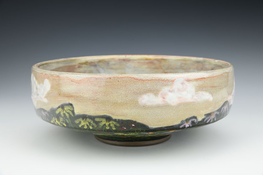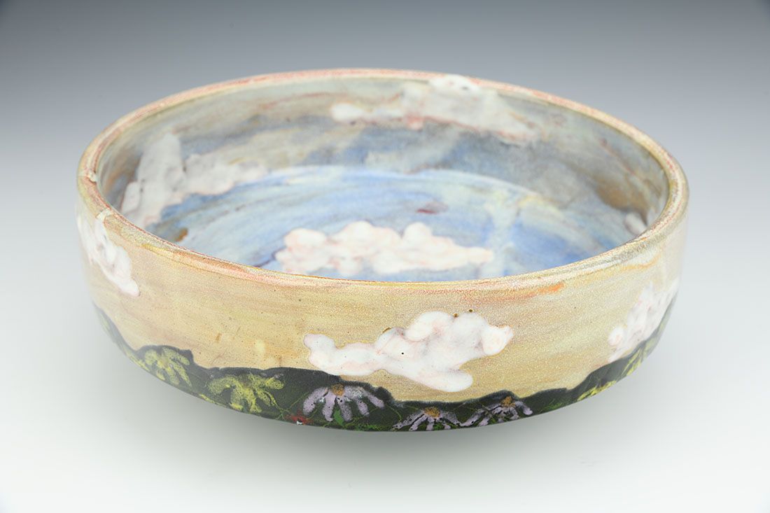 Red stoneware, wheel thrown, multiple glazes, cone 6 oxidation fired, 3.5 x 9.5 x 9.5 inches.