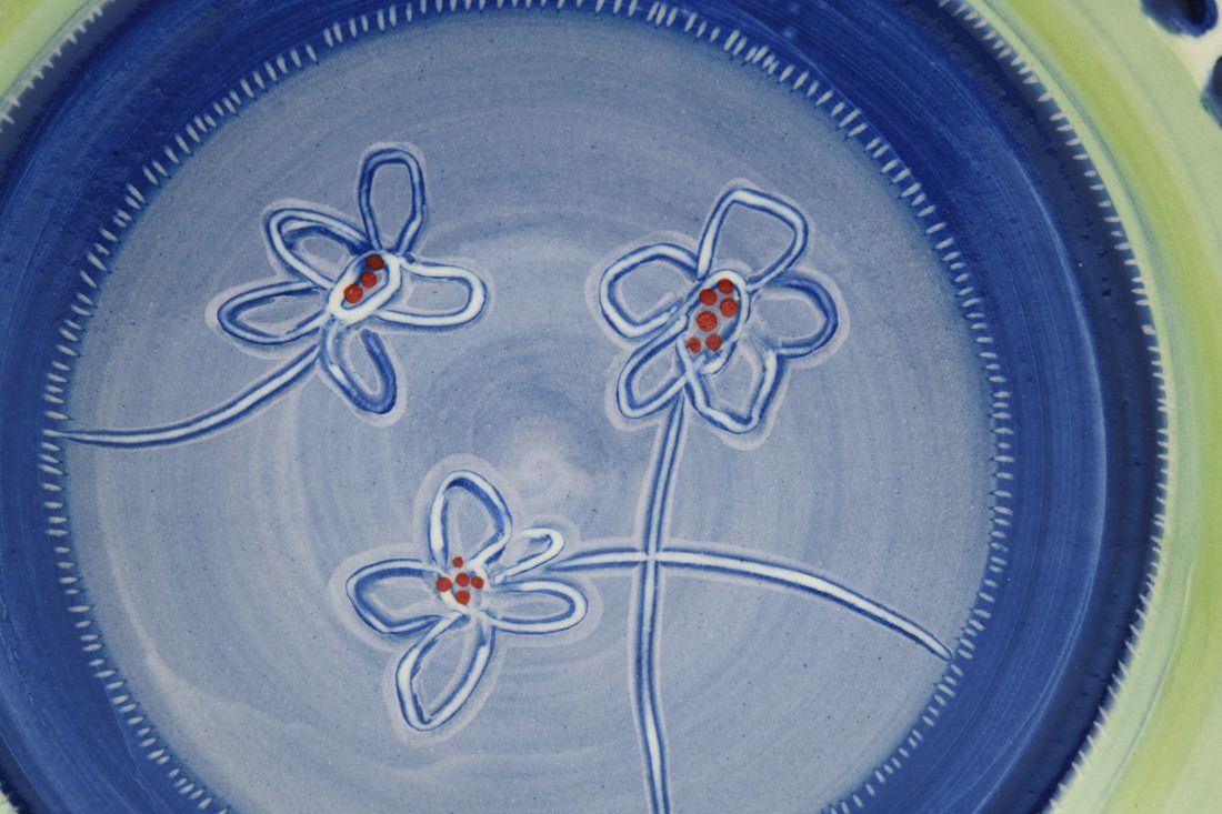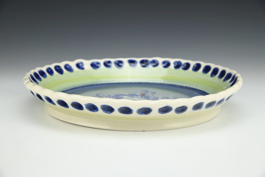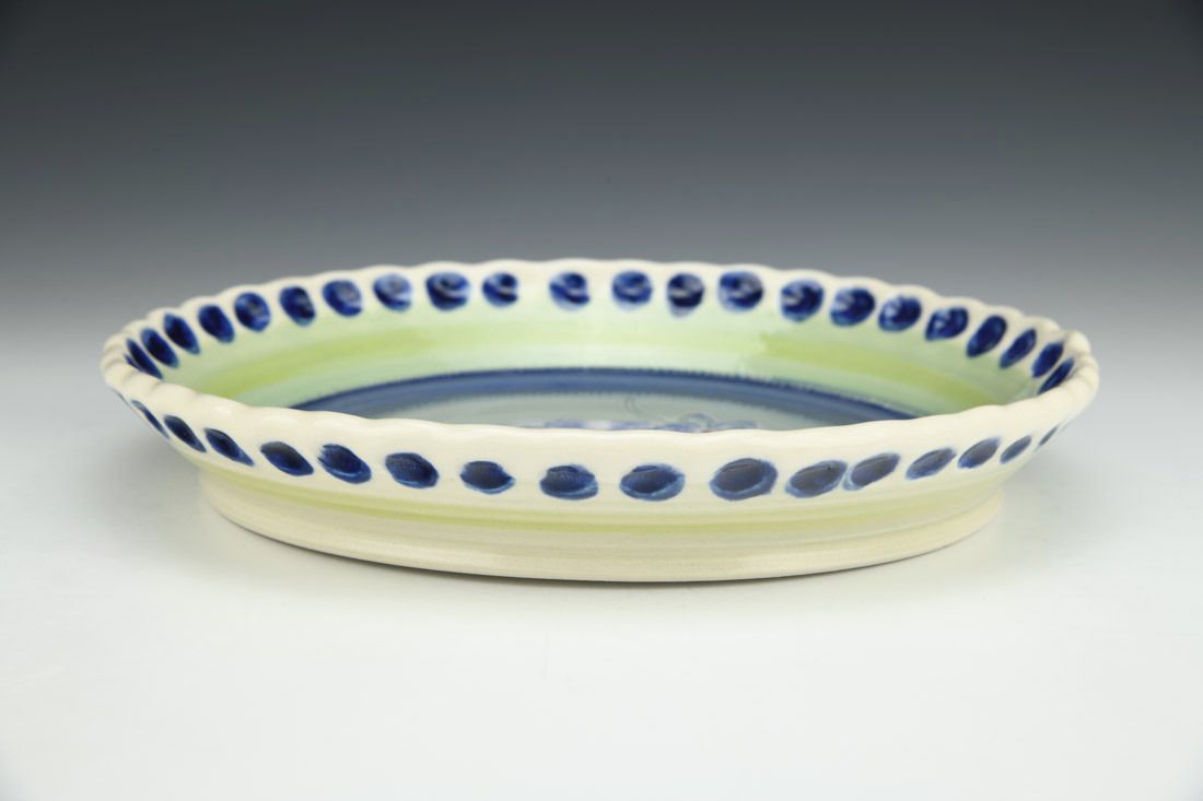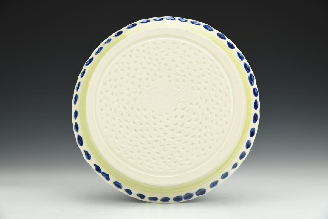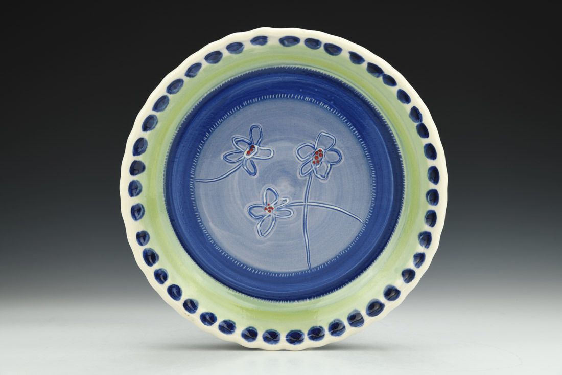 Porcelain, wheel thrown, colored porcelain slip, red underglaze, clear glaze, cone 6 electric fired, 1.75 x 10.25 x 10.25 inches.