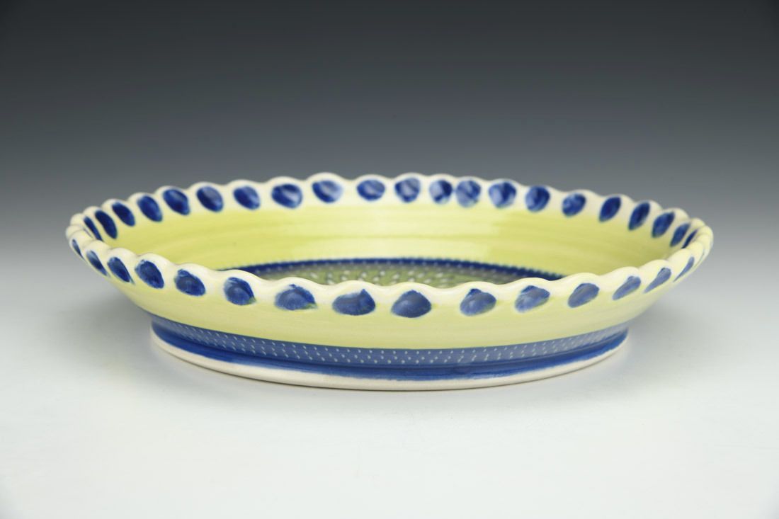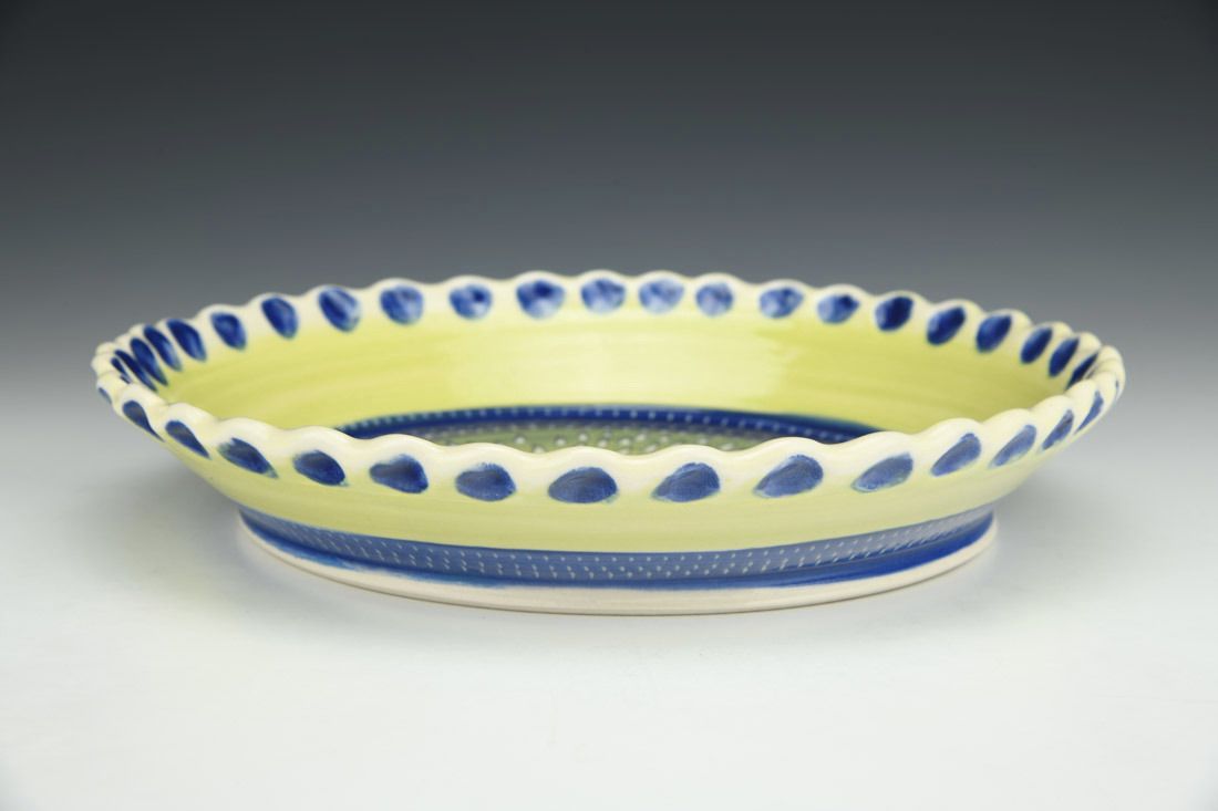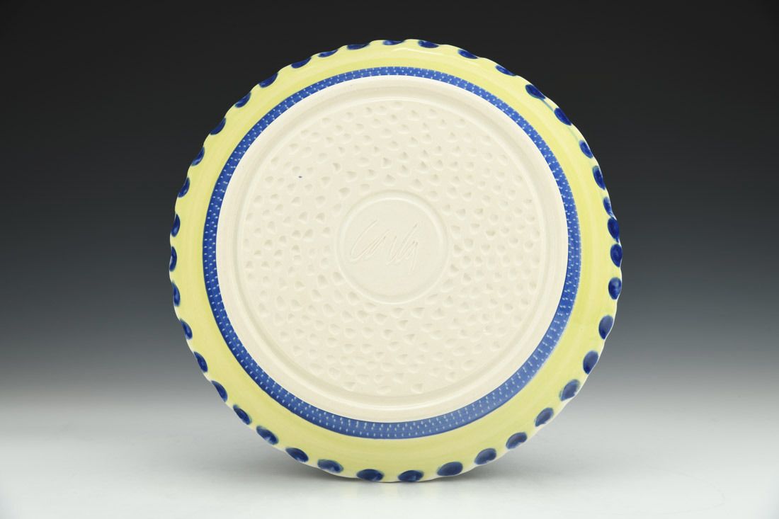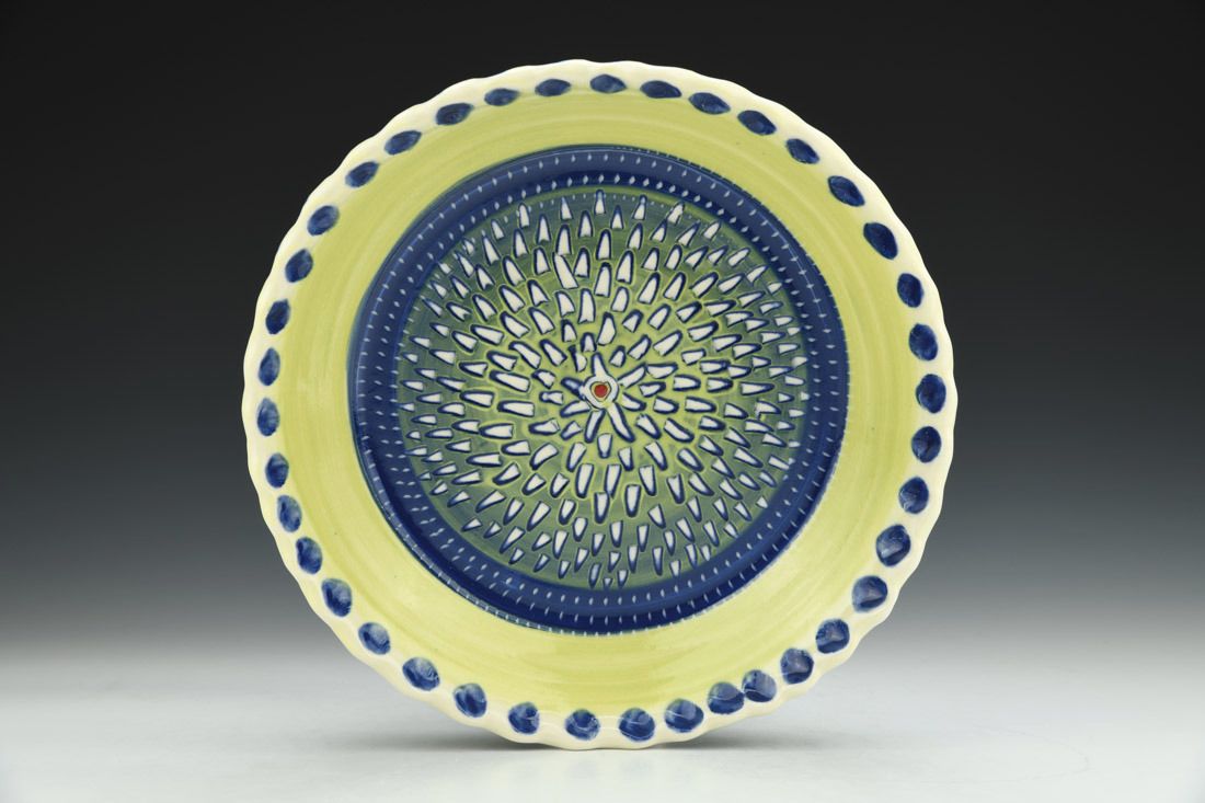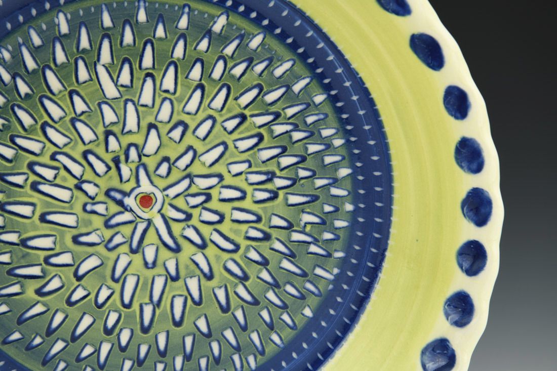 Porcelain, wheel thrown, colored porcelain slip, red underglaze, clear glaze, cone 6 electric fired, 2 x 10.75 x 10.75 inches.