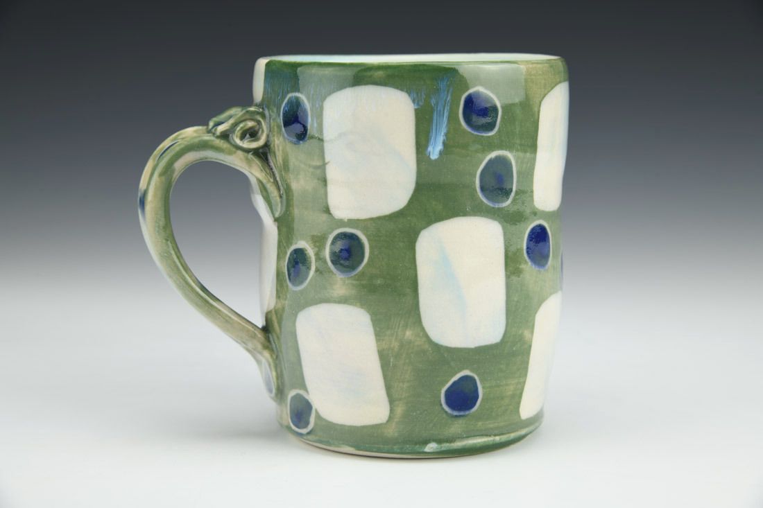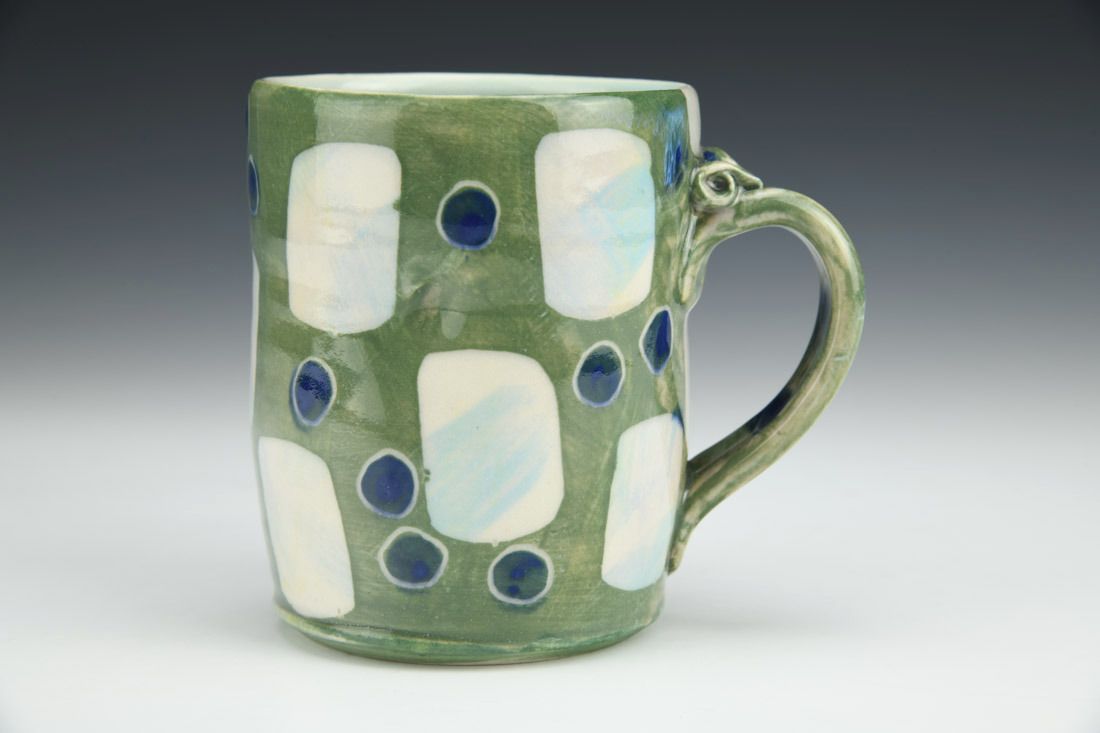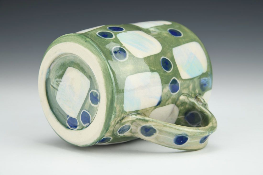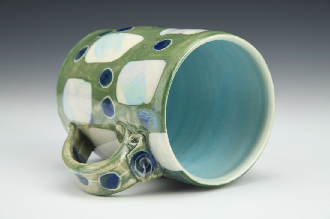 Porcelain, wheel thrown, hand painted, colored slips, red underglaze, aqua interior glaze, 4.25 x 5 x 3.25 inches.