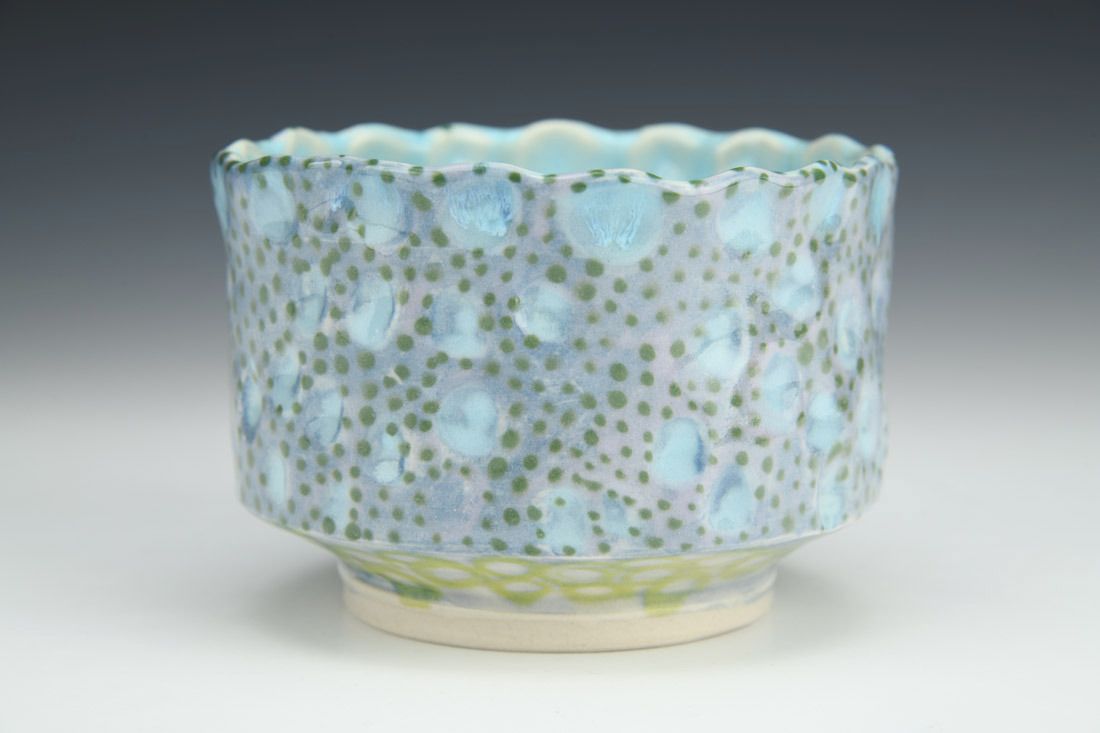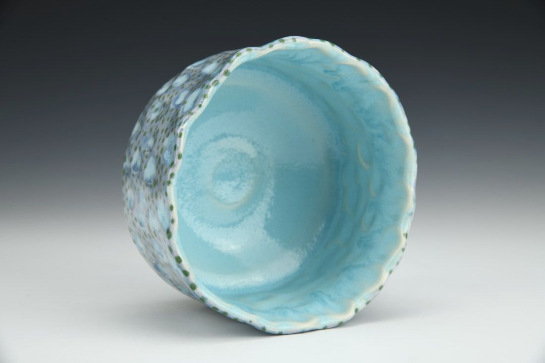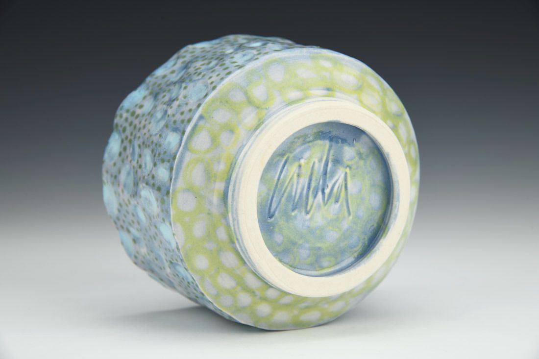 Porcelain, wheel thrown and altered, color slip, clear glaze, cone 6 electric fired, 3 x 4.5 x 4.5 inches.