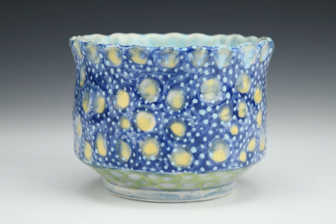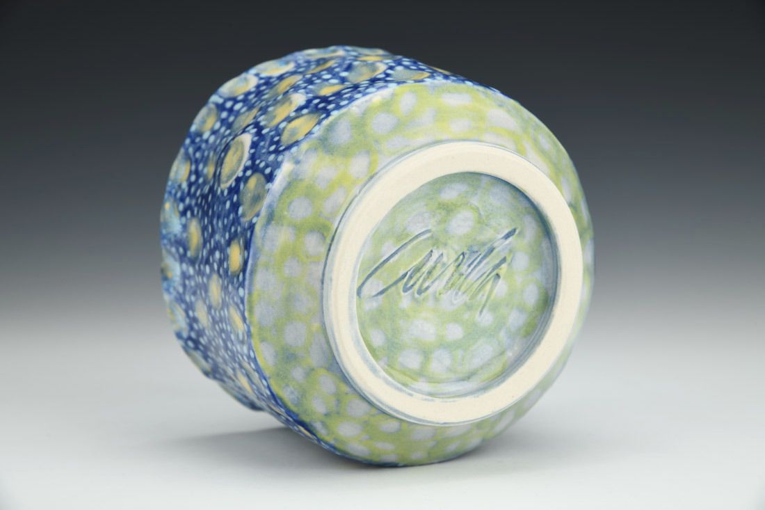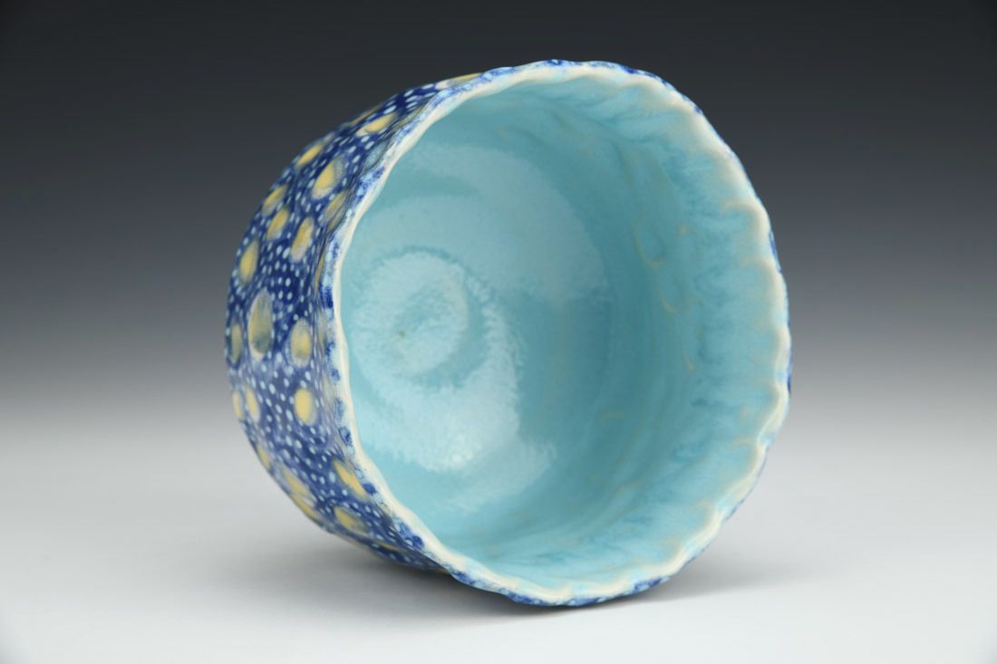 Porcelain, wheel thrown and altered, color slip, clear glaze, cone 6 electric fired, 3 x 4.5 x 4.5 inches.
