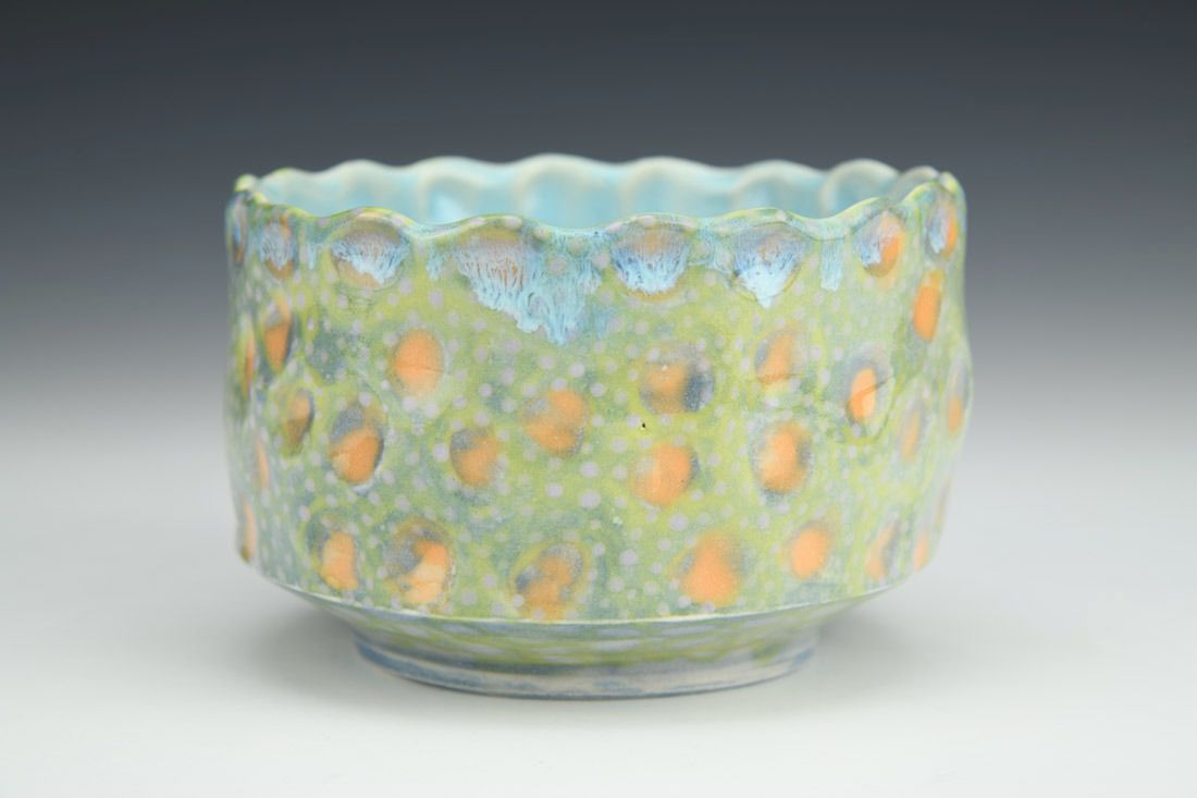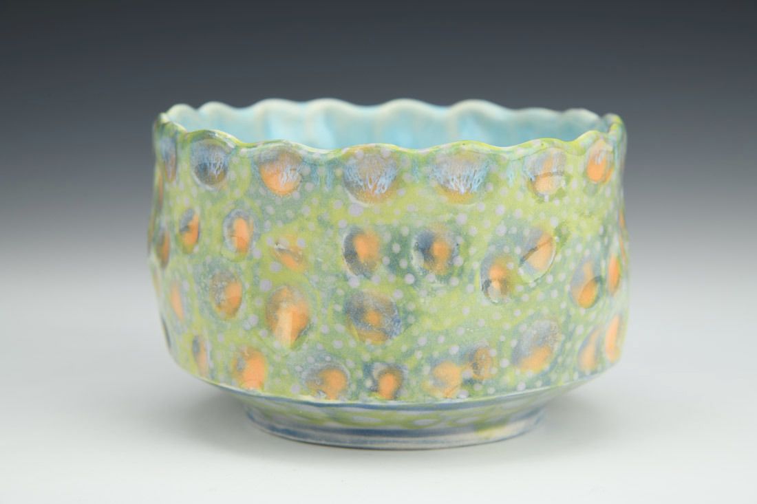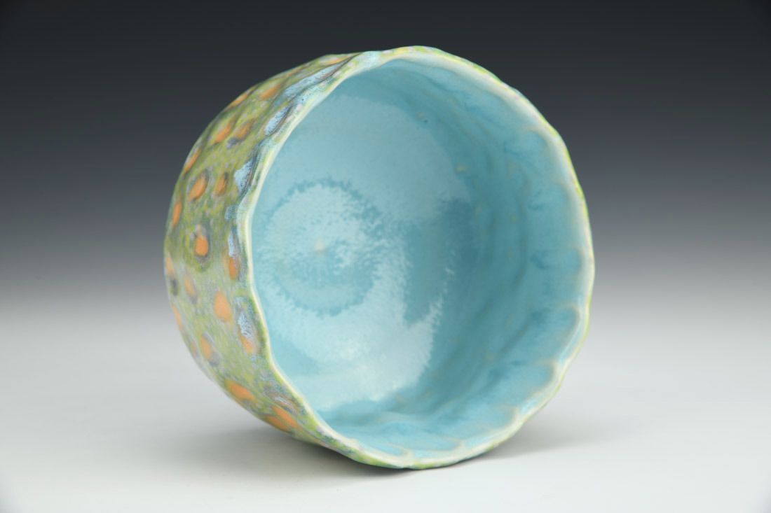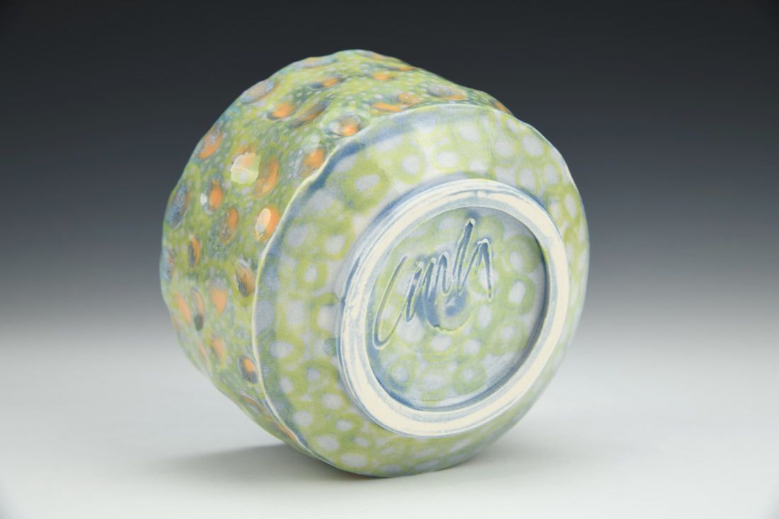 Porcelain, wheel thrown and altered, color slip, clear glaze, cone 6 electric fired, 2.75 x 4.5 x 4.5 inches.