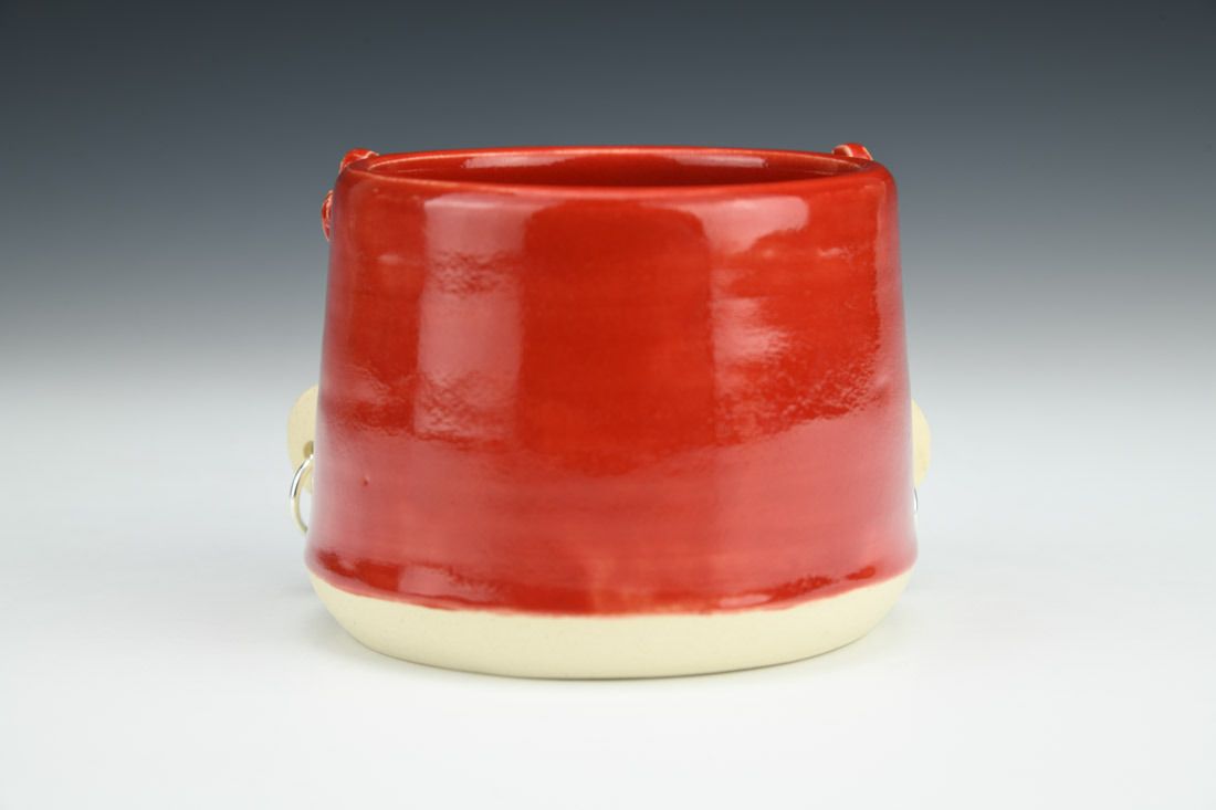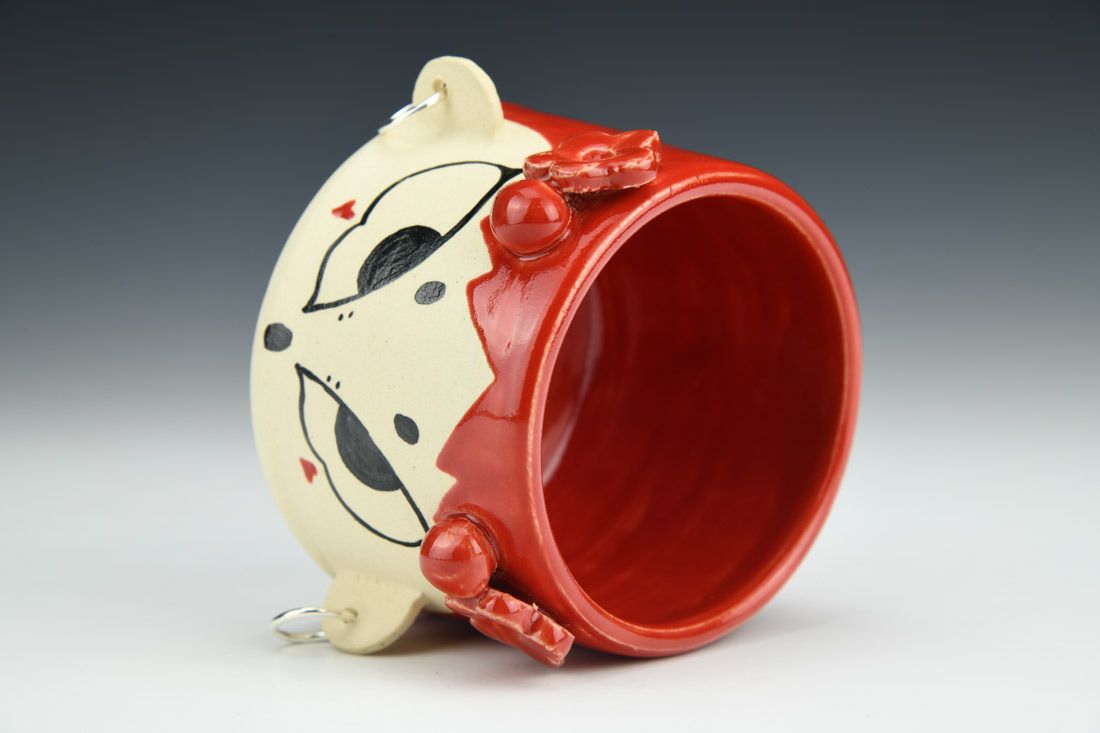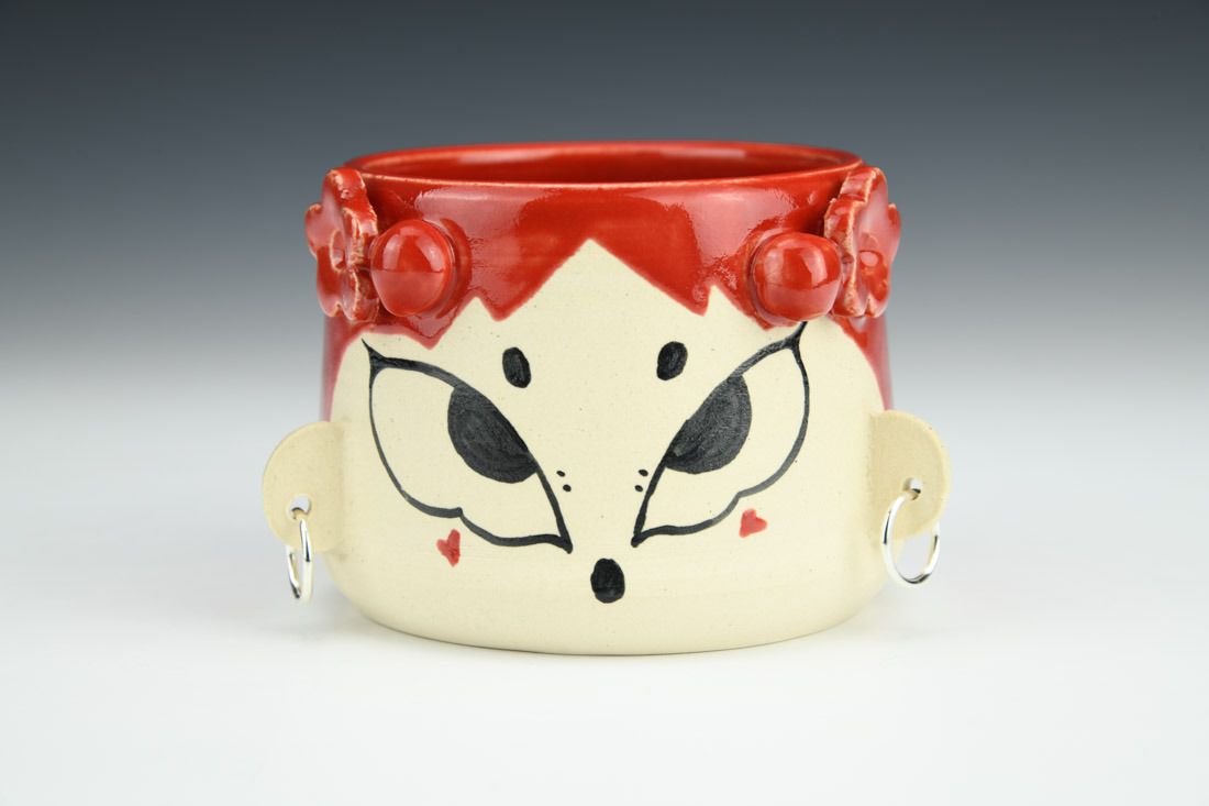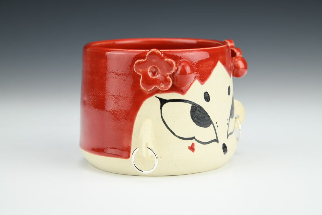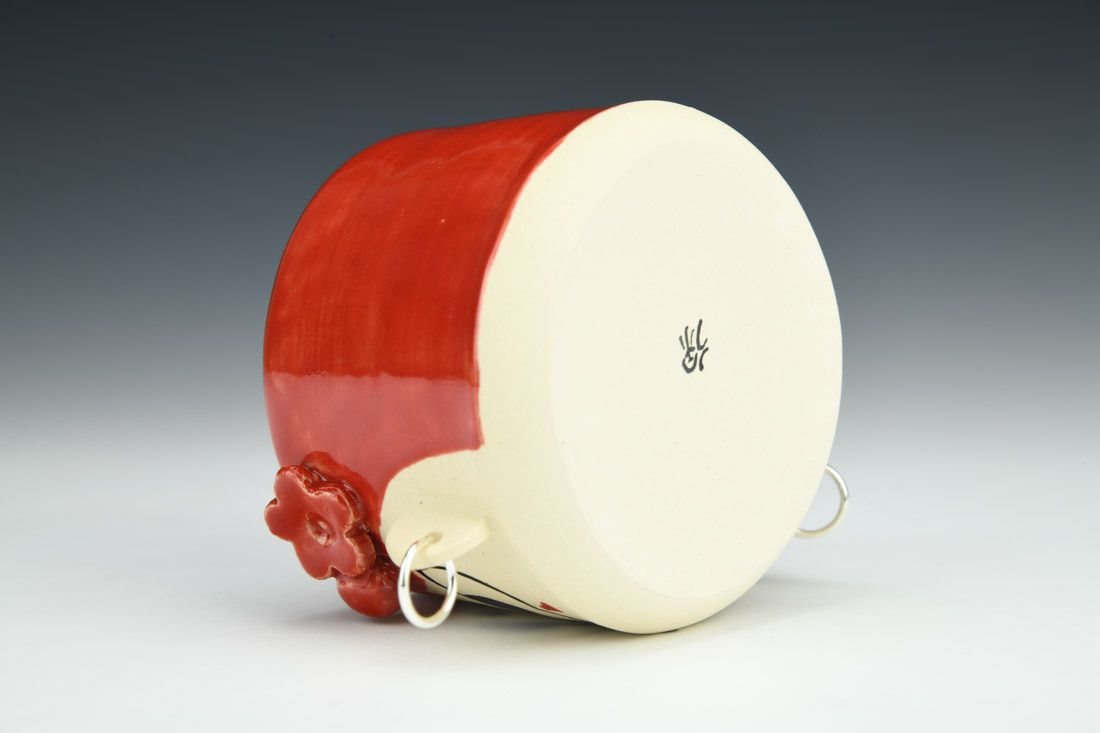 Stoneware with silver plated earrings, wheel thrown and hand built, wax resist, underglaze, glaze, mid-range electric fired, 2.75 x 4 x 3.75 inches.