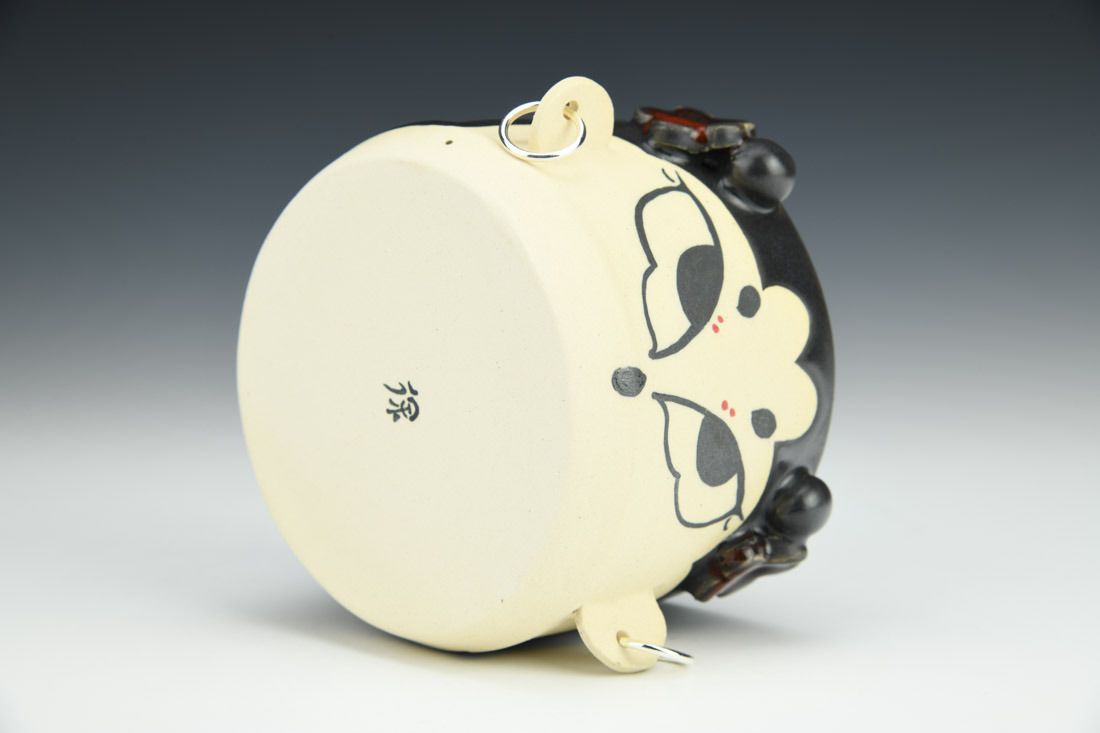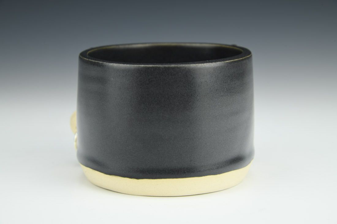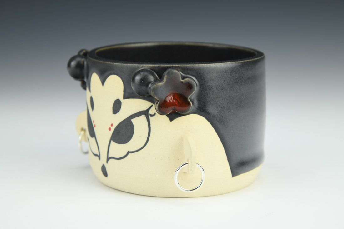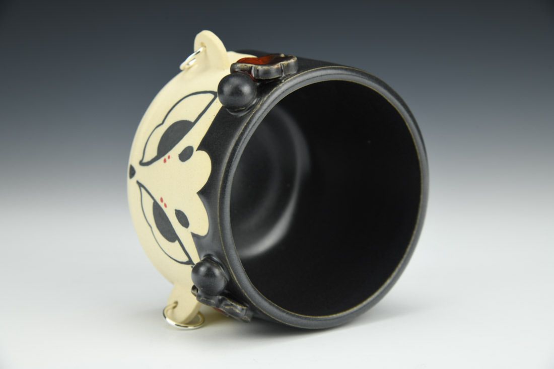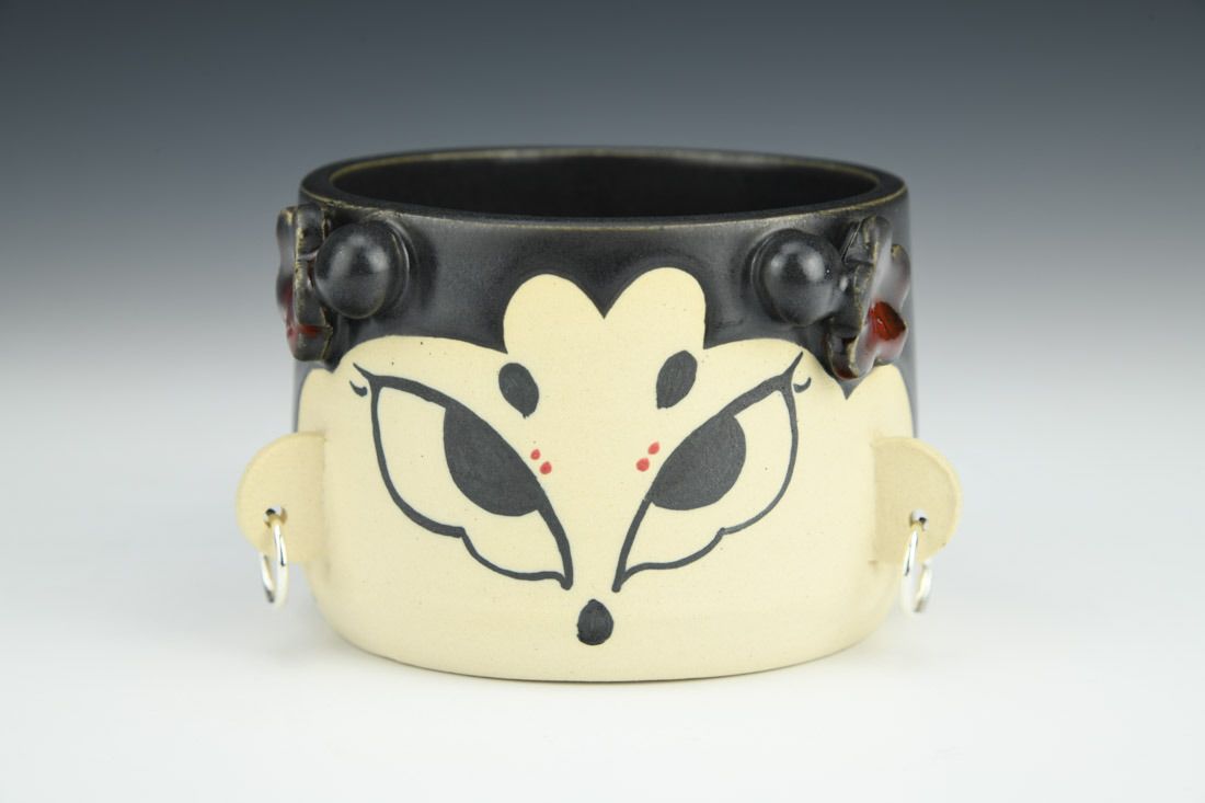 Stoneware with silver plated earrings, wheel thrown and hand built, wax resist, underglaze, glaze, mid-range electric fired, 3 x 5.5 x 3.75 inches.