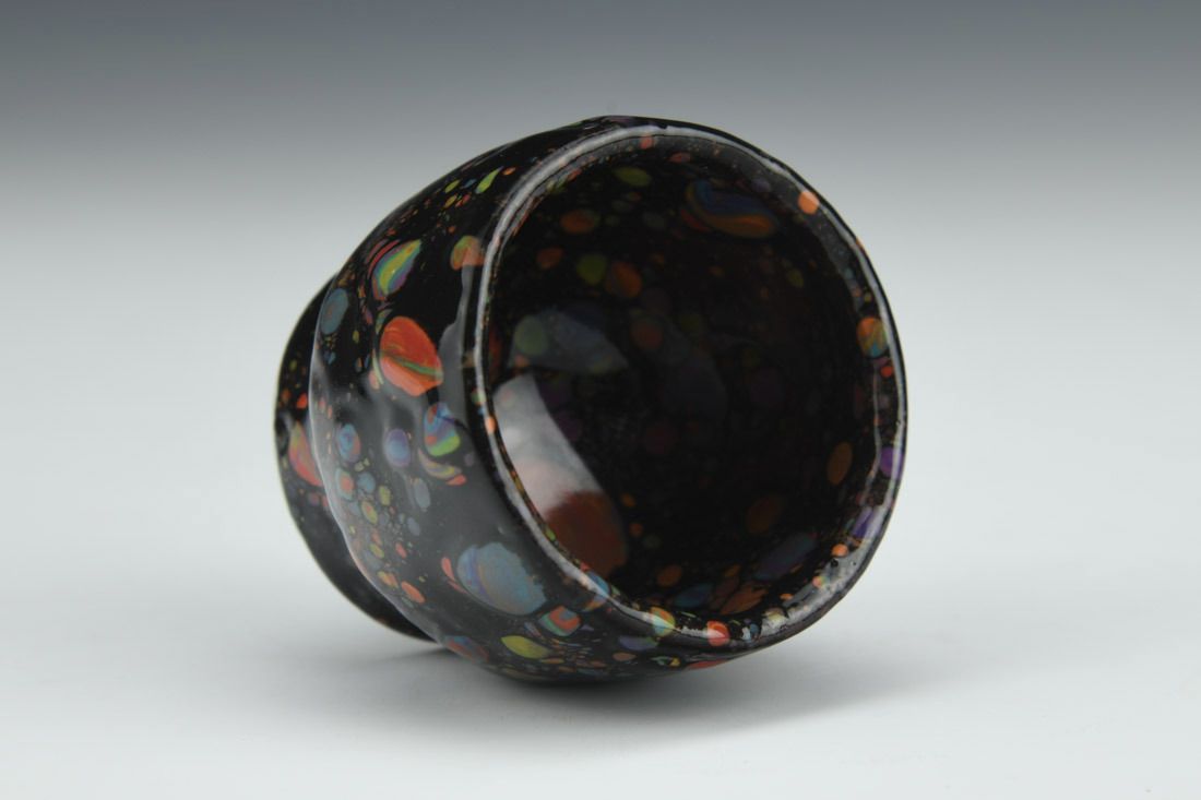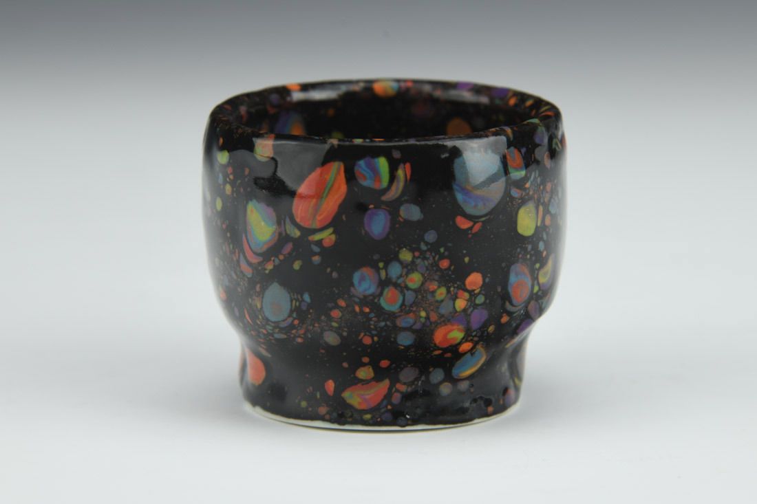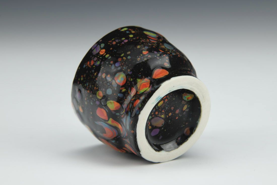 Porcelain, wheel thrown, black glaze, dried and sprinkled glaze crumbles, cone 7 electric fired, multiple firings, 1.5 x 2 x 2 inches.