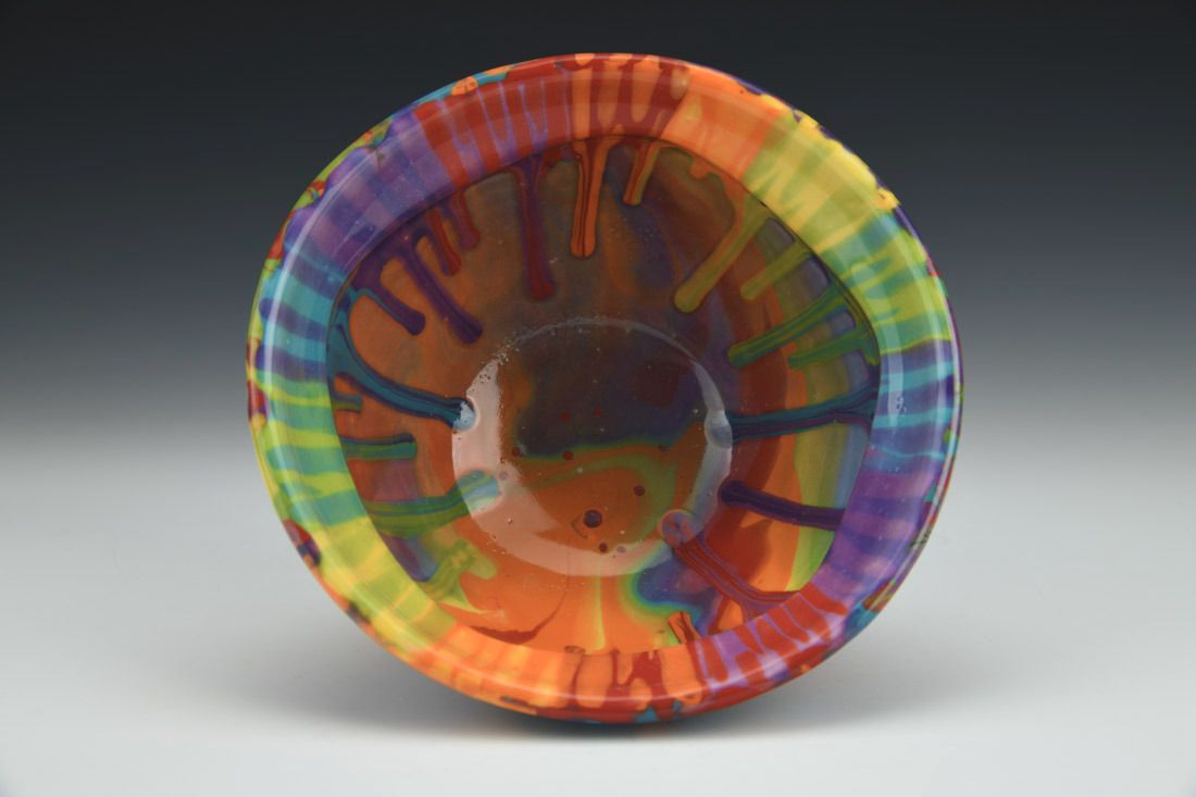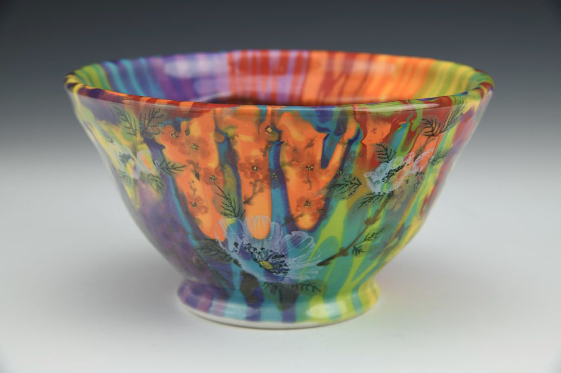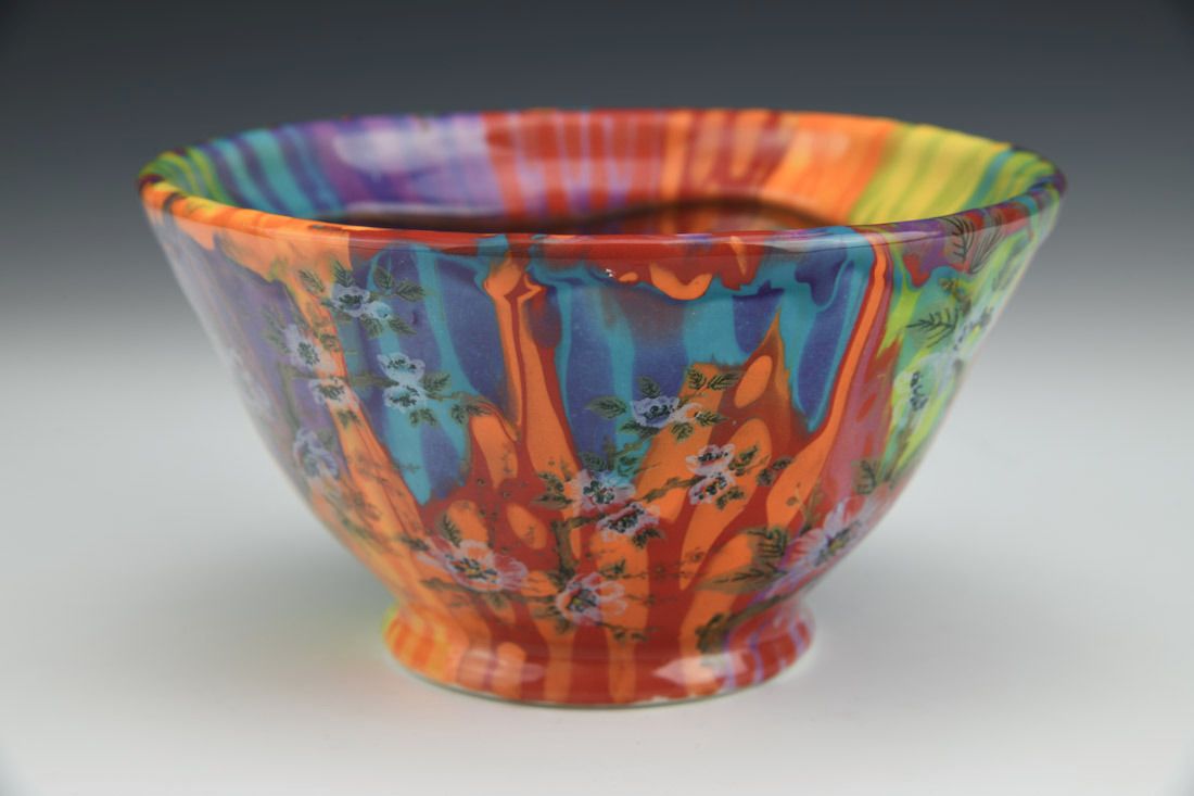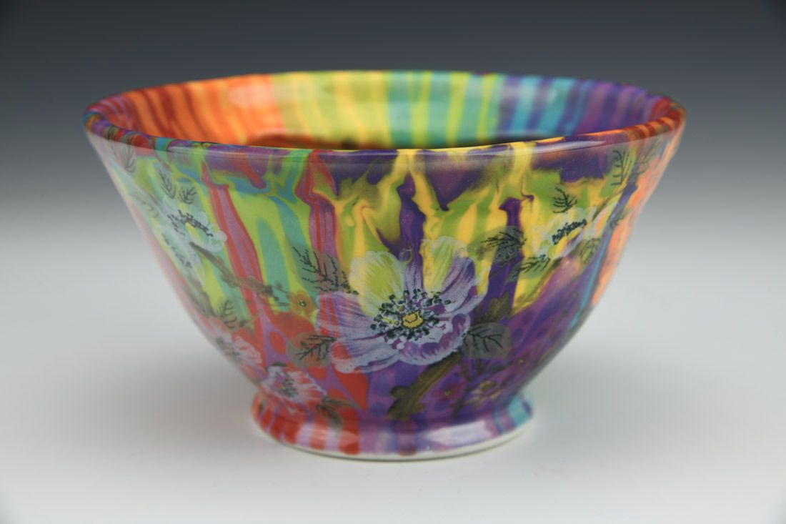 Porcelain, wheel thrown, many layered glazes, vintage decals, multiple firings, 3.25 x 6.25 x 6.25 inches.