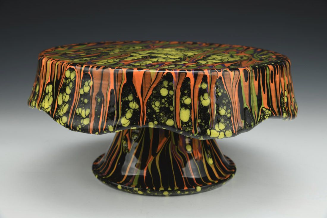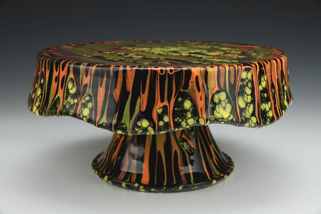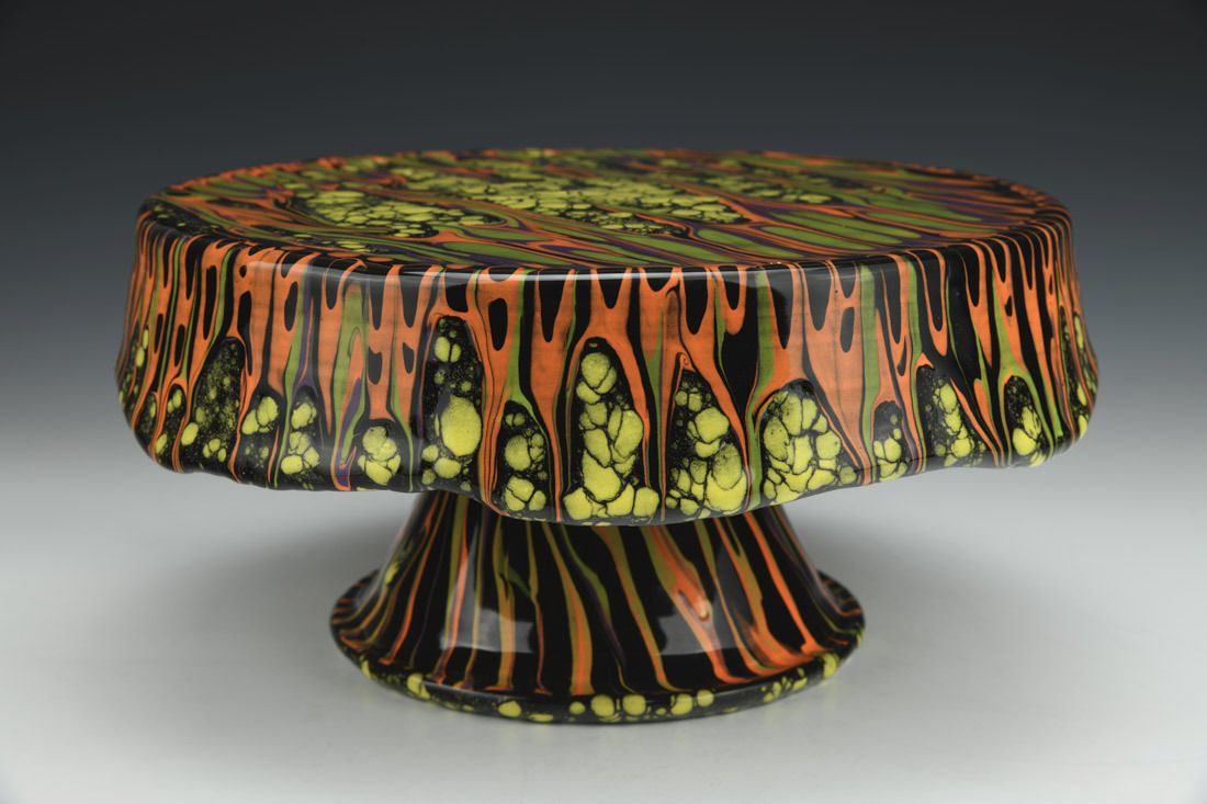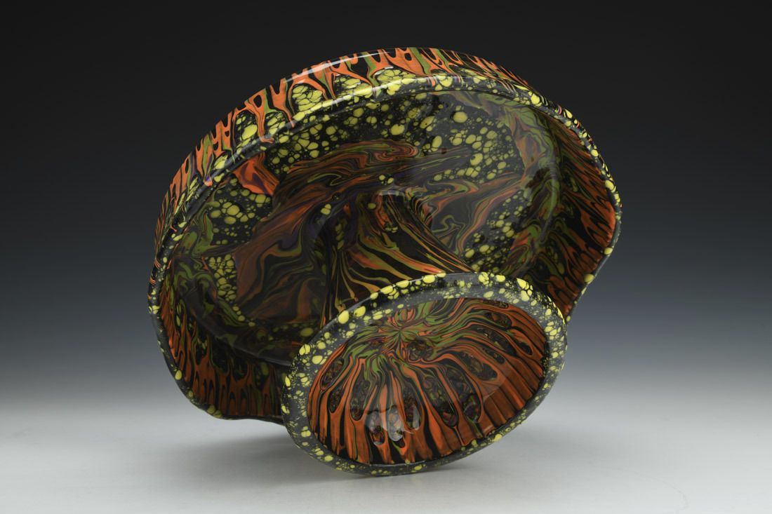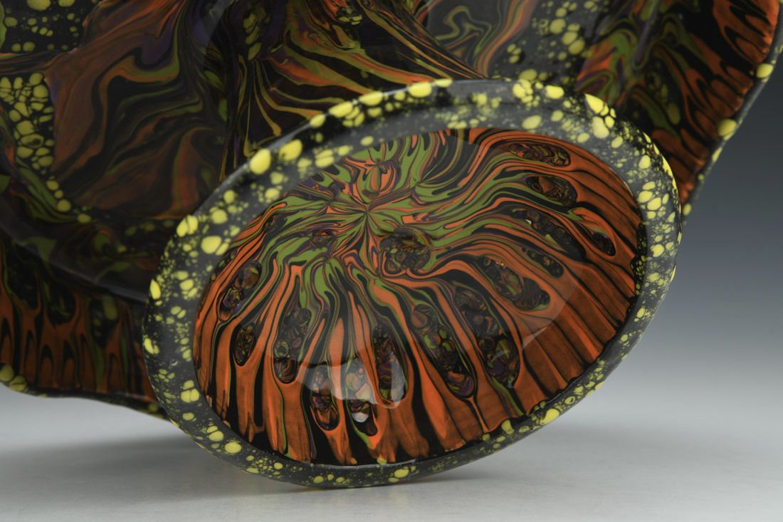 Porcelain, wheel thrown and altered, many layered glazes, cone 7 electric fired, multiple firings, 5.25 x 11.5 x 11.5 inches.