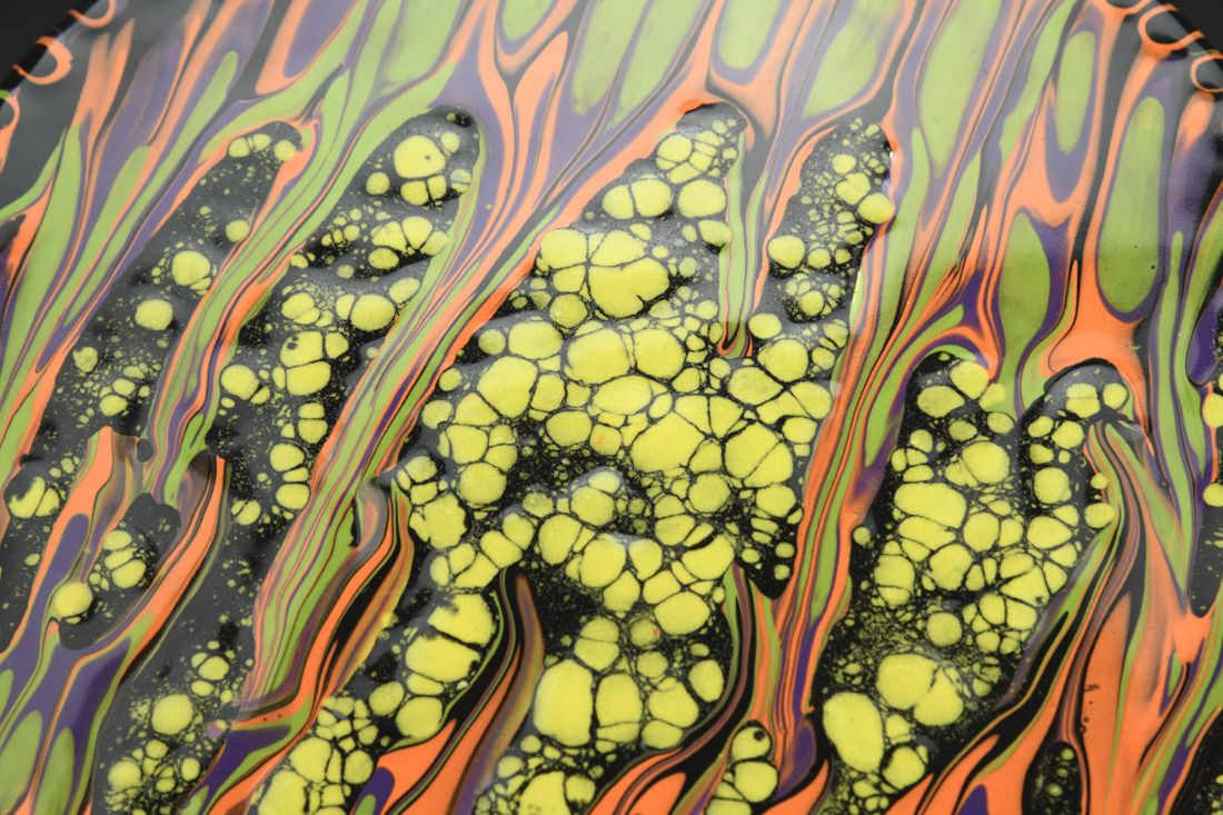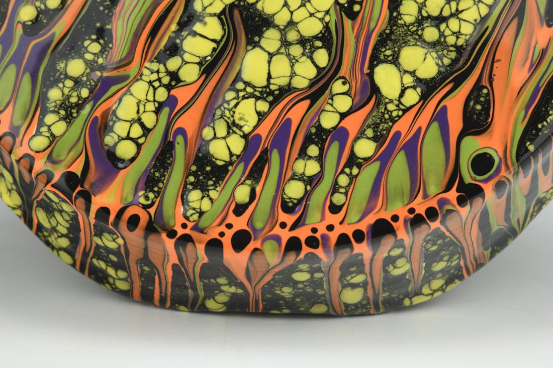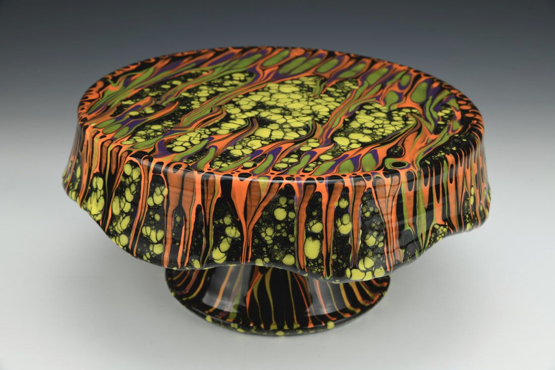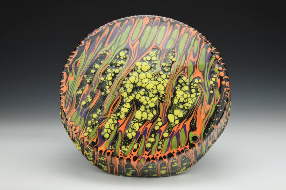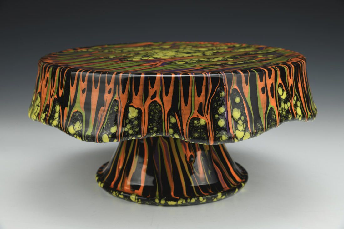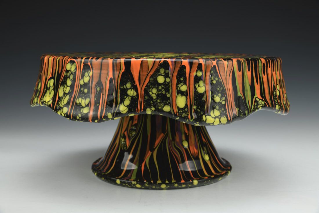 Porcelain, wheel thrown and altered, many layered glazes, cone 7 electric fired, multiple firings, 5.25 x 11.5 x 11.5 inches.