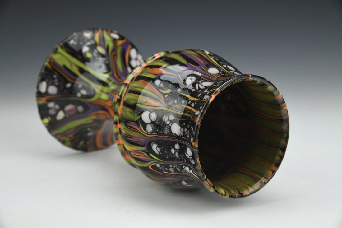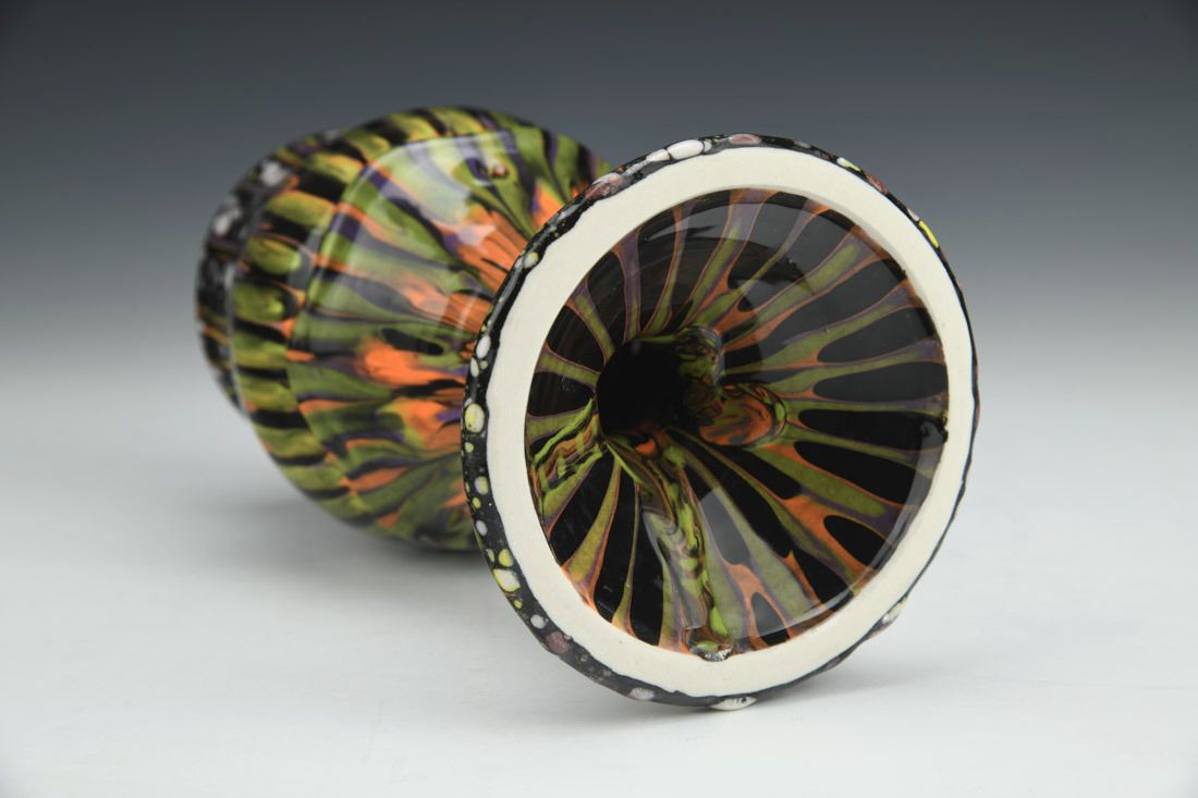 Porcelain, wheel thrown and altered, many layered glazes, cone 7 electric fired and cone 06 electric fired, multiple firings, 7.5 x 4 x 4 inches.