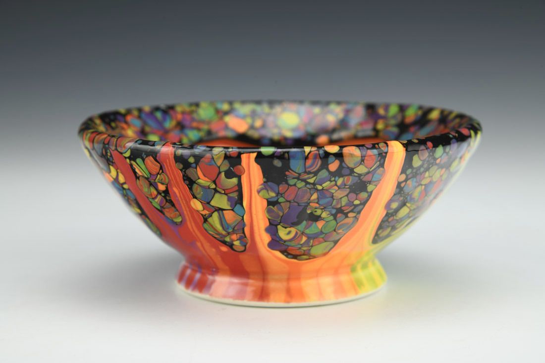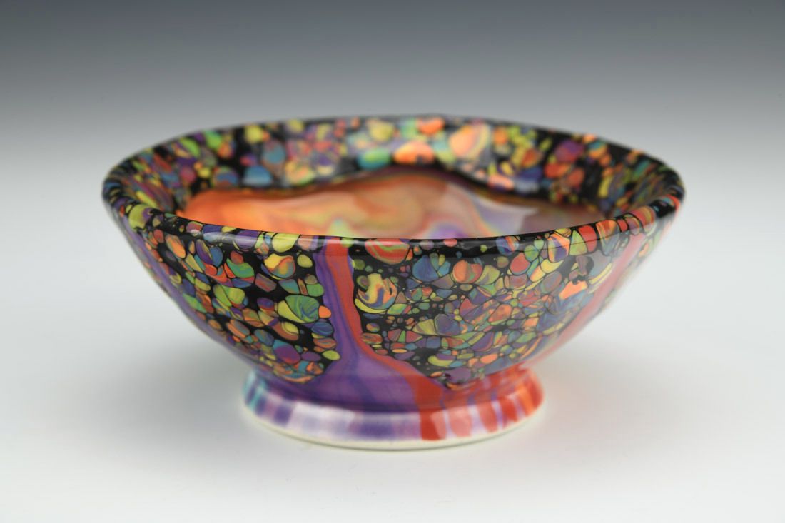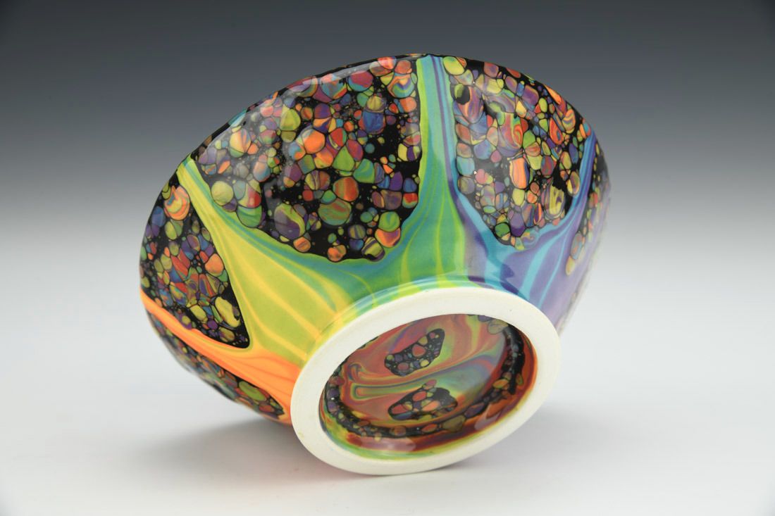 Porcelain, wheel thrown, many layered glazes, cone 7 electric fired, multiple firings, 2 x 5 x 5 inches.