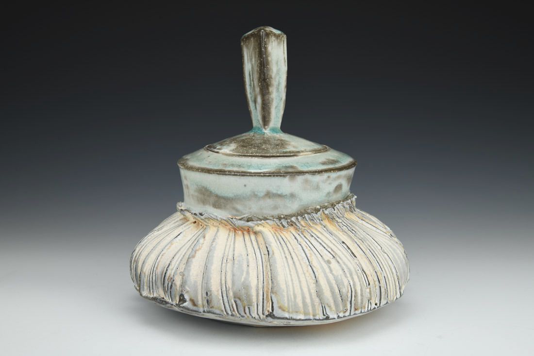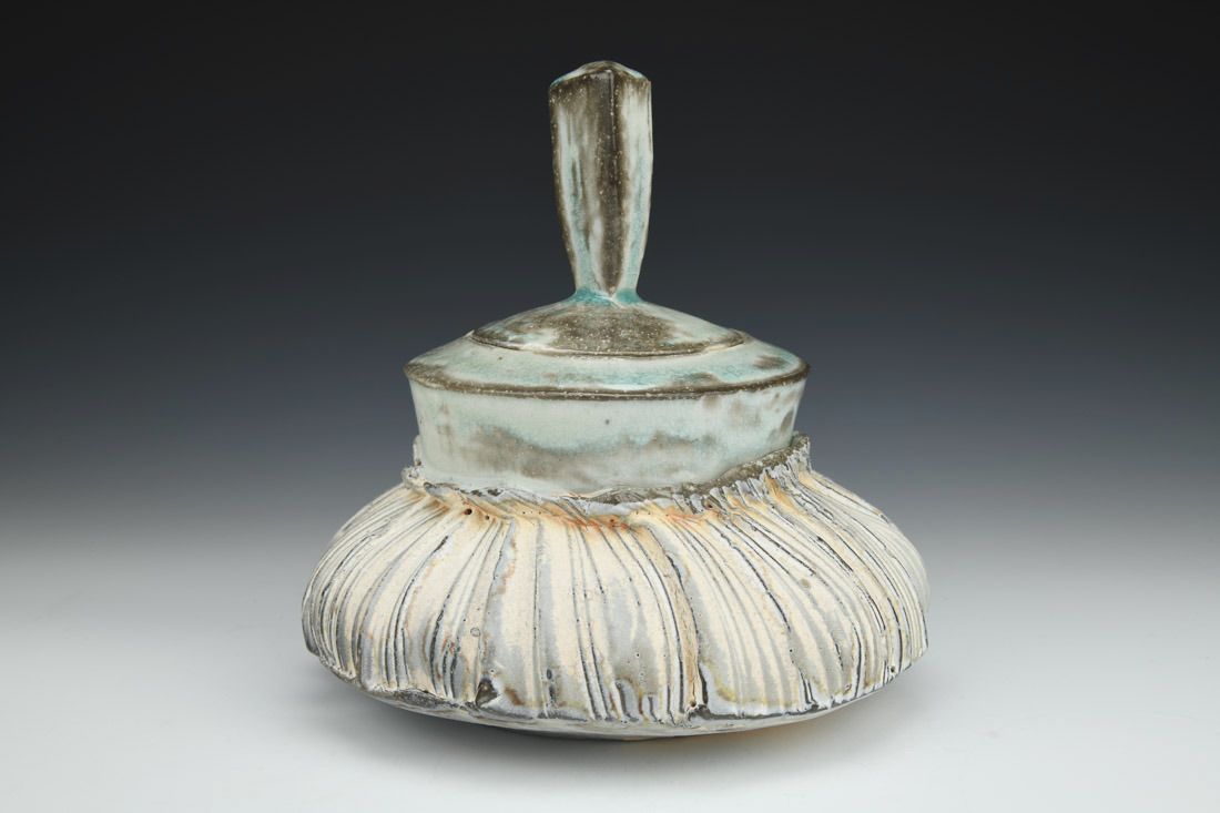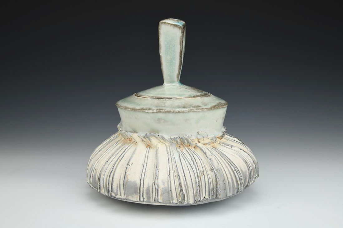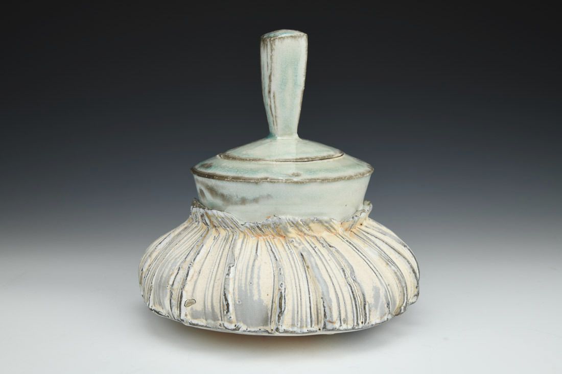 Porcelain, wheel thrown and altered, cone 11 soda reduction fired, 8 x 8 x 8 inches.