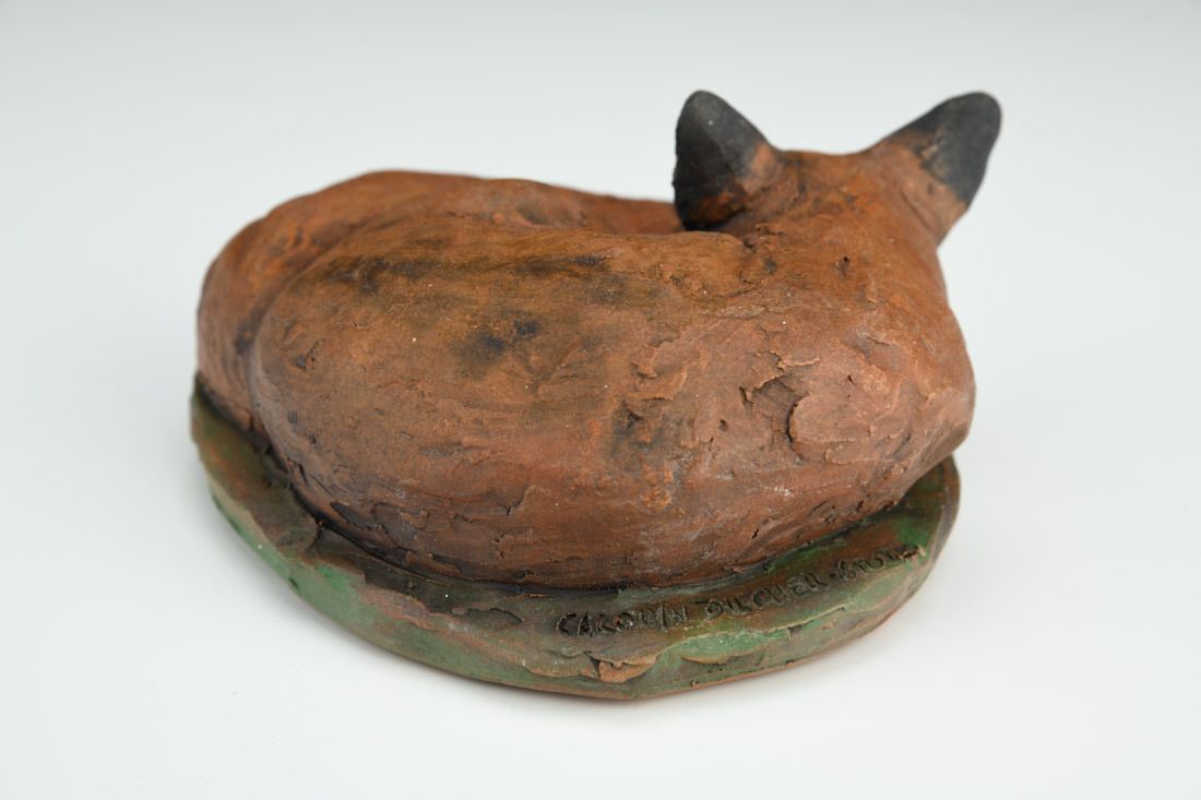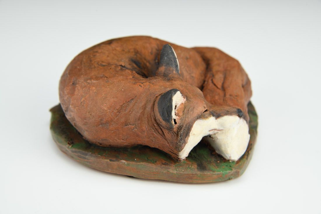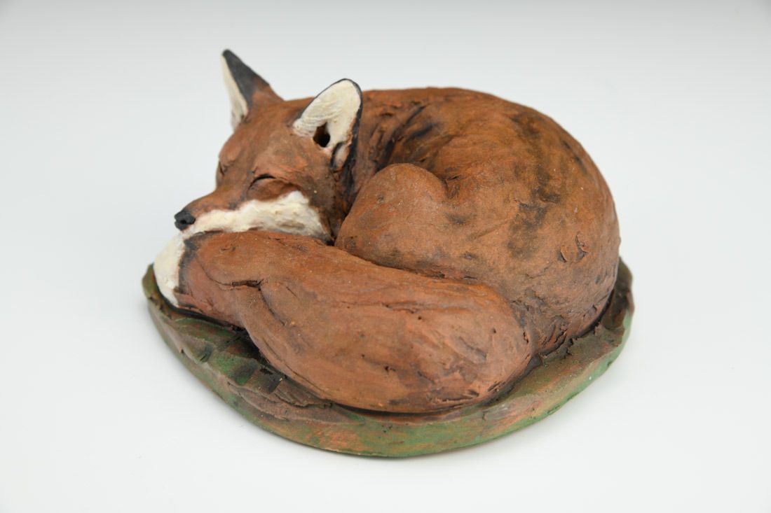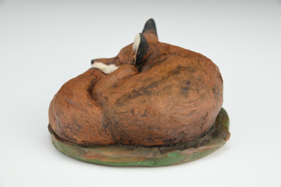 Stoneware, hand built, oxide washes, underglazes, low fired 2.25 x 5 x 5 inches.