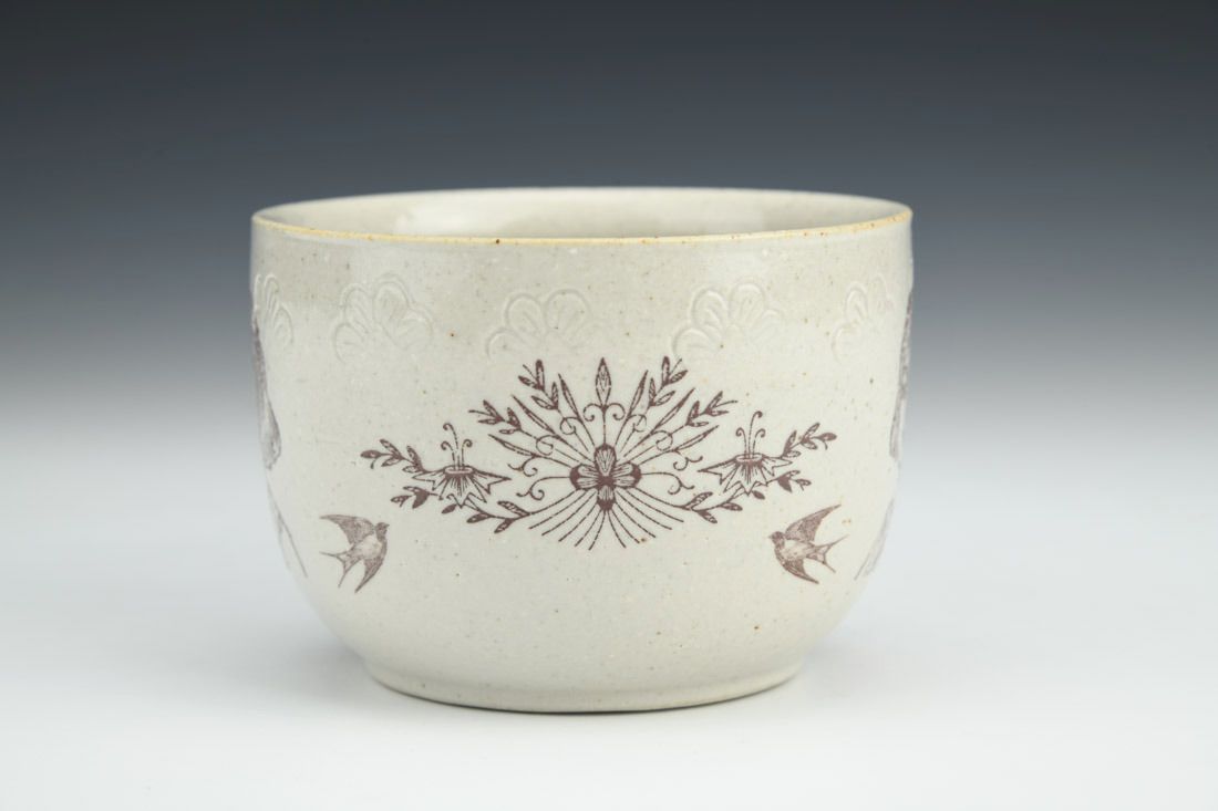 Stoneware, wheel thrown, shino glaze, oxide decals, reduction fired, 2.75 x 5.5 x 4 inches.