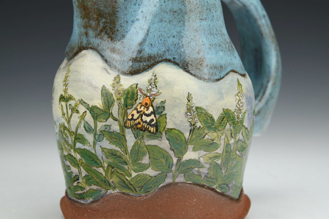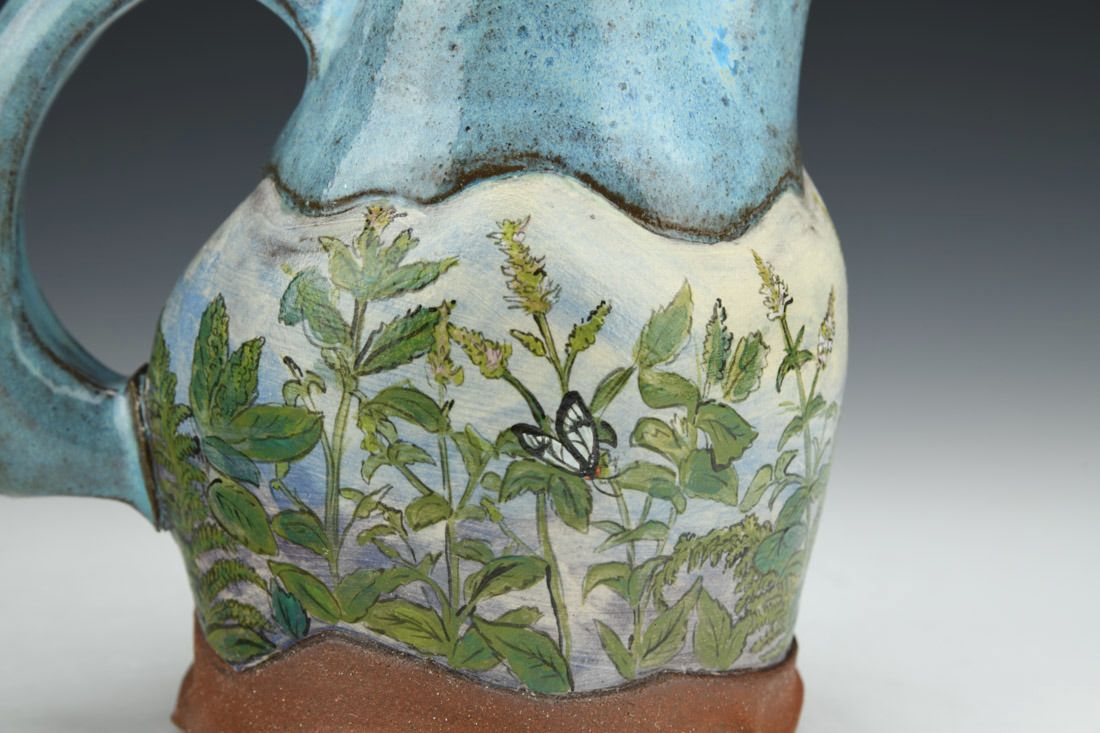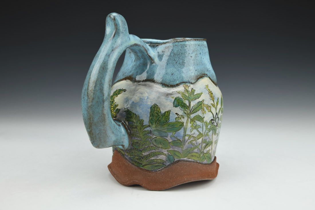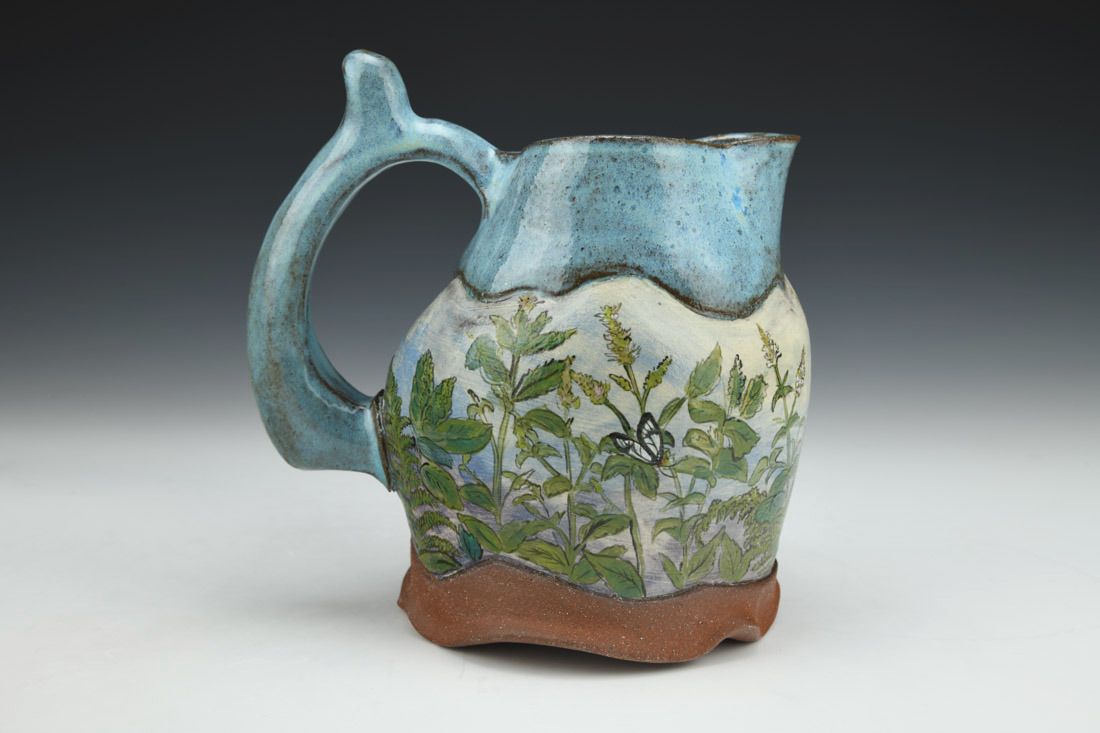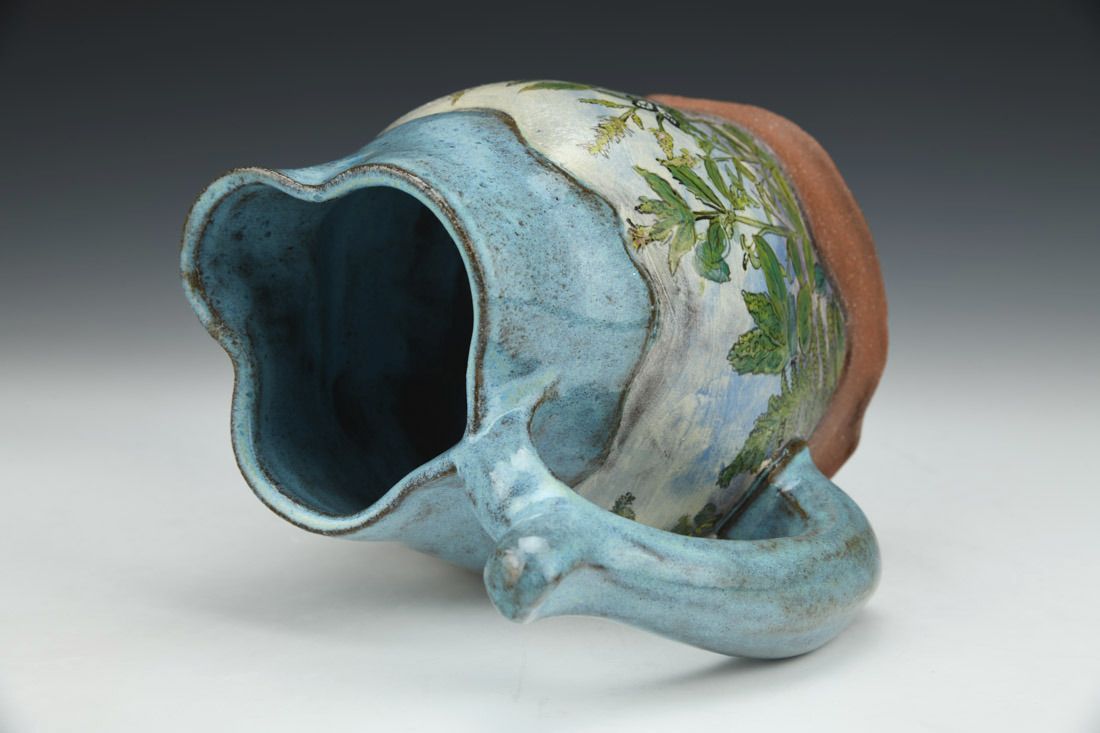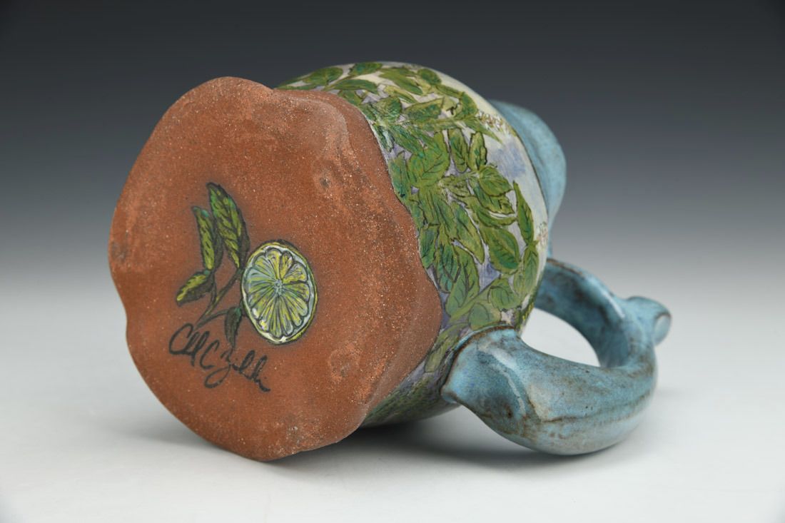 Iron rich stoneware with wood and cork cap, wheel thrown and altered with hollow slump-molded handle, white slip, underglze, glaze, cone 5 oxidation fired, 6.75 x 6.75 x 5.25 inches.