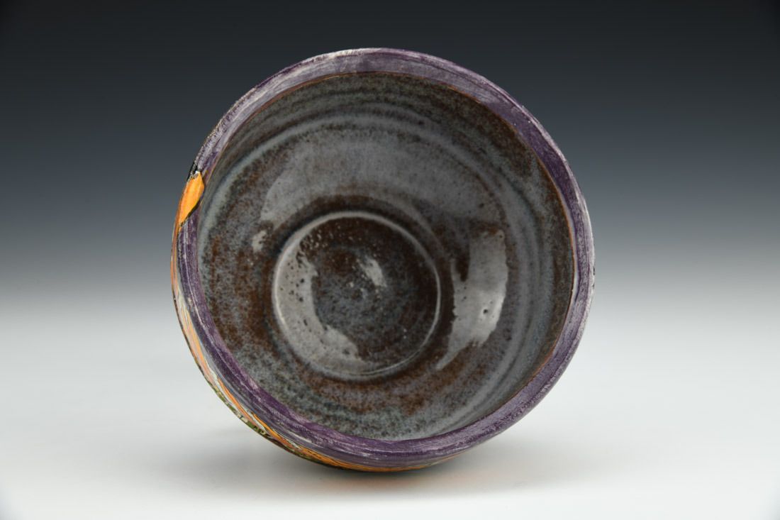 Iron rich stoneware, wheel thrown and altered, glaze, underglaze, cone 5 oxidation fired with 15 minute soak, 2.5 x 4.25 x 4.25 inches.