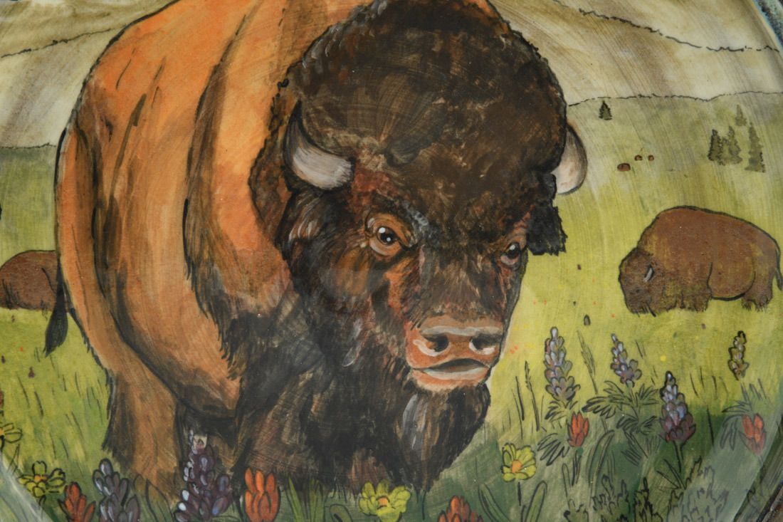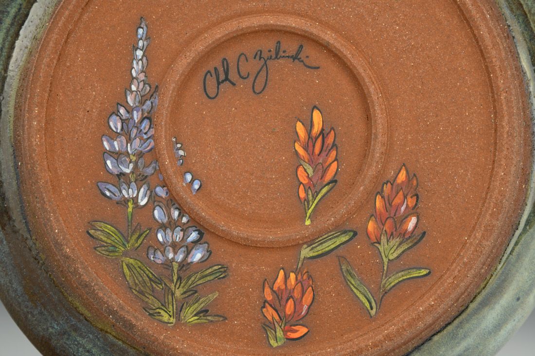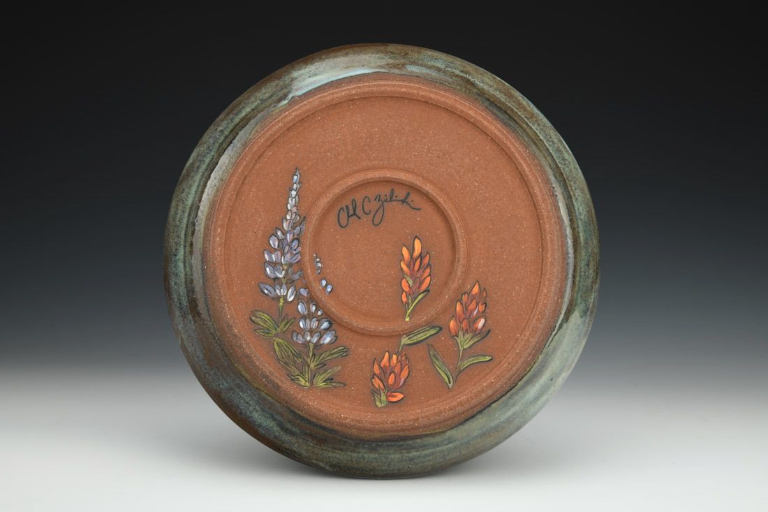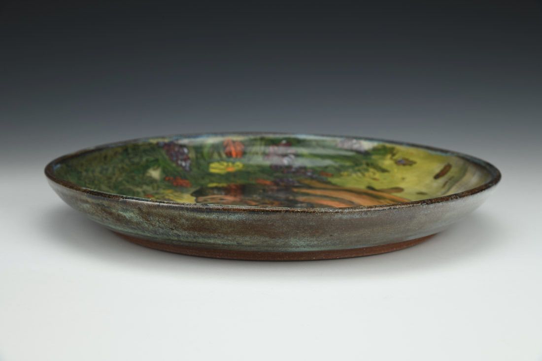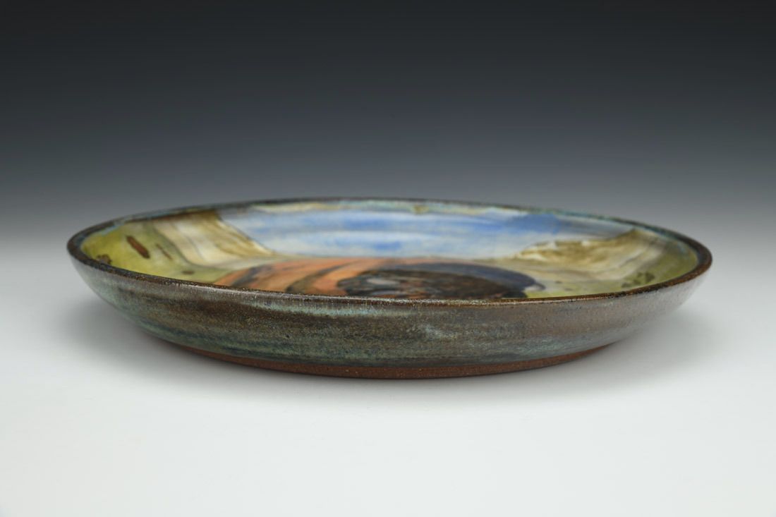 Iron rich stoneware, wheel thrown and altered, slip, glaze, underglaze, cone 6 electric fired , 1.5 x 10.5 x 10.5 inches.