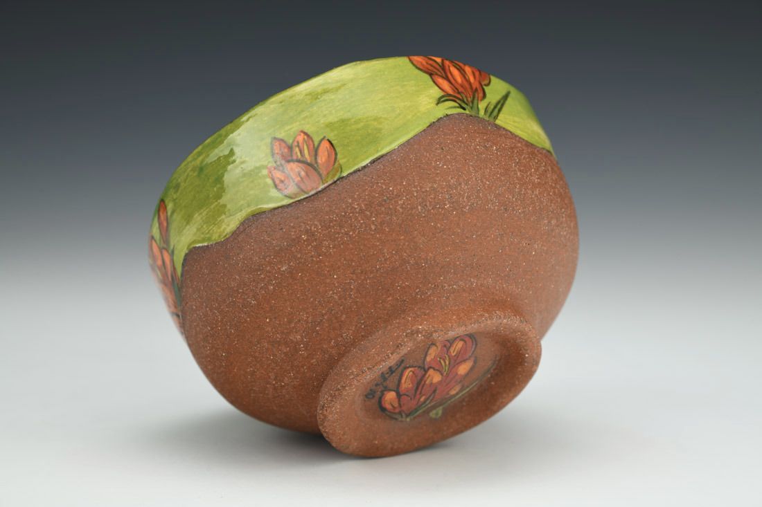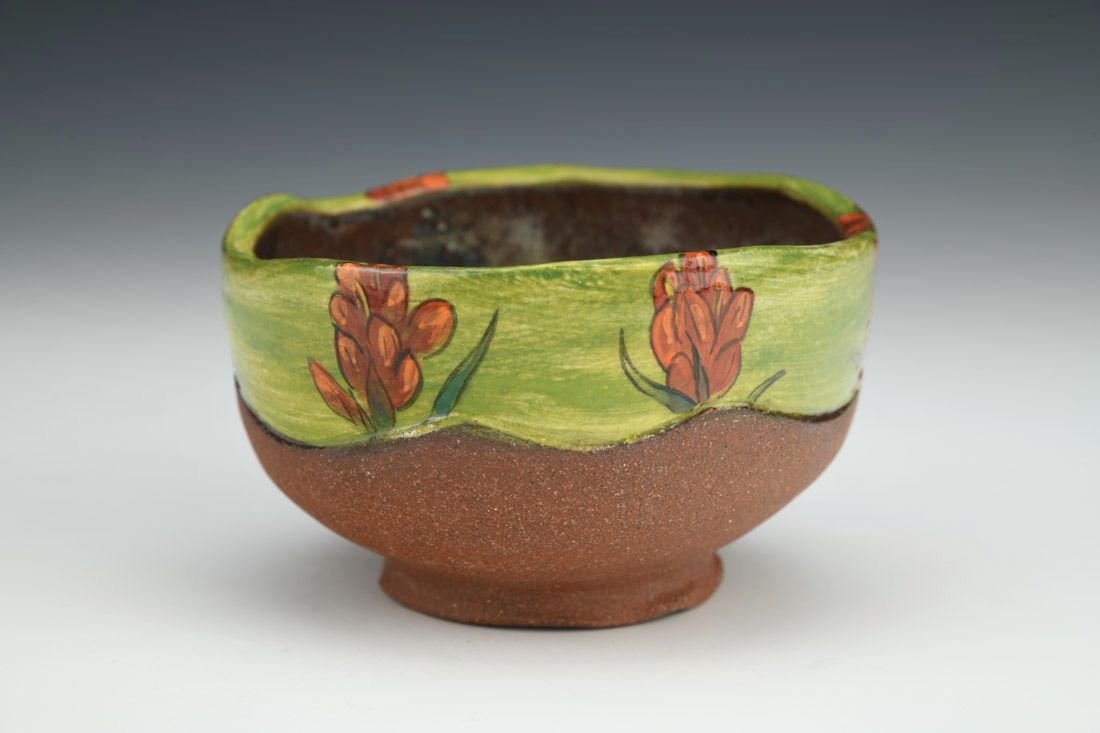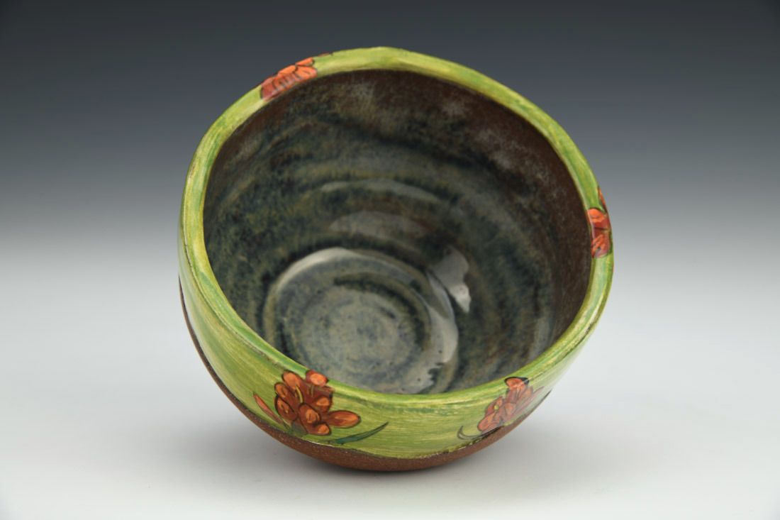 Iron rich stoneware, wheel thrown and altered, slip, glaze, underglaze, cone 6 electric fired , 2.5 x 4 x 4 inches.