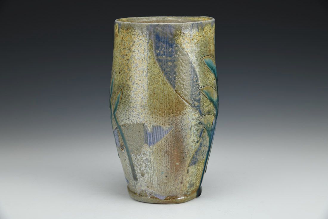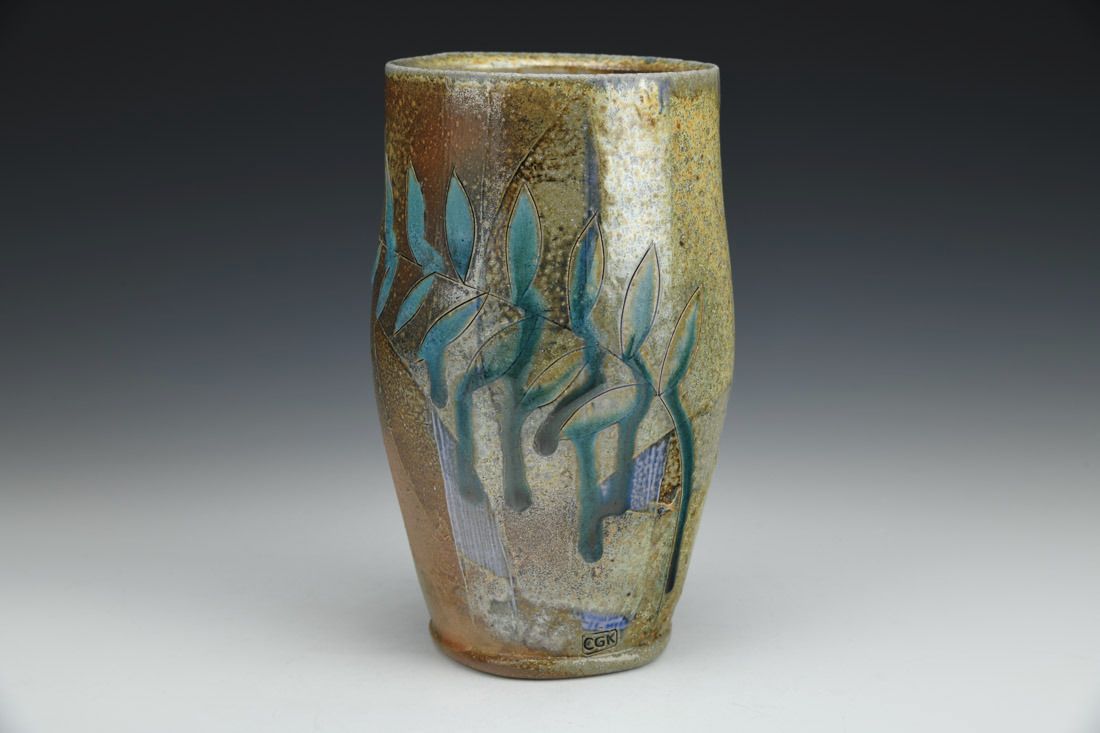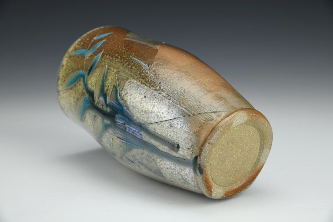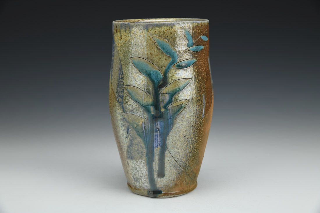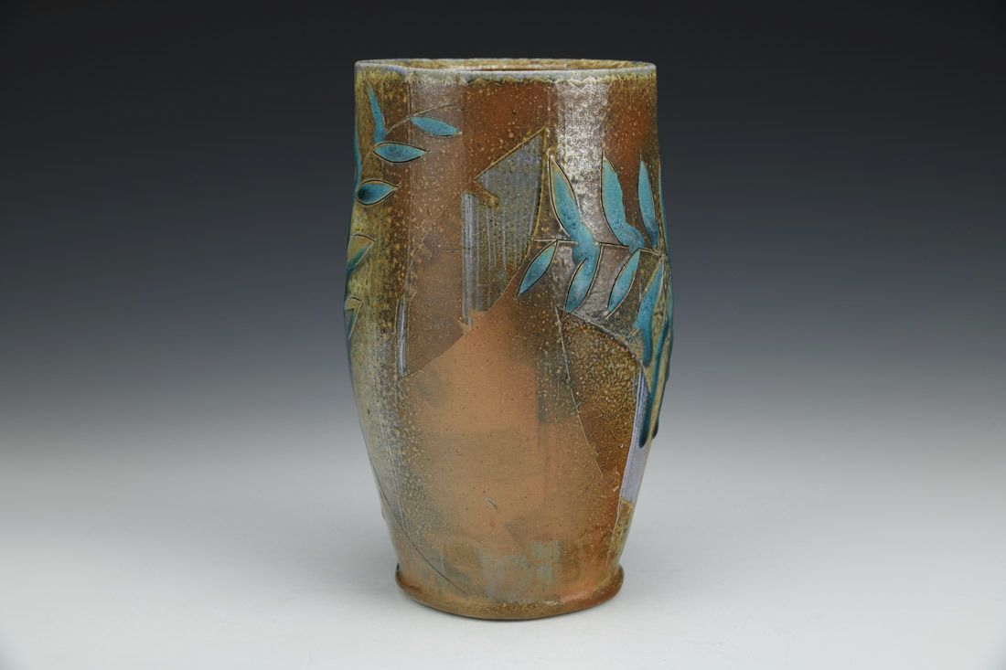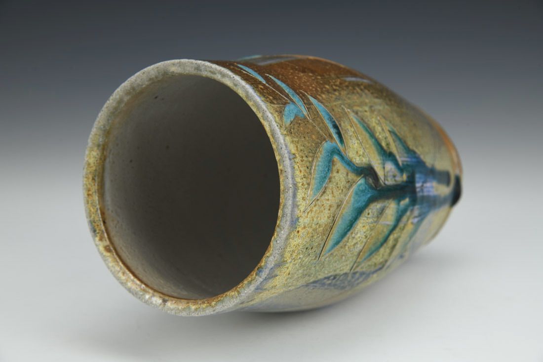 Brown stoneware, wheel thrown, soda slip, glaze, soda fired, 7 x 4 x 4 inches.