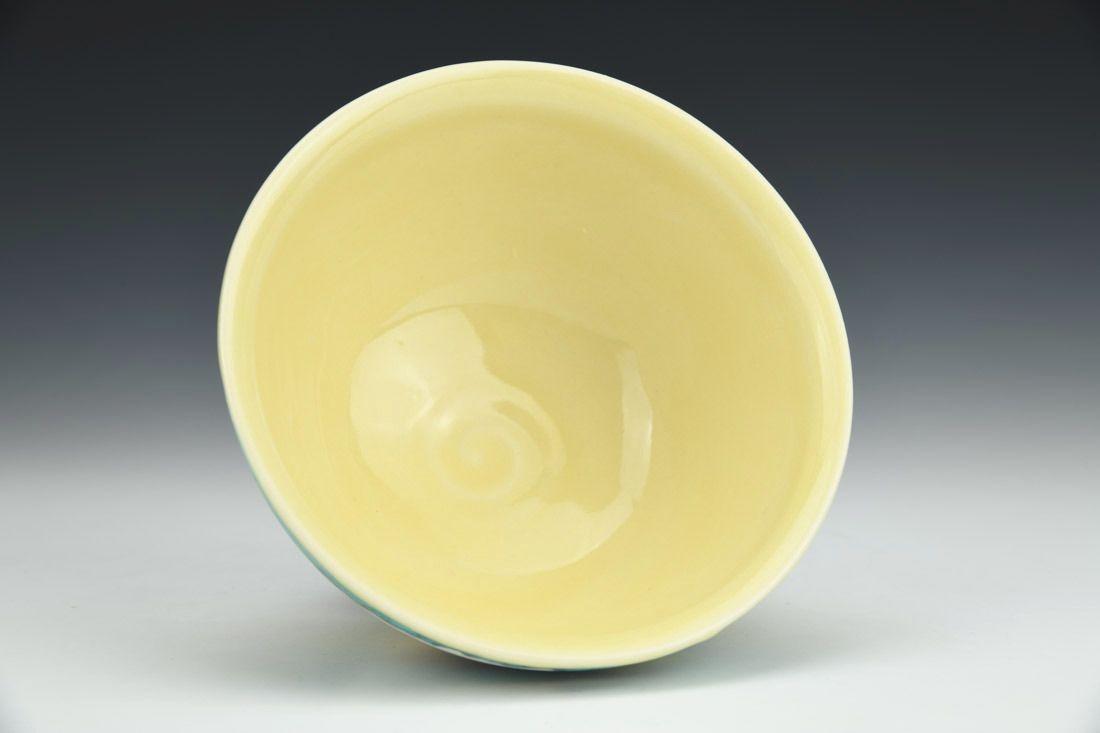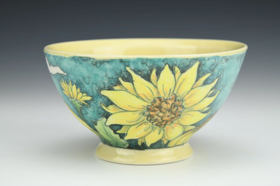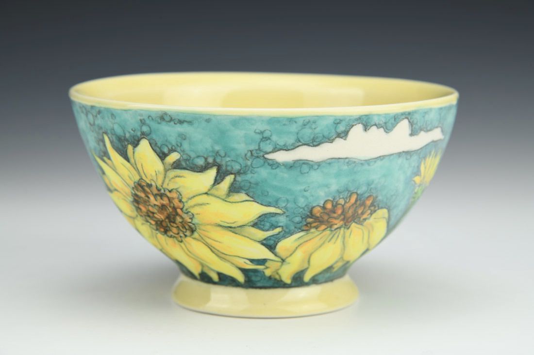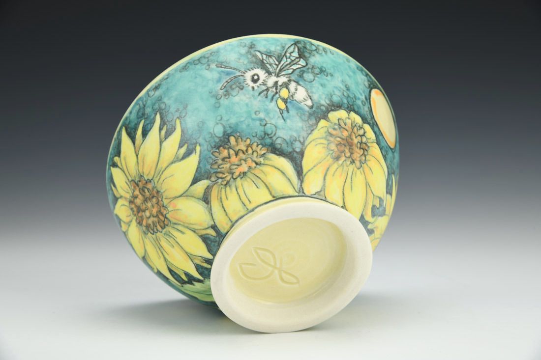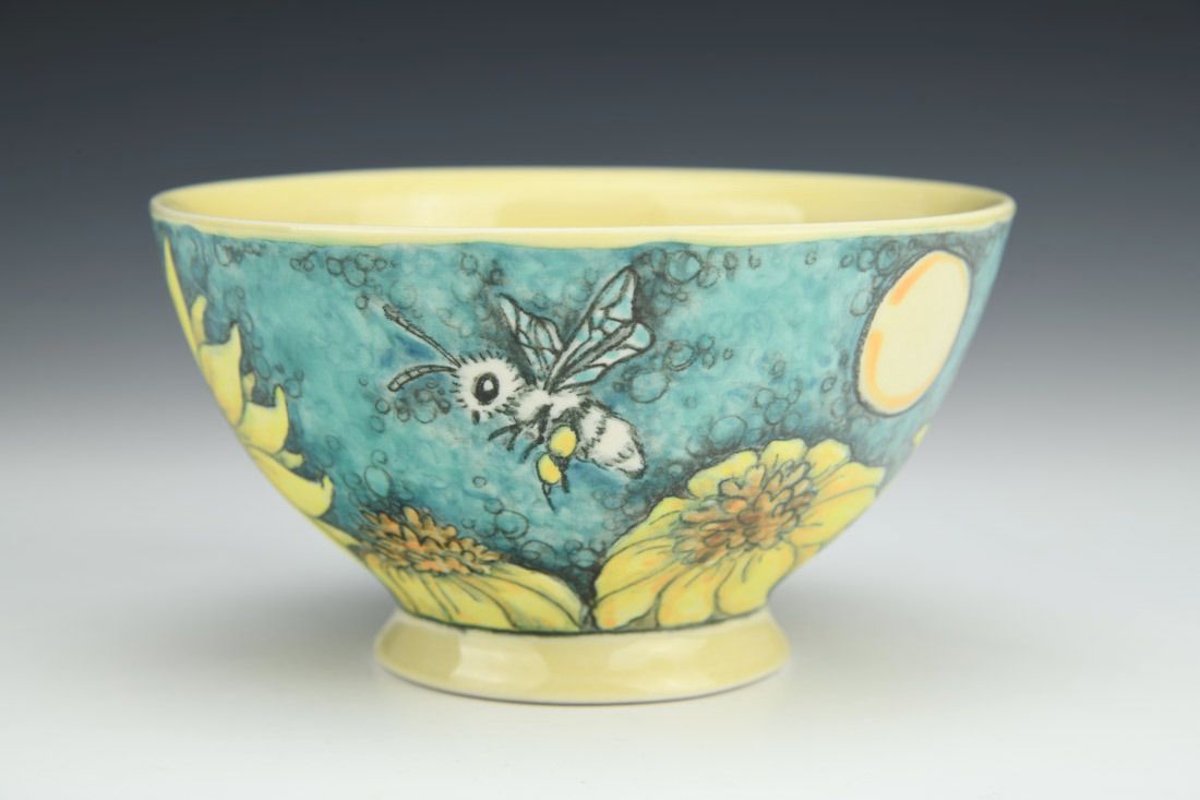 Porcelain, wheel thrown, underglaze pencil illustration, underglaze washes, cone 6 fired, 2.75 x 5 x 5 inches.
