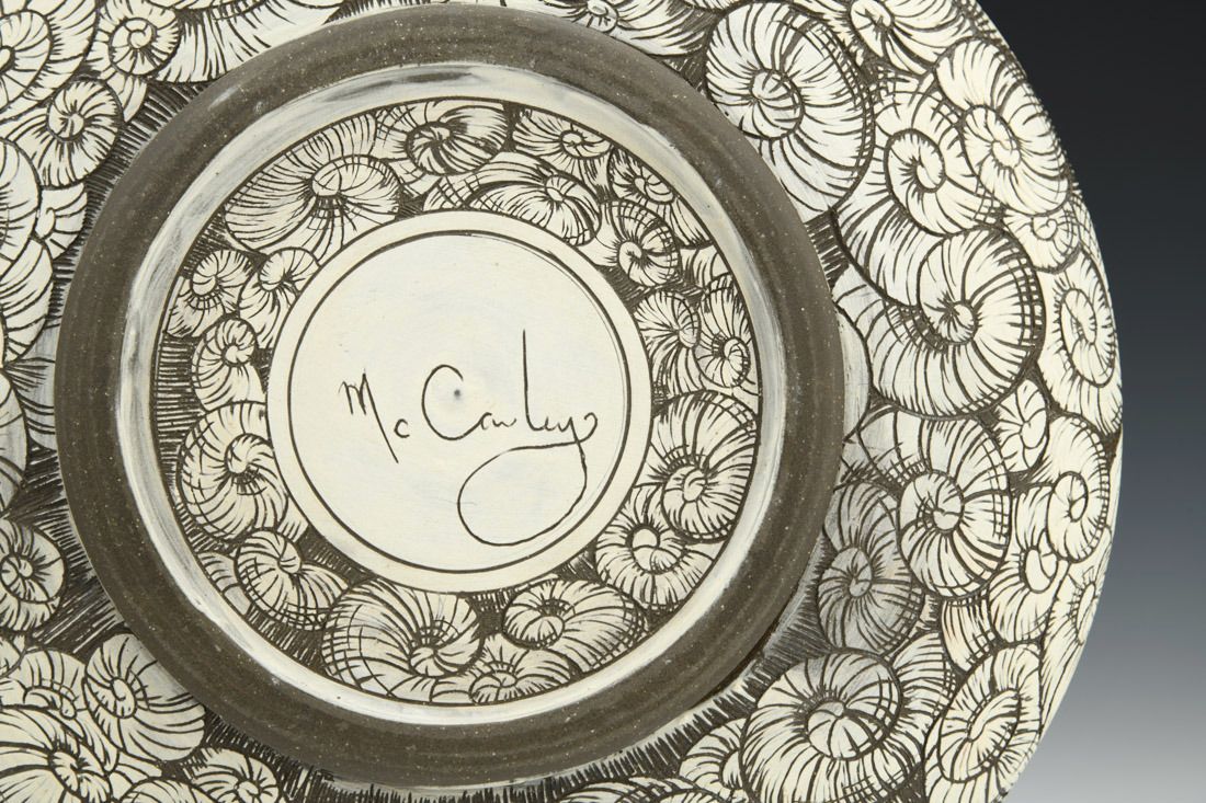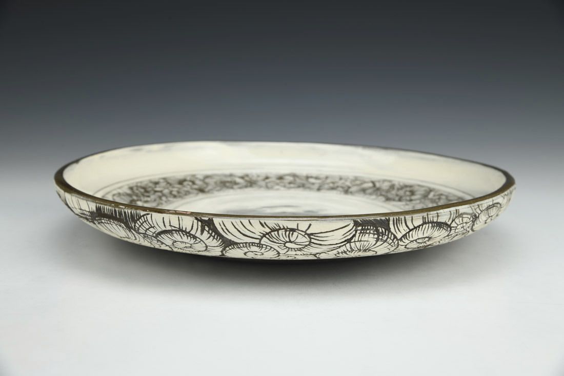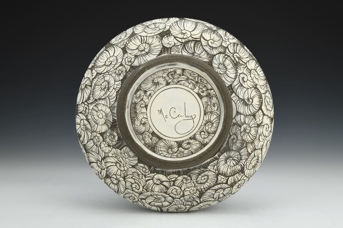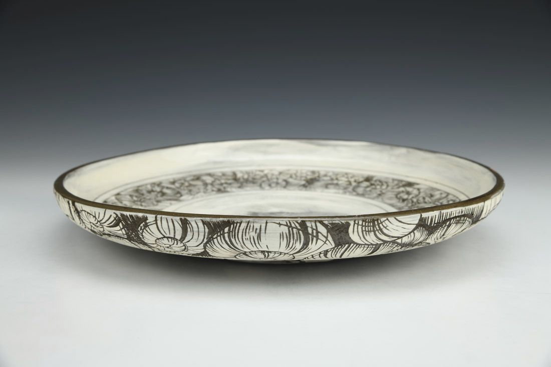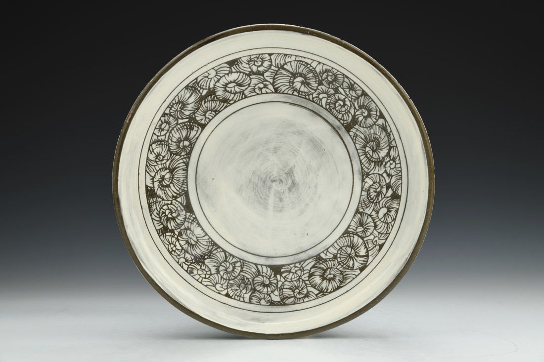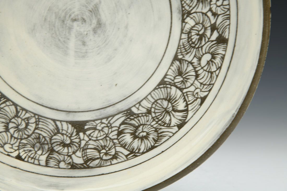 Brown stoneware, wheel thrown, sgraffito, white slip, glaze, cone 5 oxidation fired, 1.5 x 10.5 x 10.5 inches.