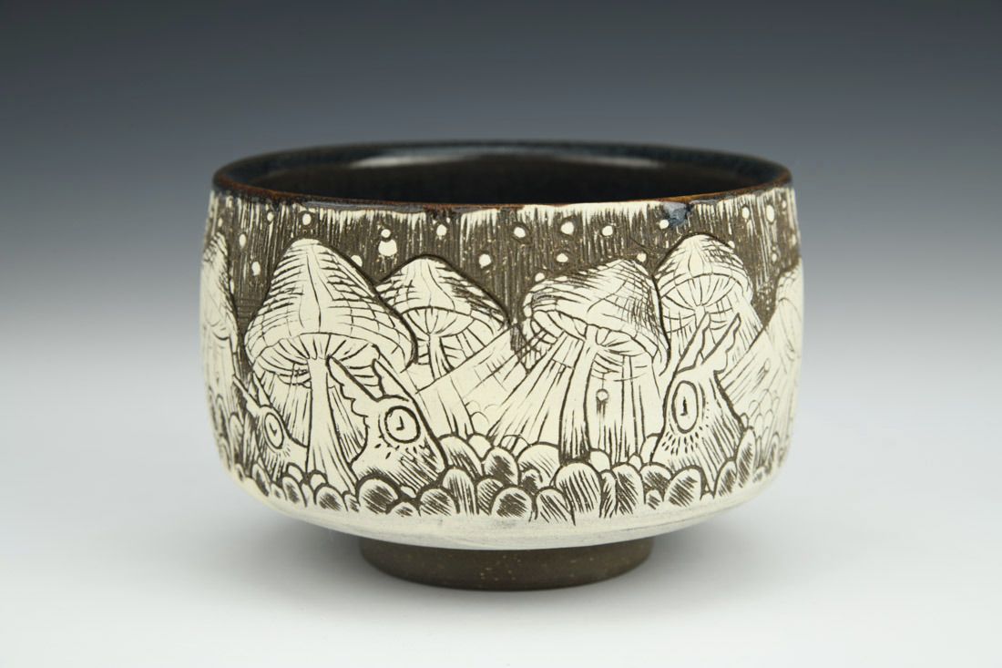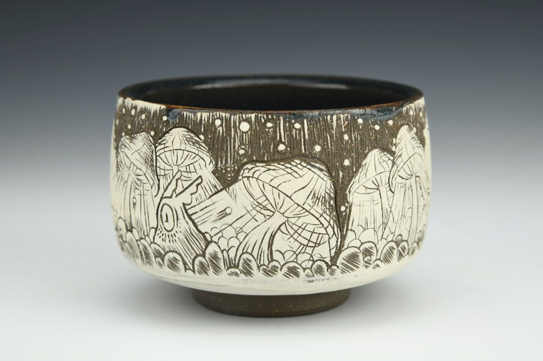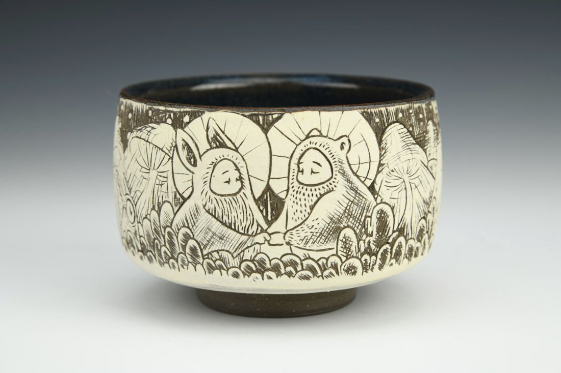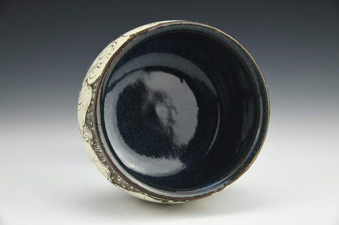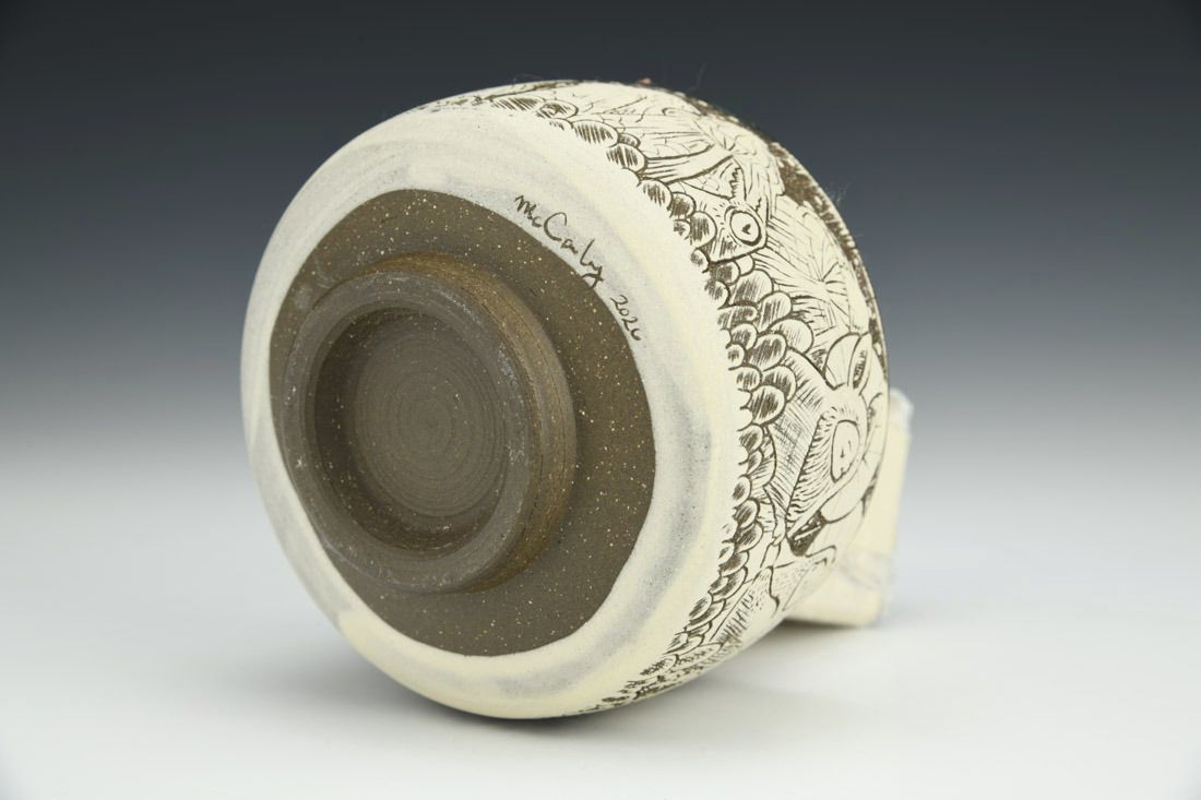Stoneware, wheel thrown, sgrafitto, slip, glaze, cone 6 oxidation fired, 2.75 x 4 x 4 inches.