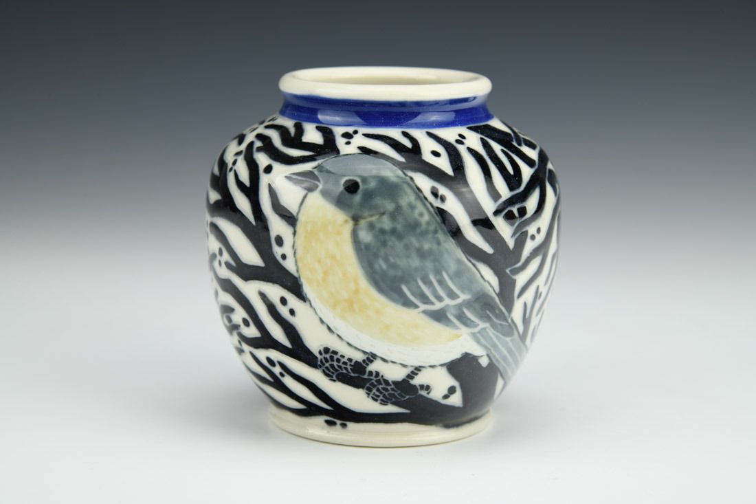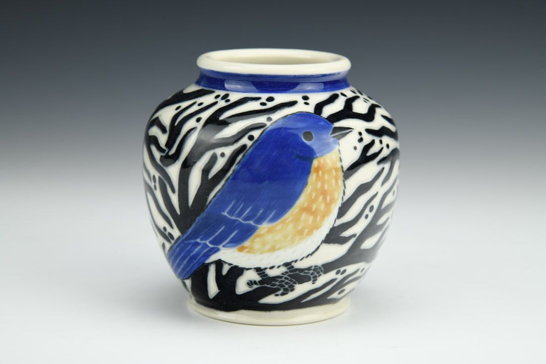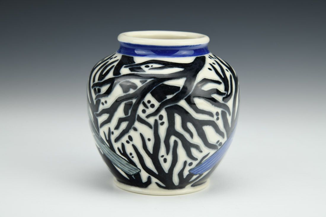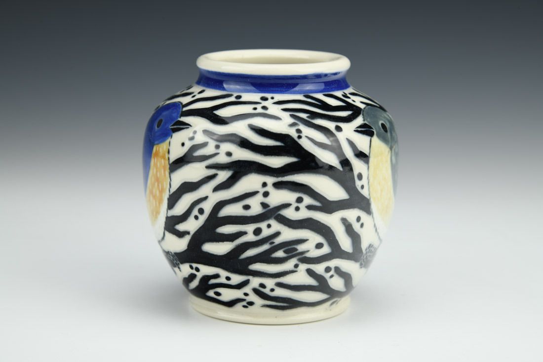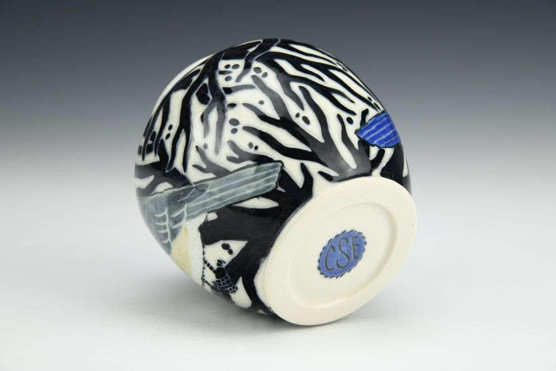 Porcelain, wheel thrown, hand painted, sgraffito, underglaze, underglaze inlaid, glaze, cone 6 oxidation fired, 3.75 x 3.75 x 3.75 inches.