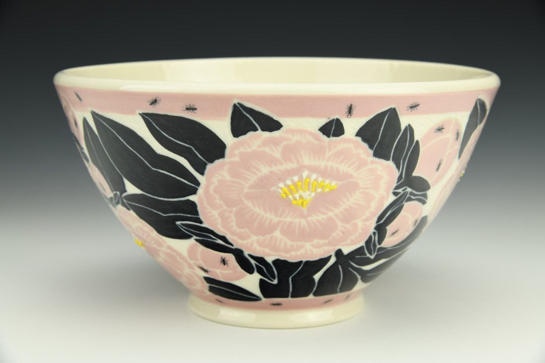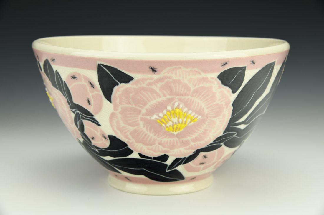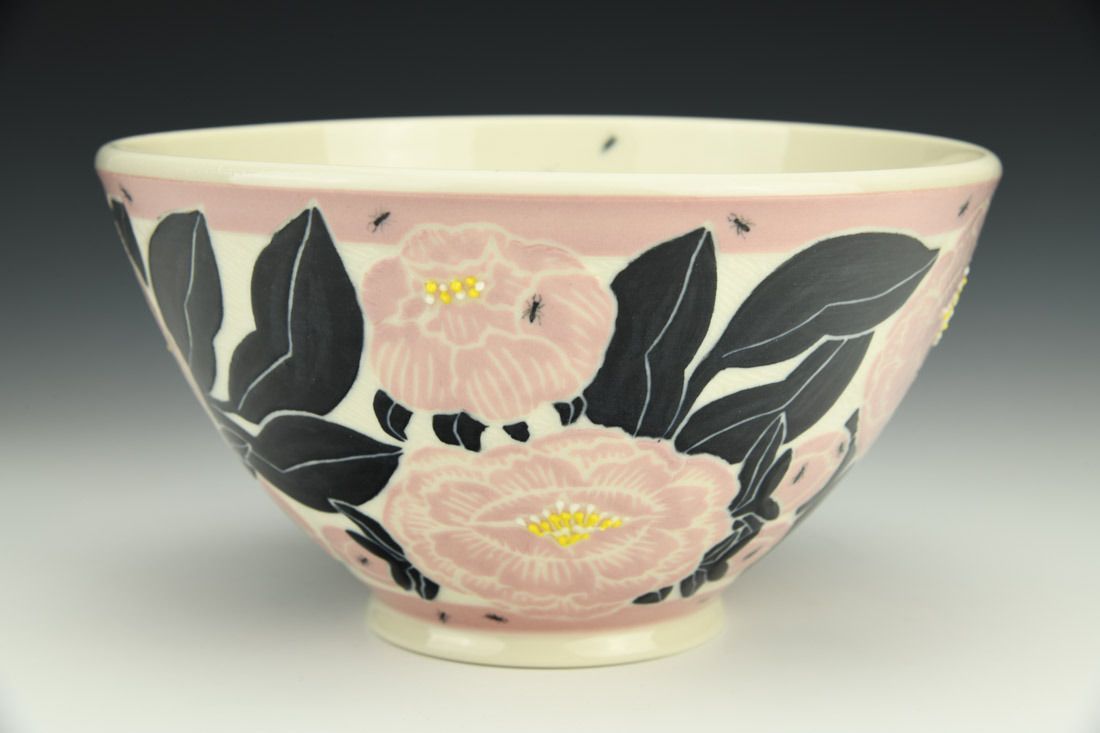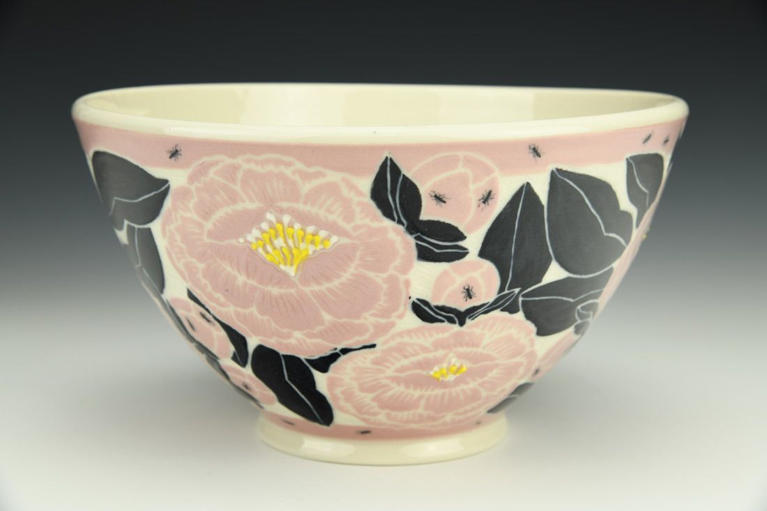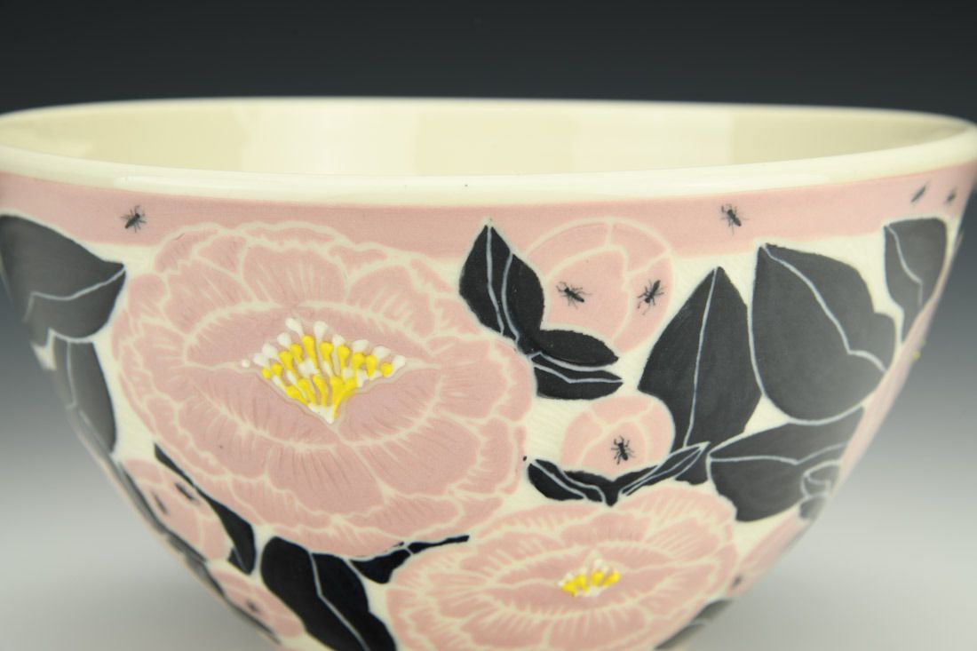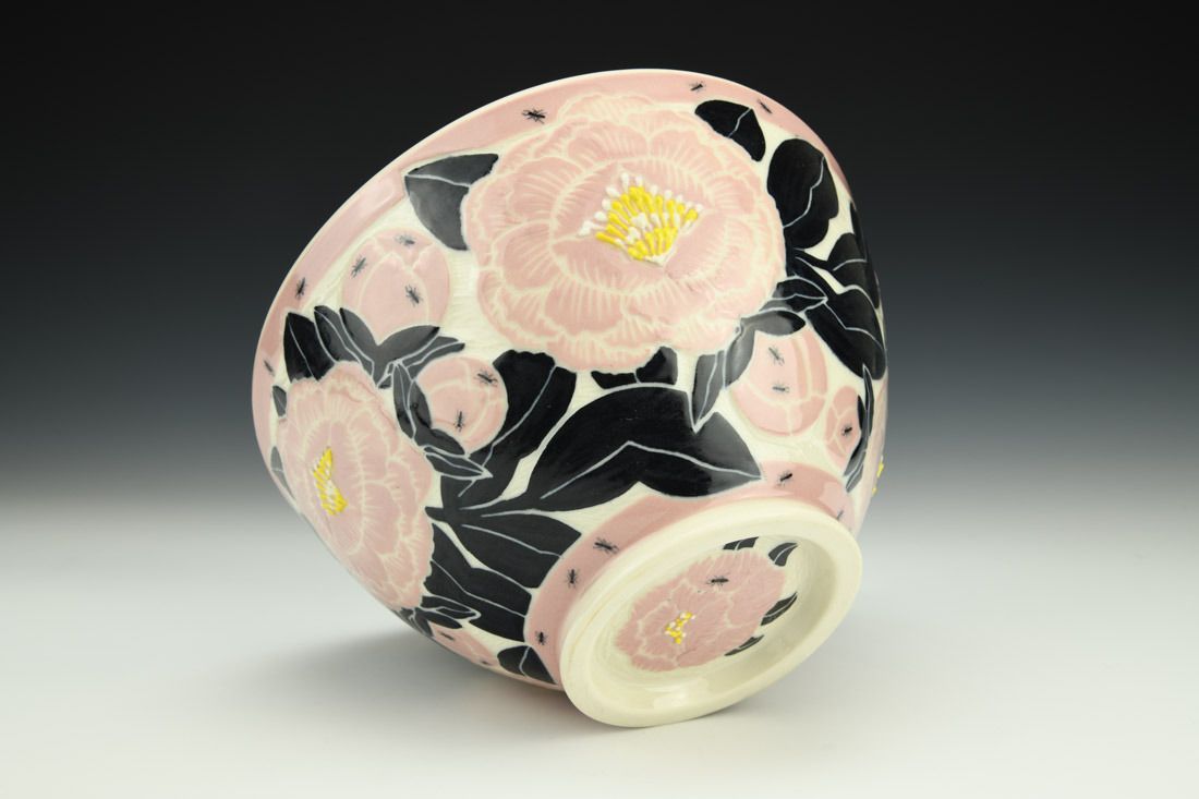 Porcelain, wheel thrown, sgraffito, colored slips, slip trailed, underglaze, glaze, cone 6 oxidation fired, 4.5 x 8 x 8 inches.