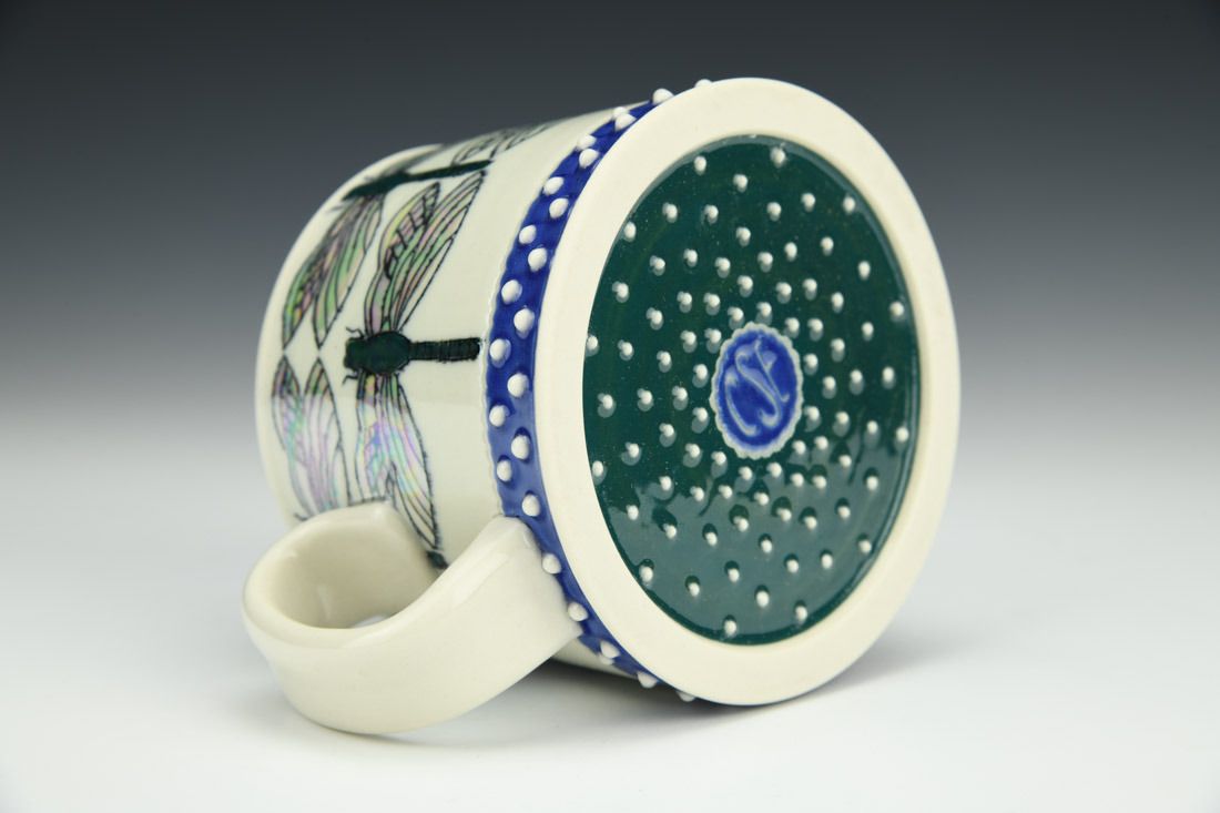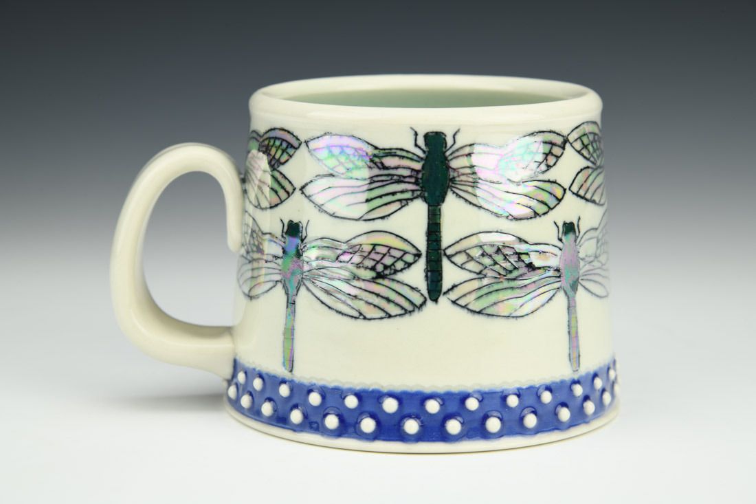 Porcelain, wheel thrown, slip trailed, underglaze inlay, glaze, luster, cone 6 oxidation fired, 3 x 3.75 x 3.25 inches.