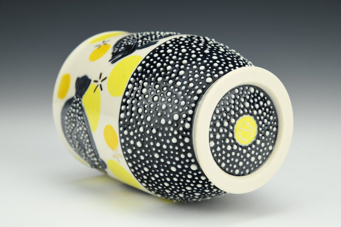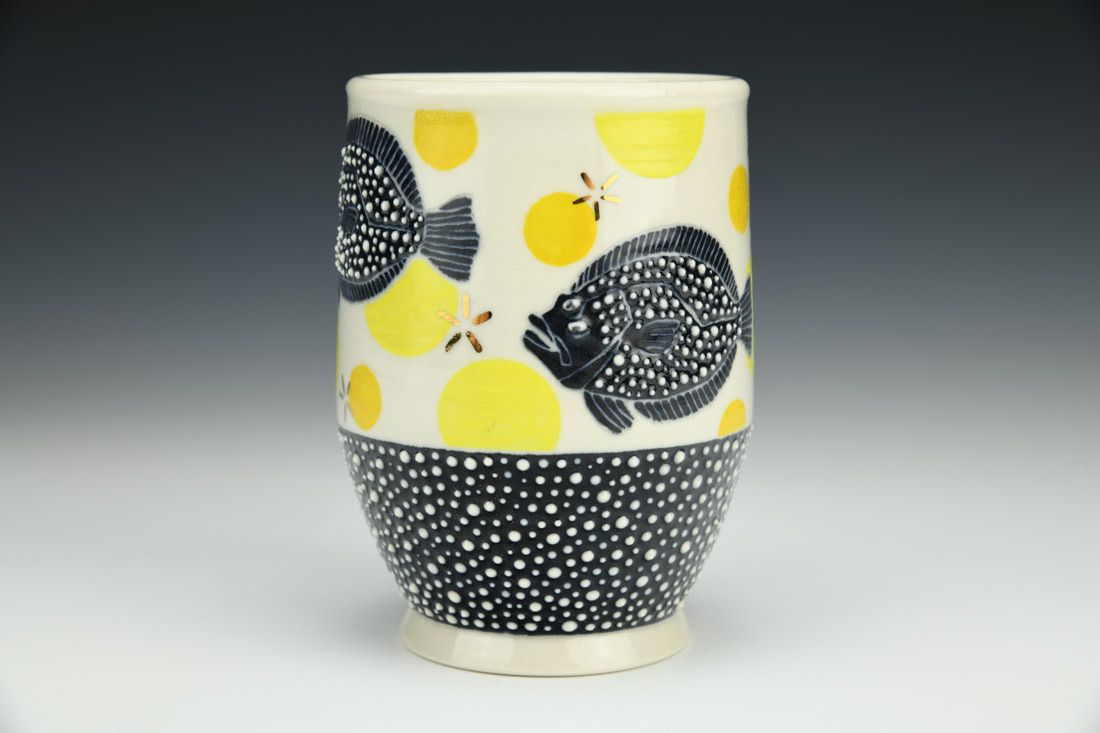 Porcelain, wheel thrown, slip trailed, underglaze painted, glaze, gold luster, cone 6 oxidation fired, 4.75 x 3.25 x 3.25 inches.