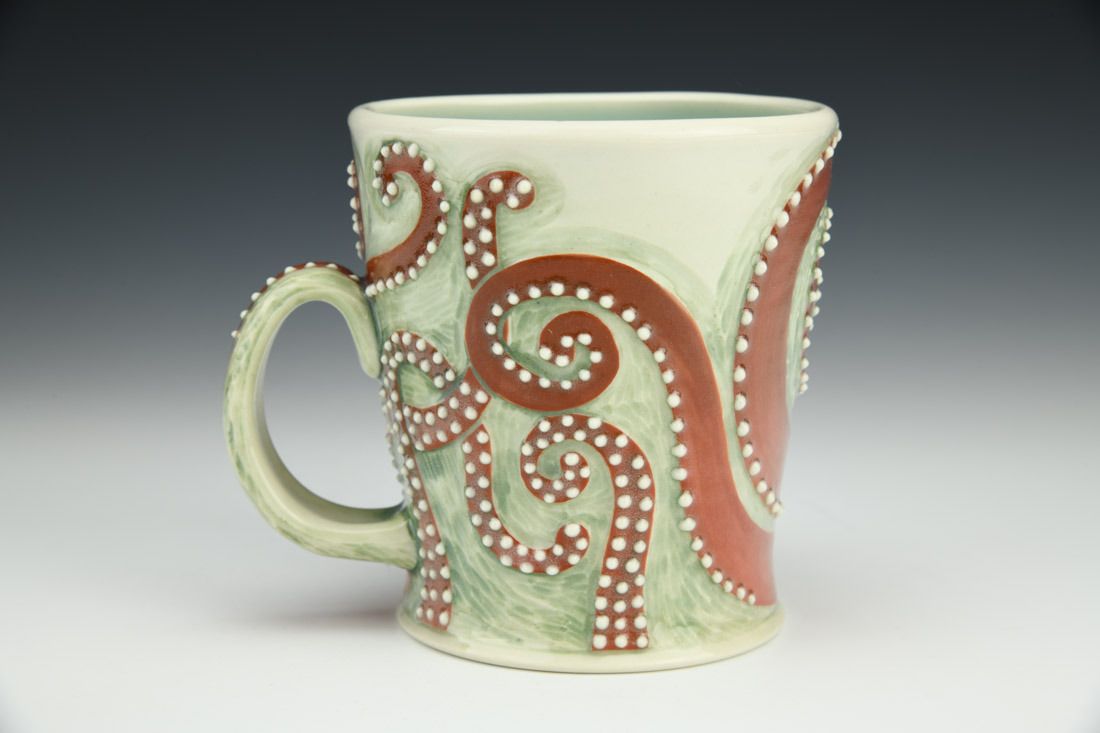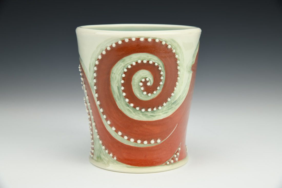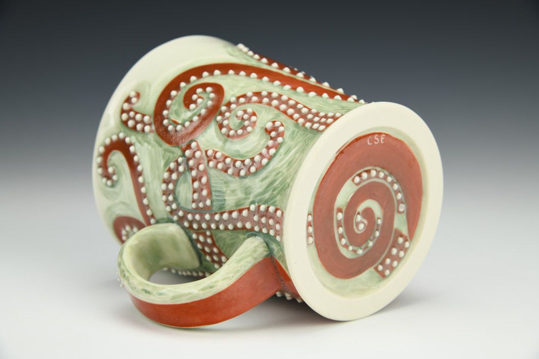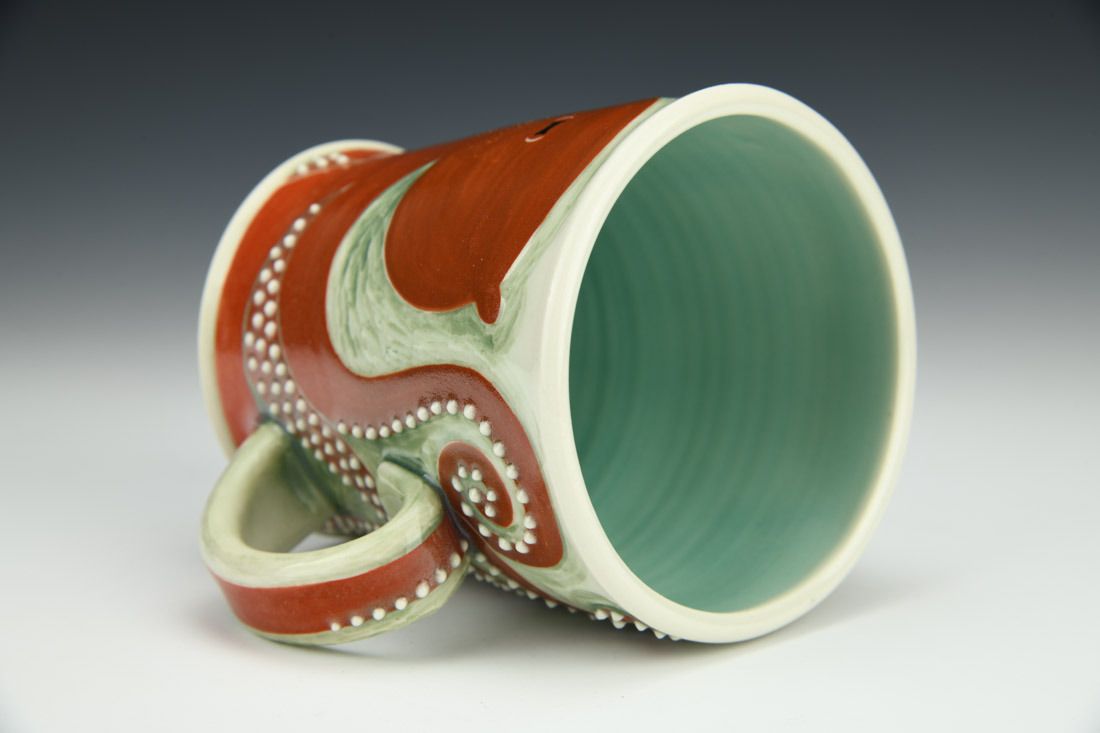 Porcelain, wheel thrown, slip trailed, underglaze, glaze, cone 6 oxidation fired, 4.5 x 3.75 x 3 inches.