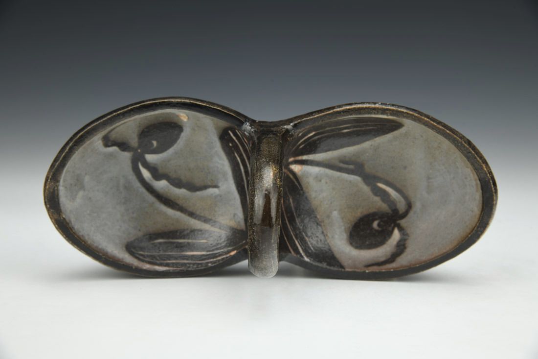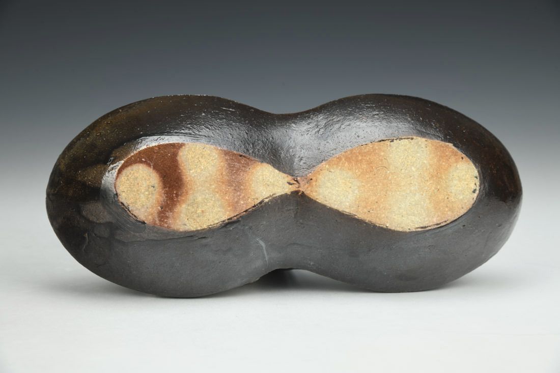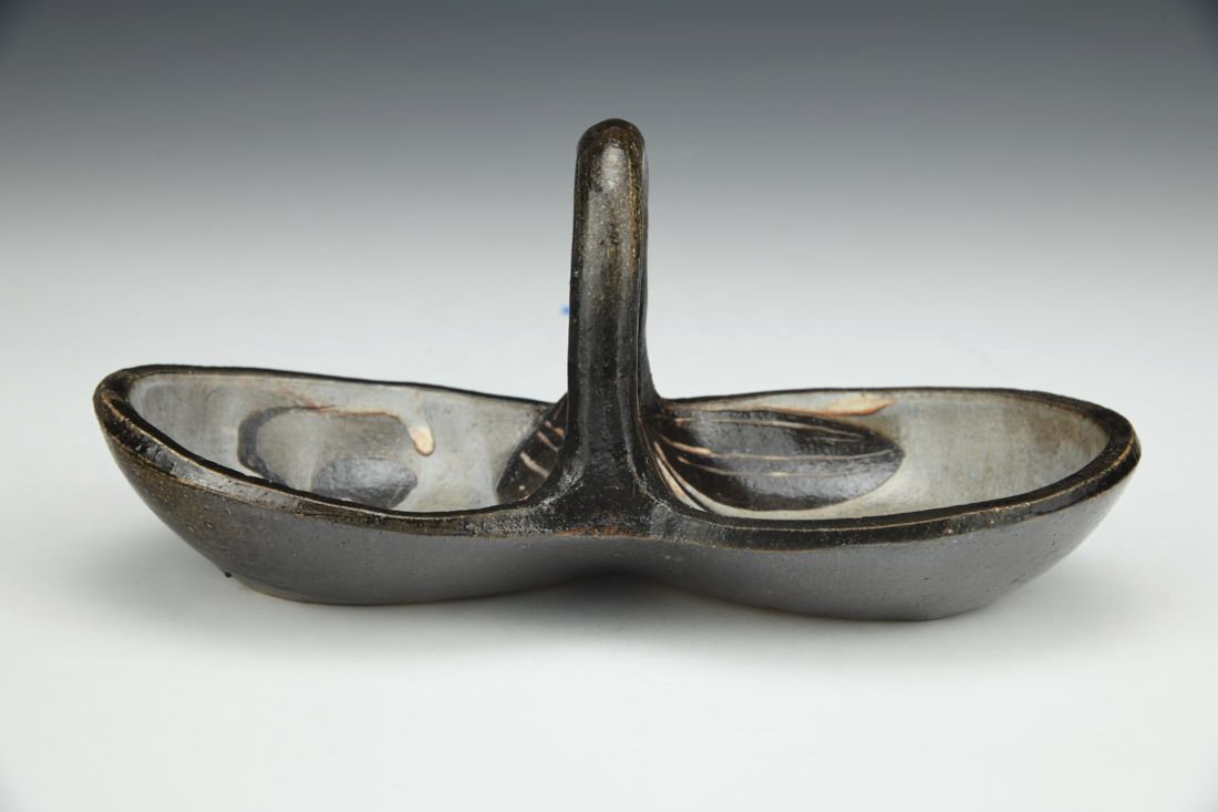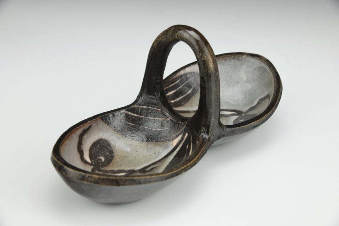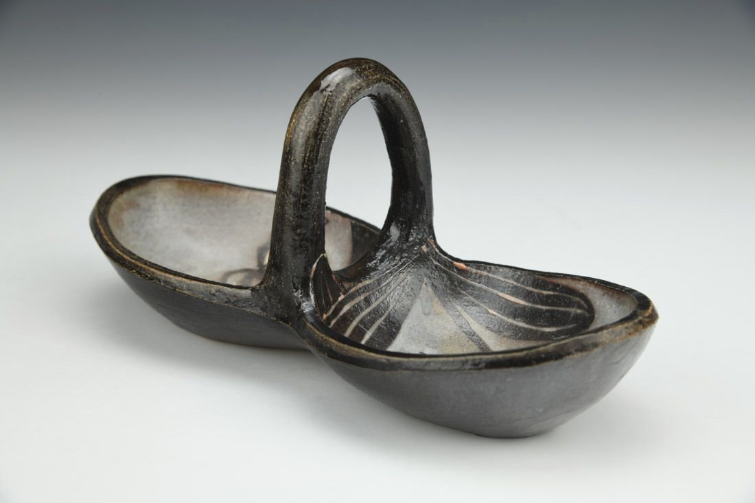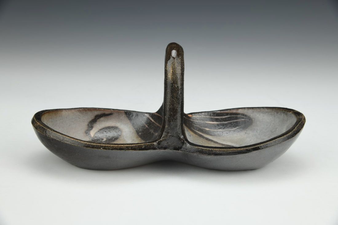 Stoneware, hand built, colored slips, hand painted wax resist decoration, salt glaze, cone 10 woodfired, 3.75 x 8 x 3.5 inches.