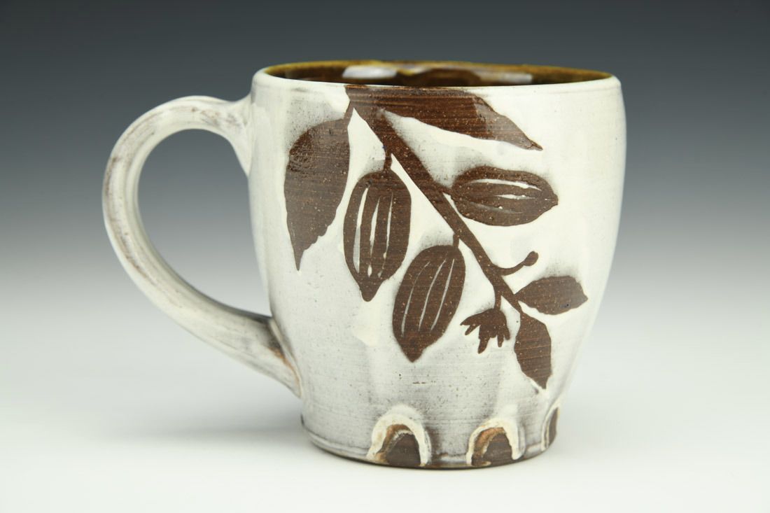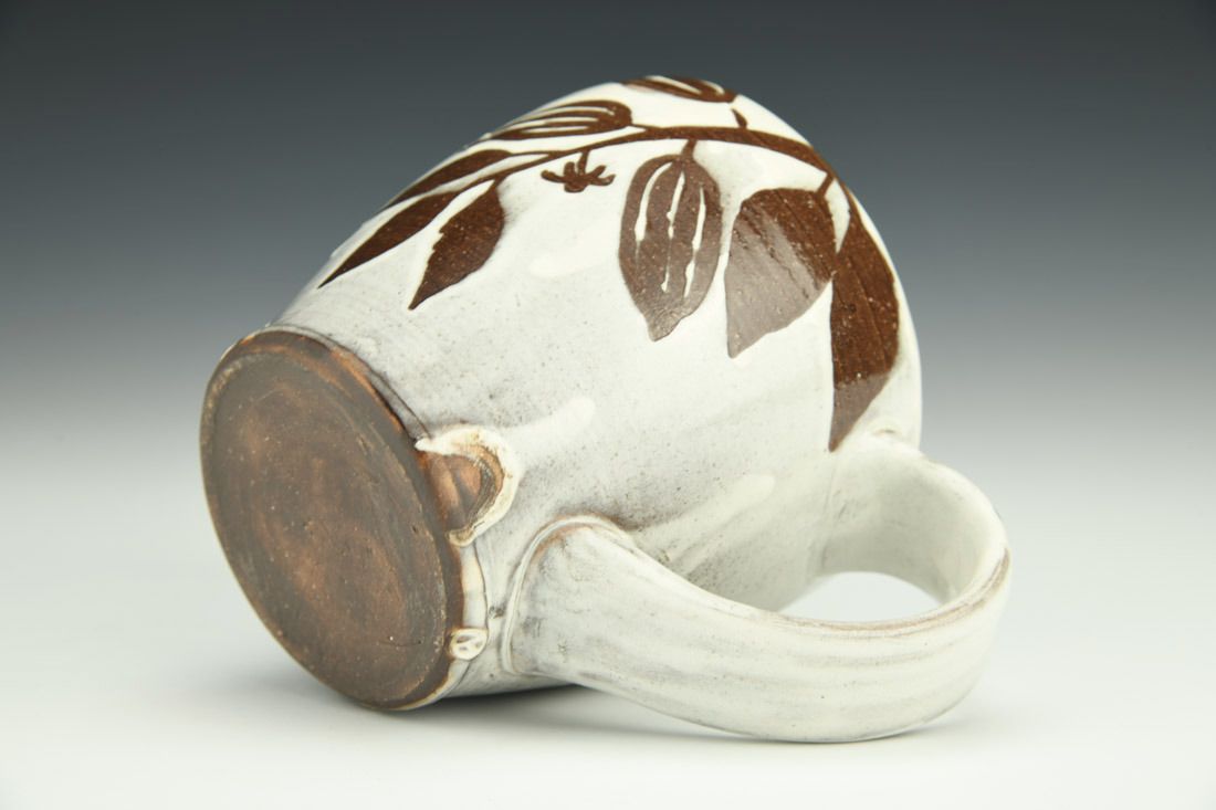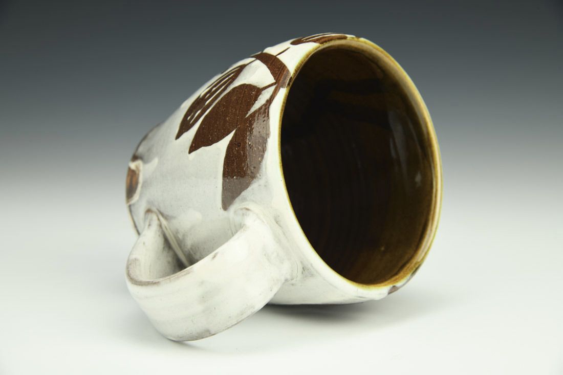 Stoneware, wheel thrown, wax resist brushwork, white slip, underglaze, glazes, cone 5 electric fired, 3.75 x 5 x 3.75 inches.
