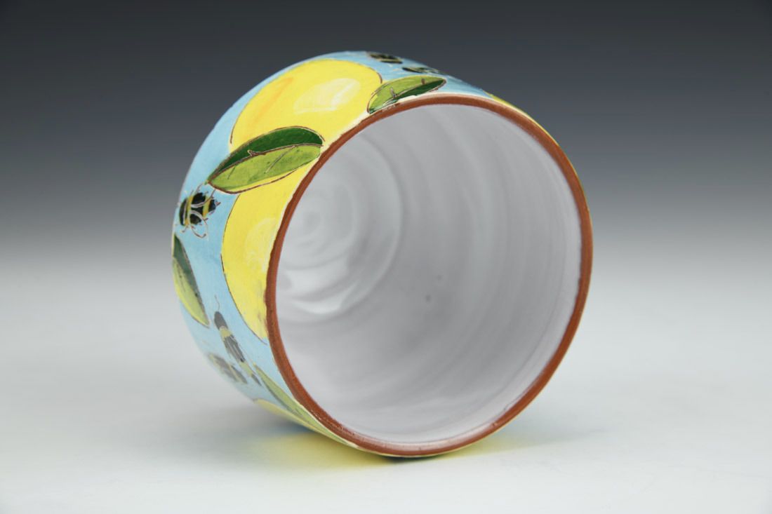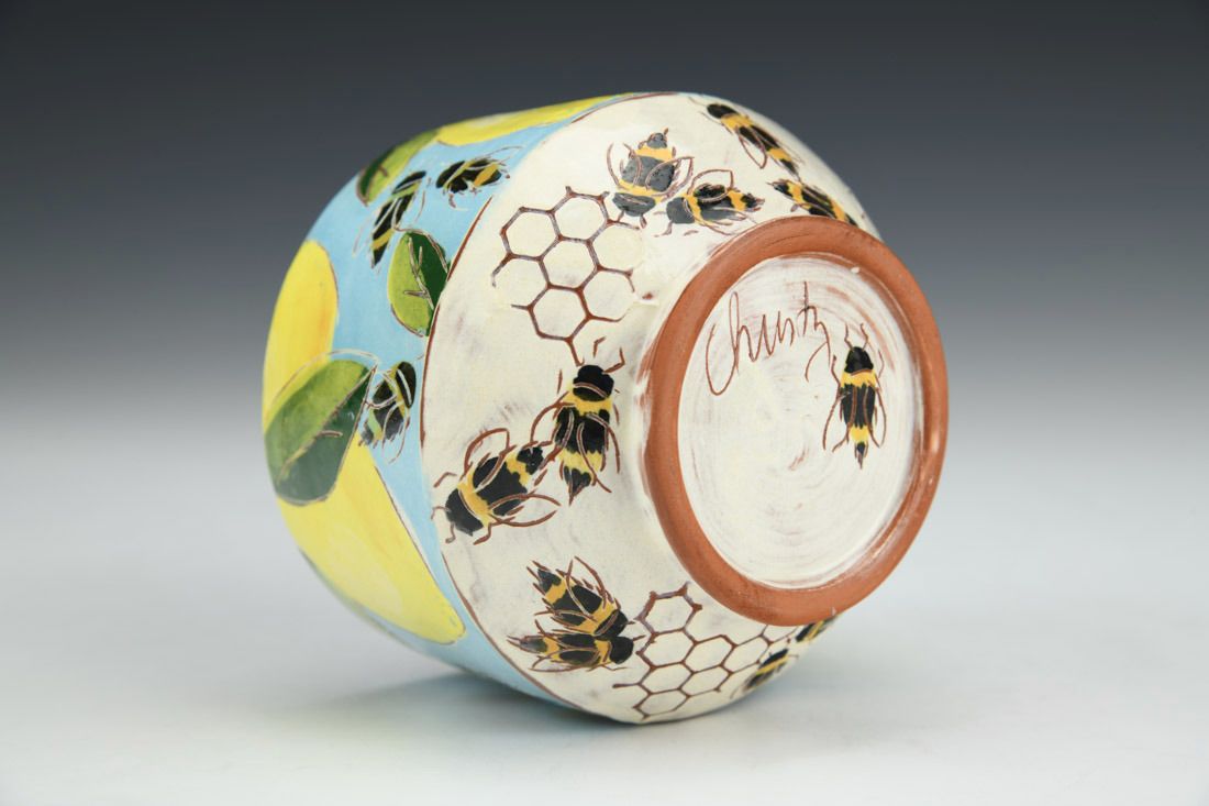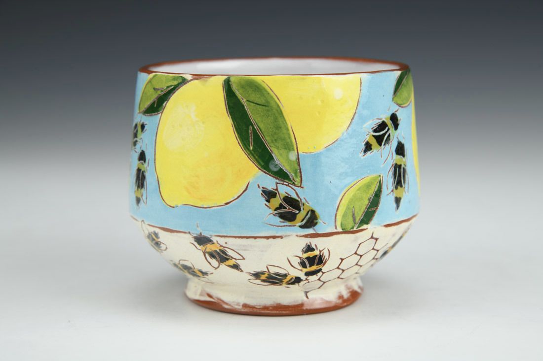 Earthenware, wheel thrown and altered, slip, underglazes, glaze, cone 04 electric fired, 2.75 x 3.5 x 3.5 inches.