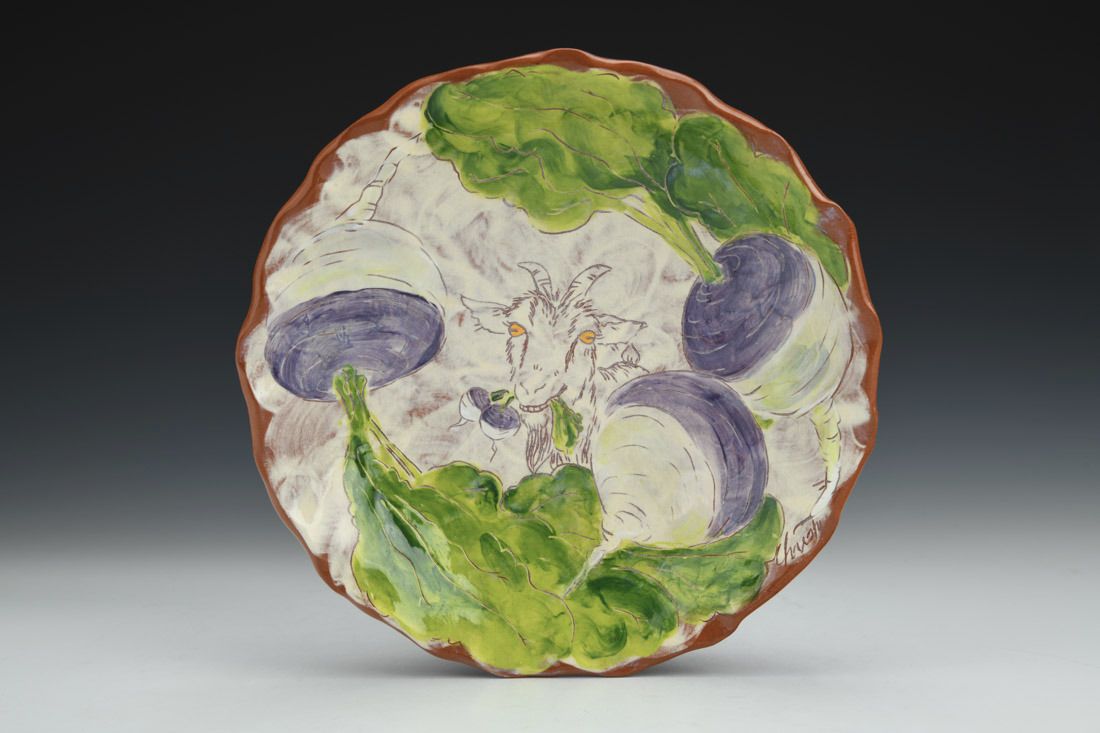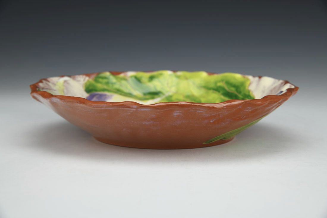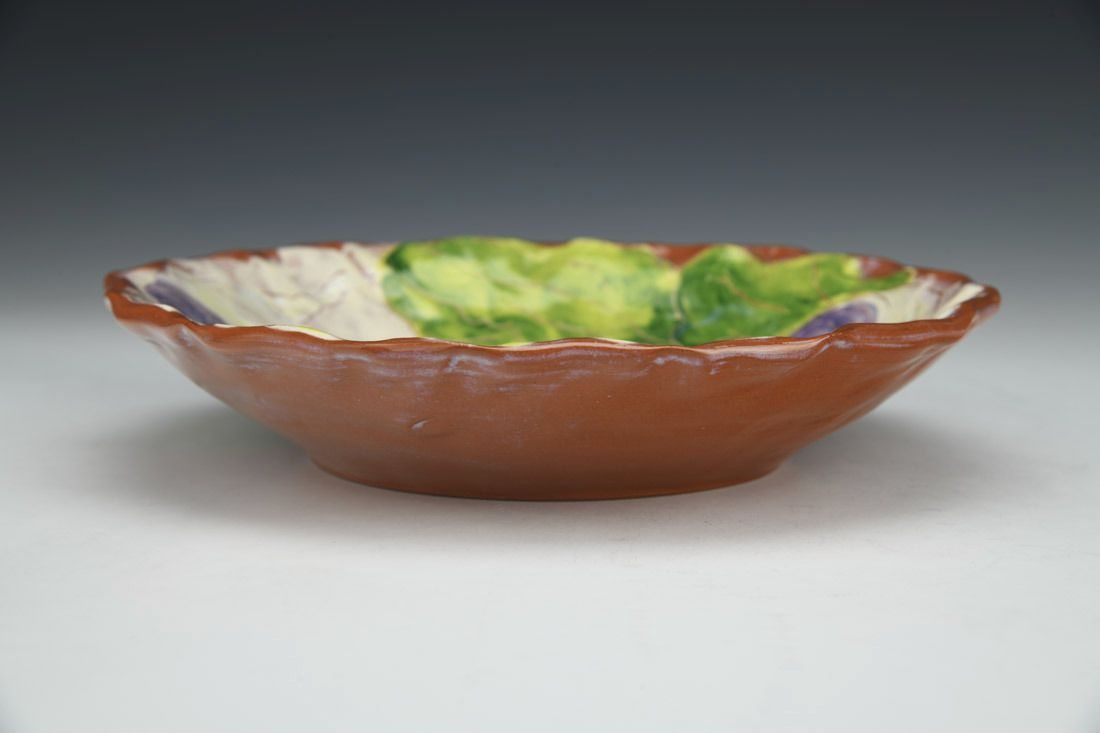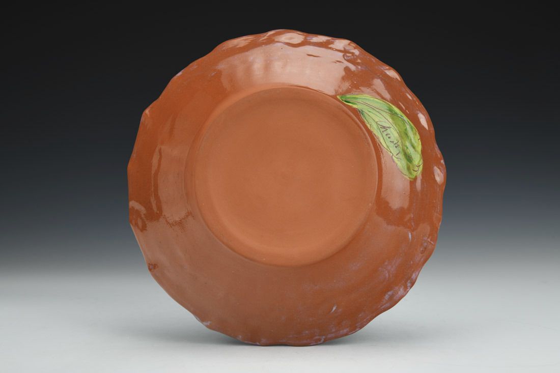 Earthenware, wheel thrown and altered, slip, underglazes, glaze, cone 04 electric fired, 1.75 x 7.75 x 7.75 inches.