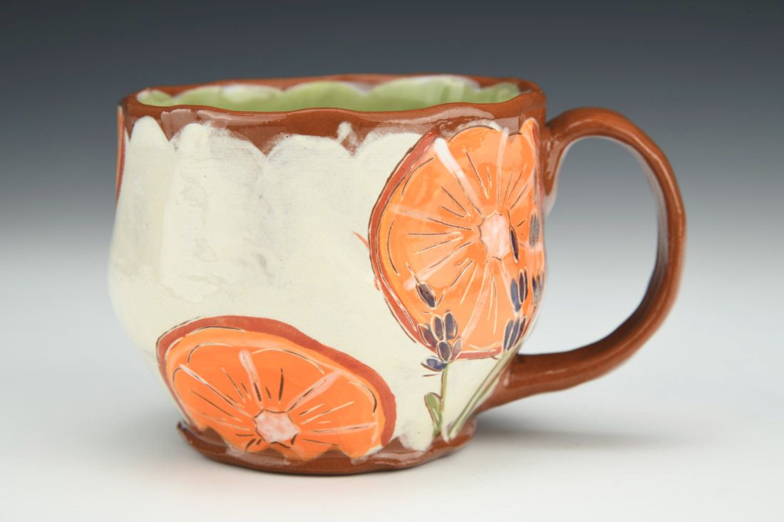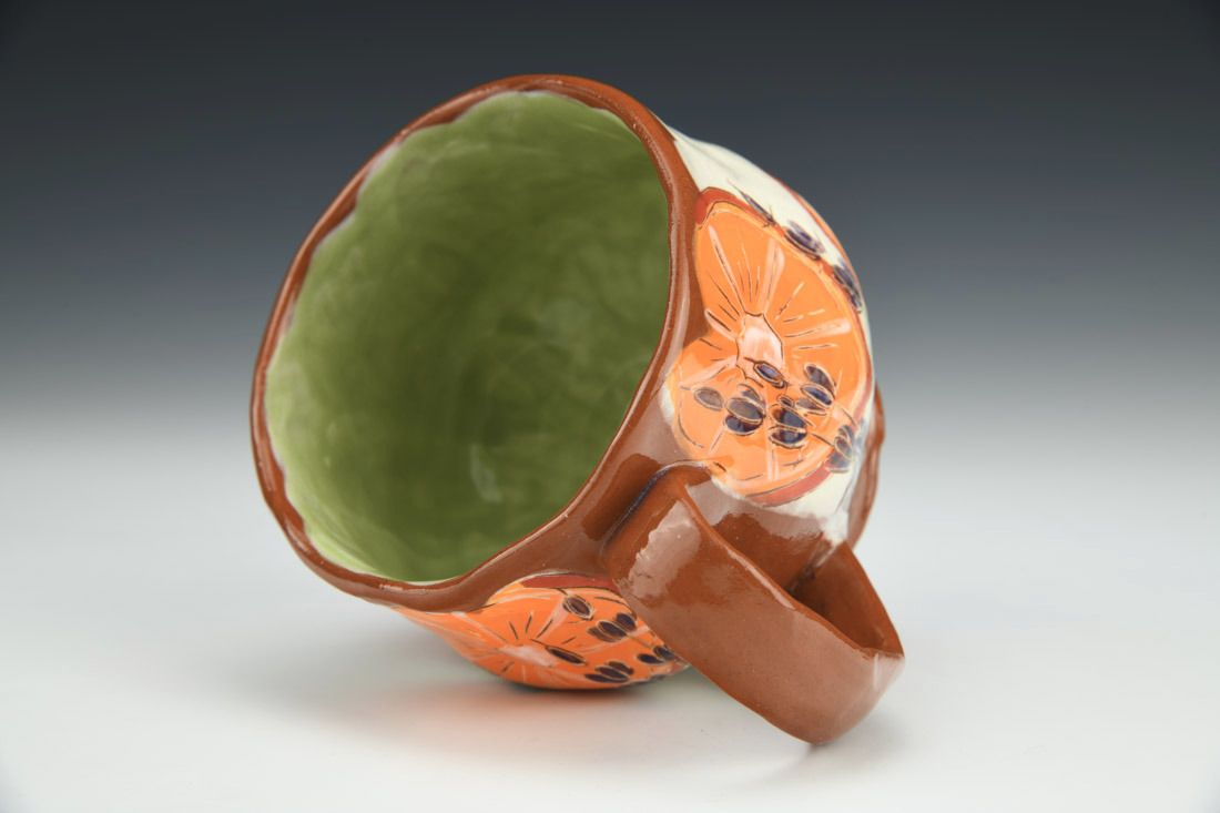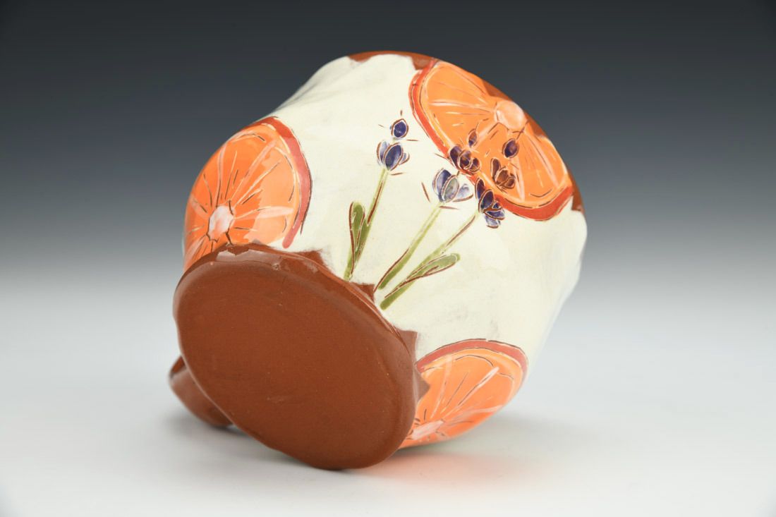 Red earthenware, wheel thrown and altered, slip, underglaze, glaze, cone 04 electric fired, 3 x 4.75 x 3.75 inches.