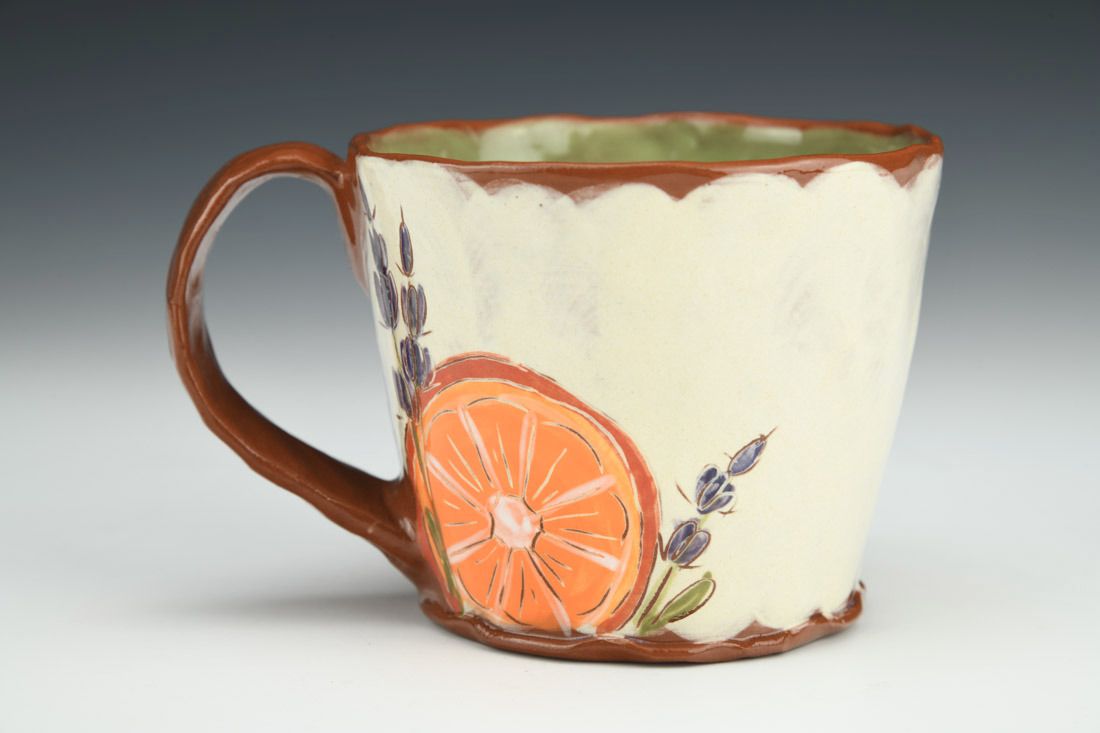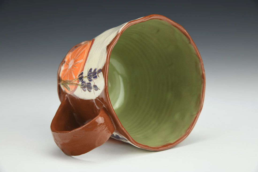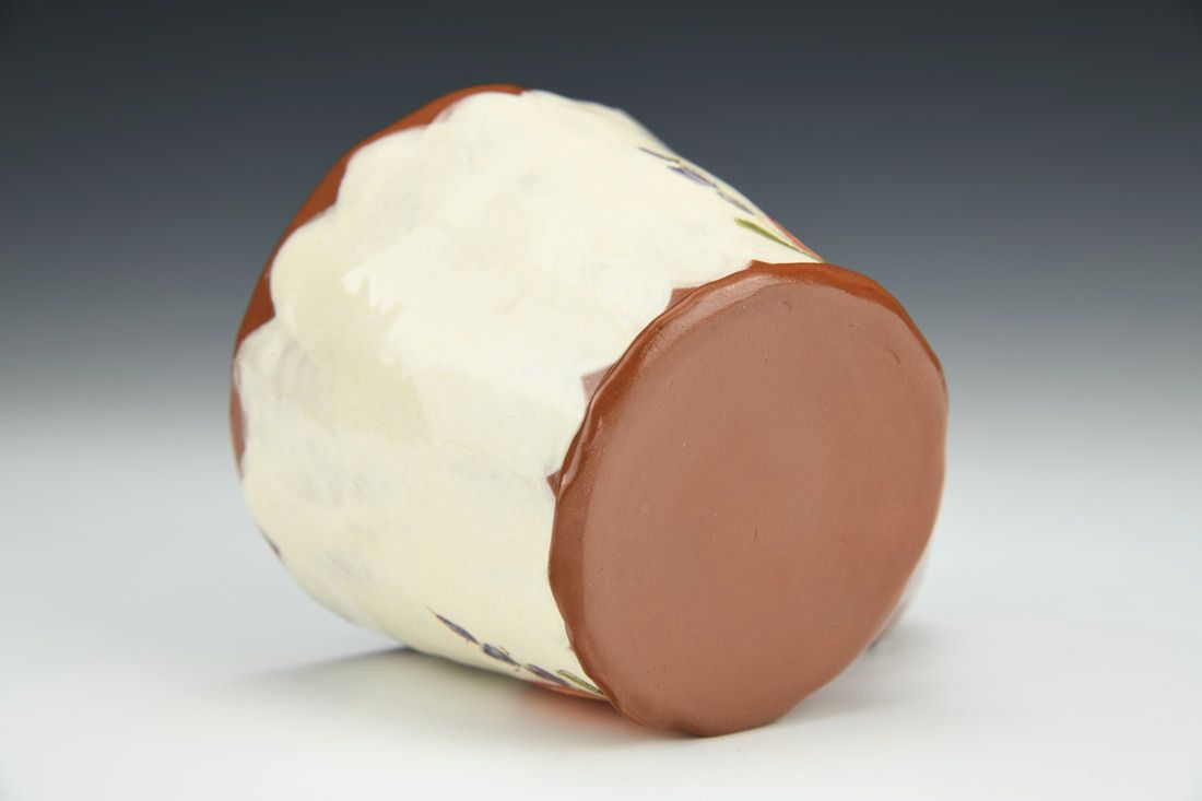 Red earthenware, wheel thrown and altered, slip, underglaze, glaze, cone 04 electric fired, 3 x 4.75 x 3.5 inches.